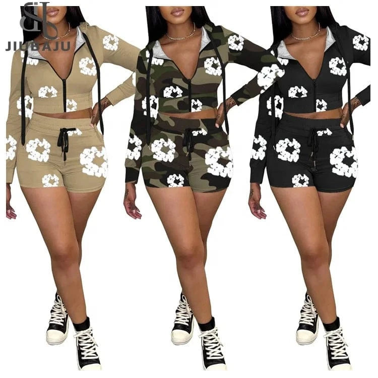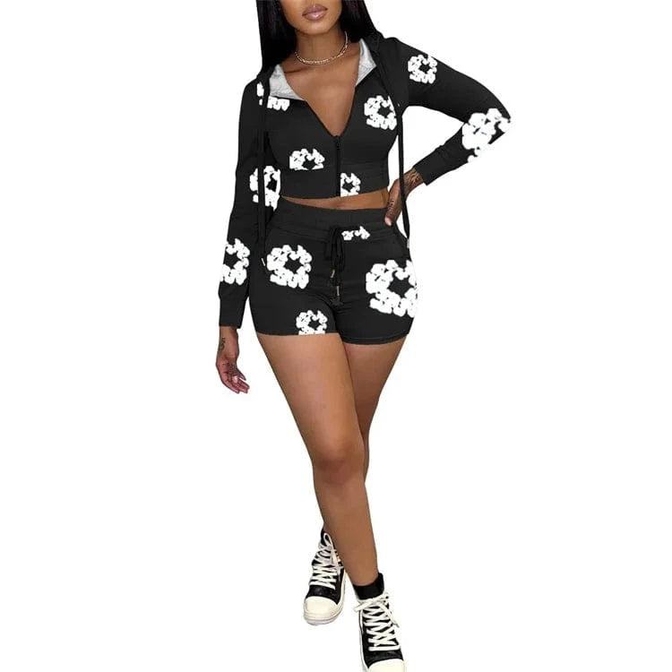 2 Pieces Set Sexy Fashion Women 2024 Summer Spring Female Tops Flower Printing Long Sleeve Hoodies And Elastic Waist Shorts Suit