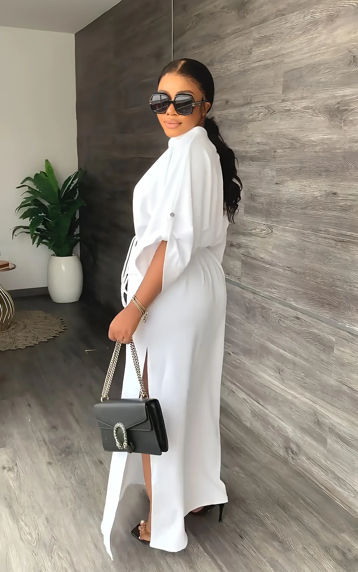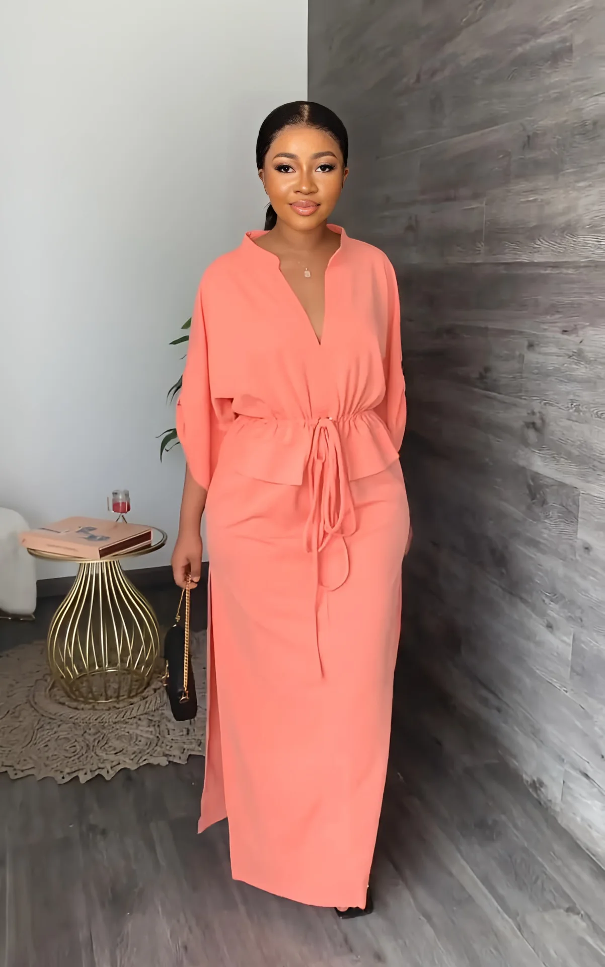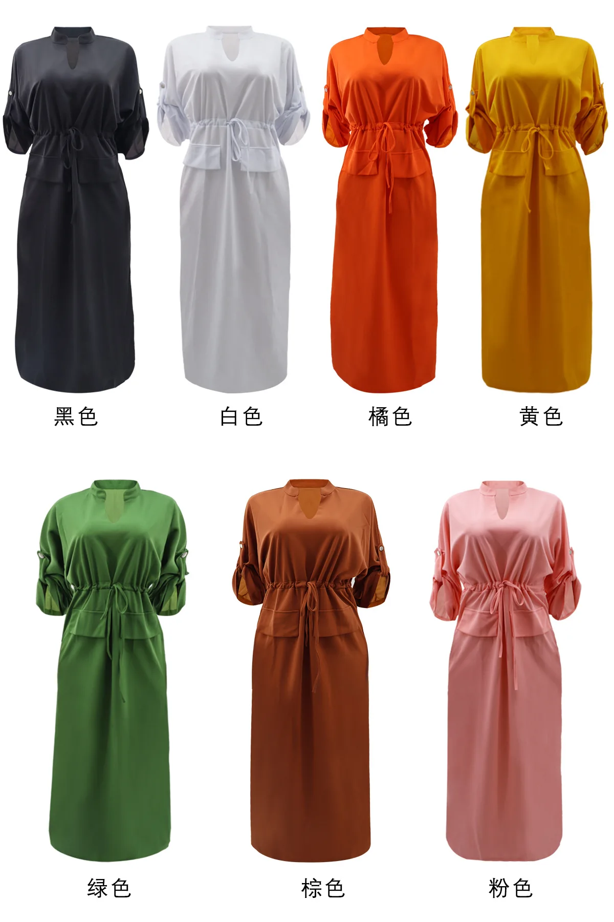 2023 Women Clothing Loose Waist Tucked Casual Tooling Skirt Side Slit Summer Short-sleeved V-neck Loose Women Dress