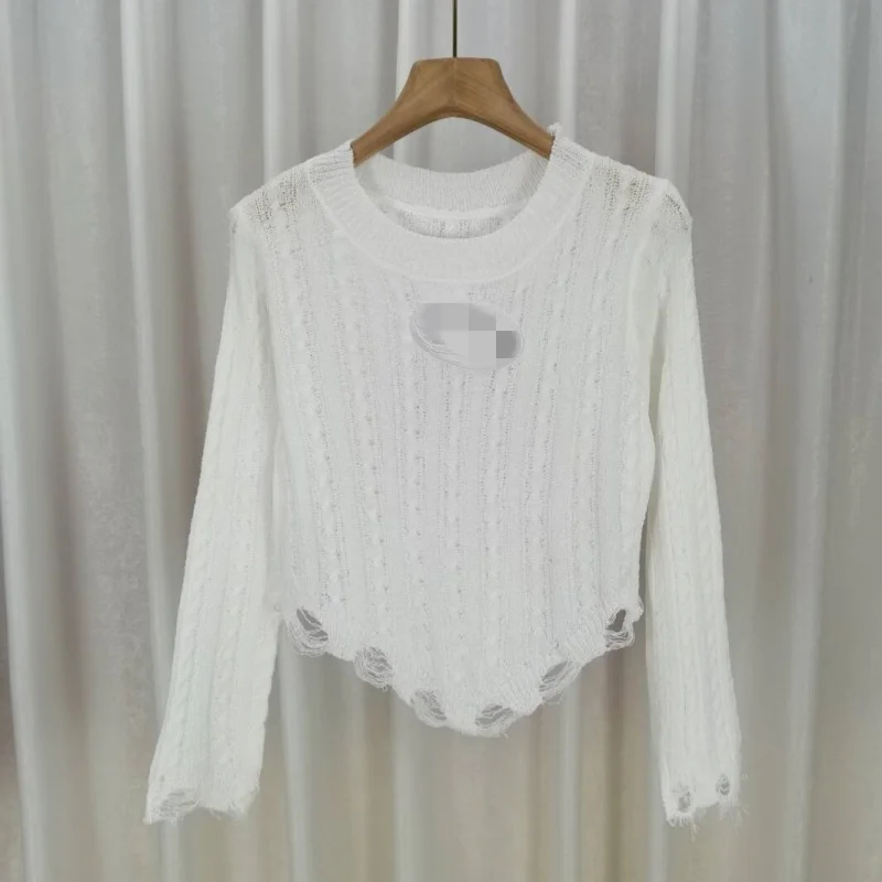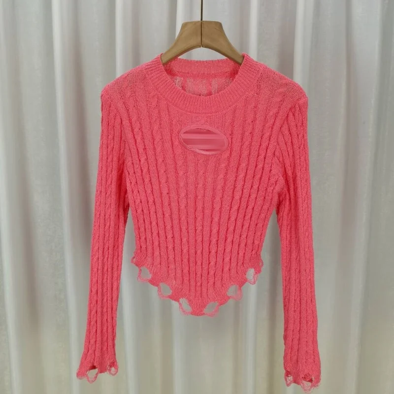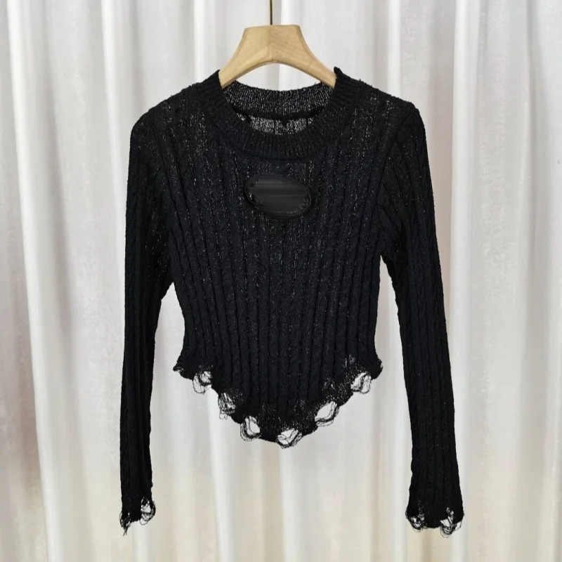 2024 Fashion Women Long Sleeve O-neck Solid Color Hollow Out Tassel Fringe Knitted Shirts Women's Clothing Top
