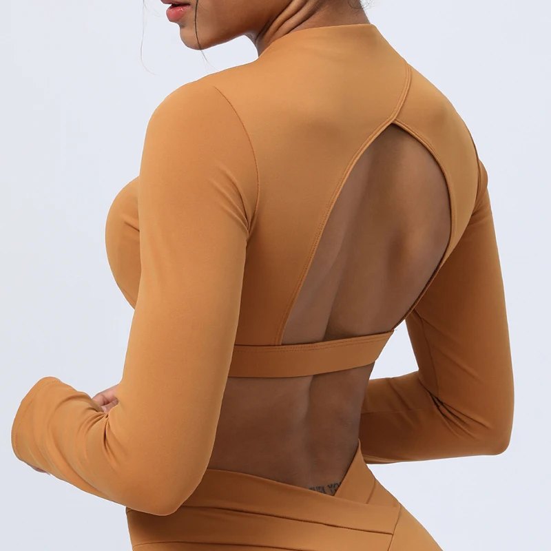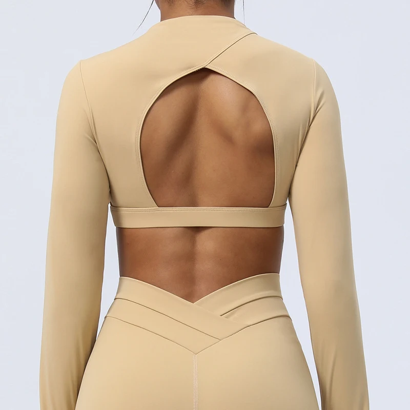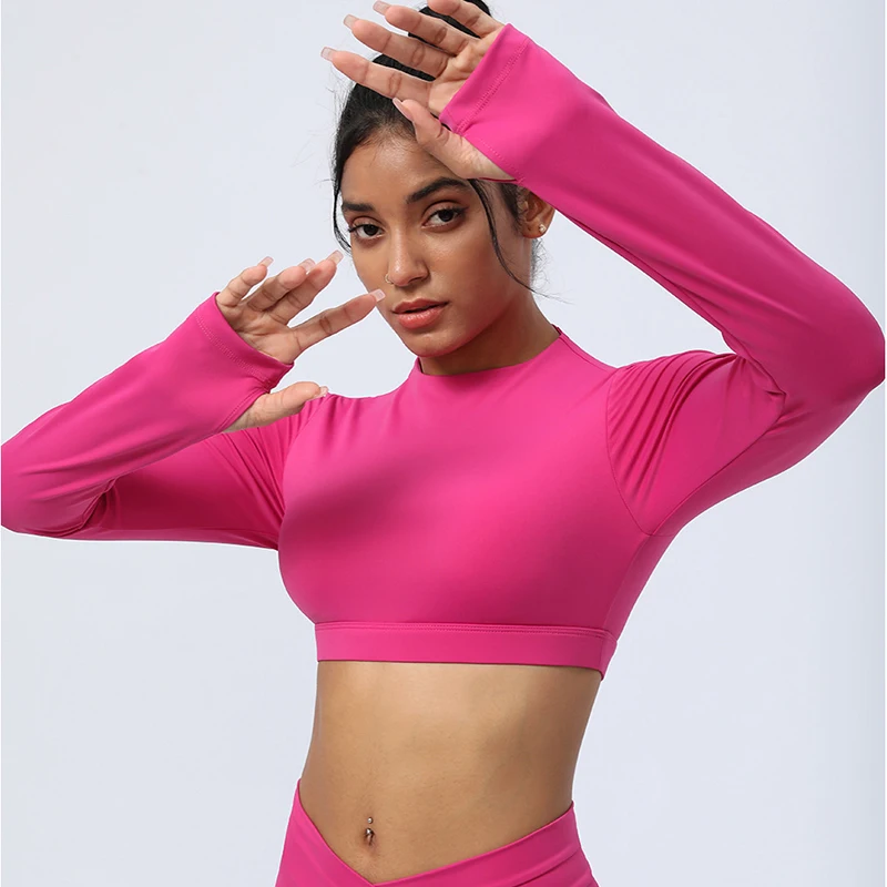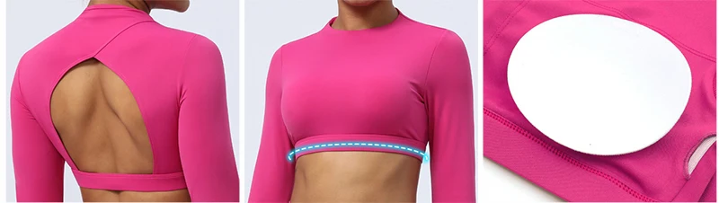 2024 New Women Long Sleeve Removable Pad Back Hollow Out Crop Top Stretch Workout Clothes Quick Dry Gym Wear Shirt For Women