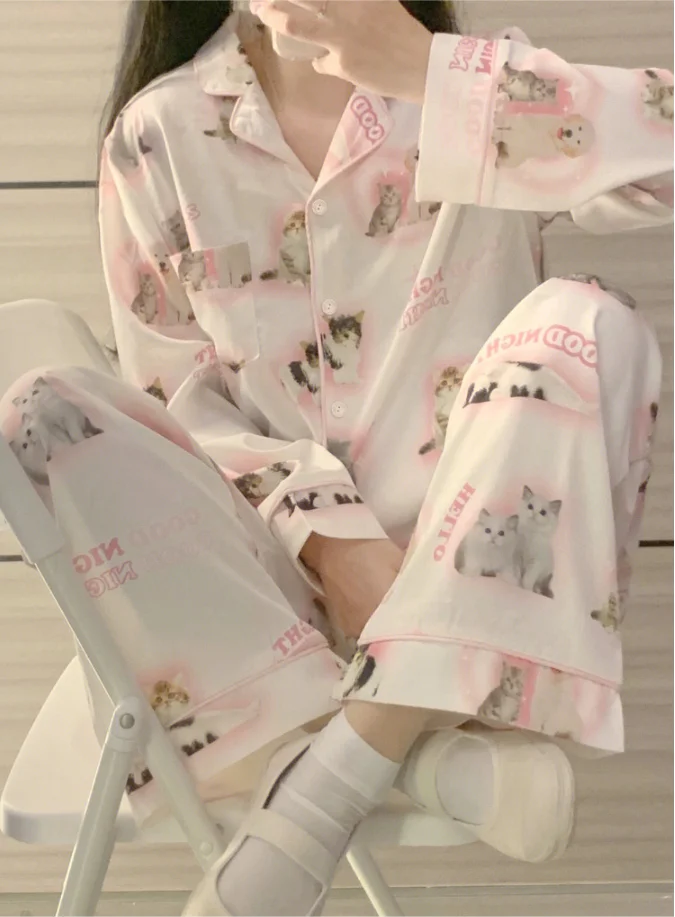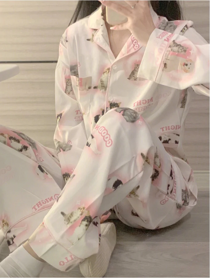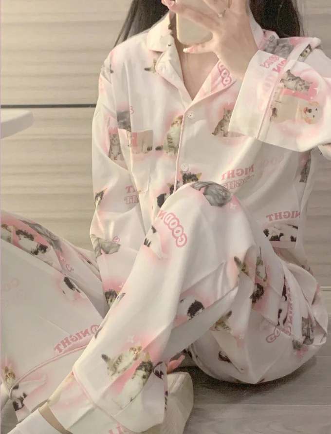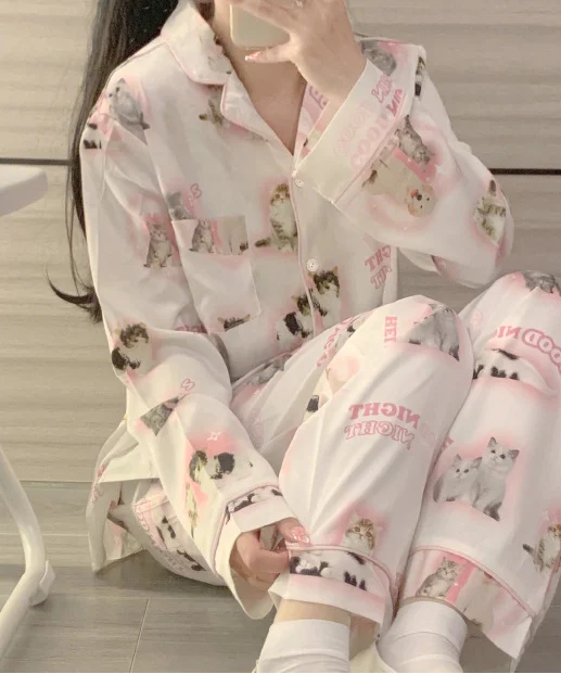 2024 Quick Dry Big Size Pink Solid Silk Like Pajamas Girl Long Sleeve Sleepwear Cute Little Kitten Print Casual Home Clothing