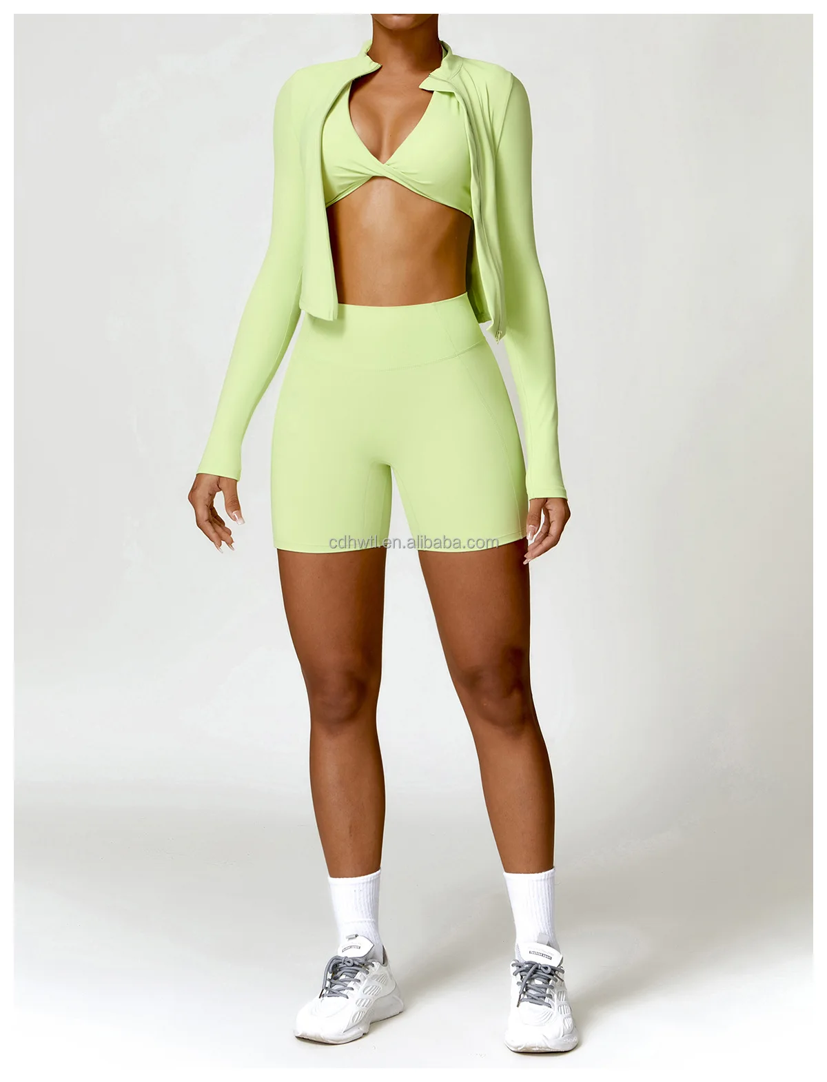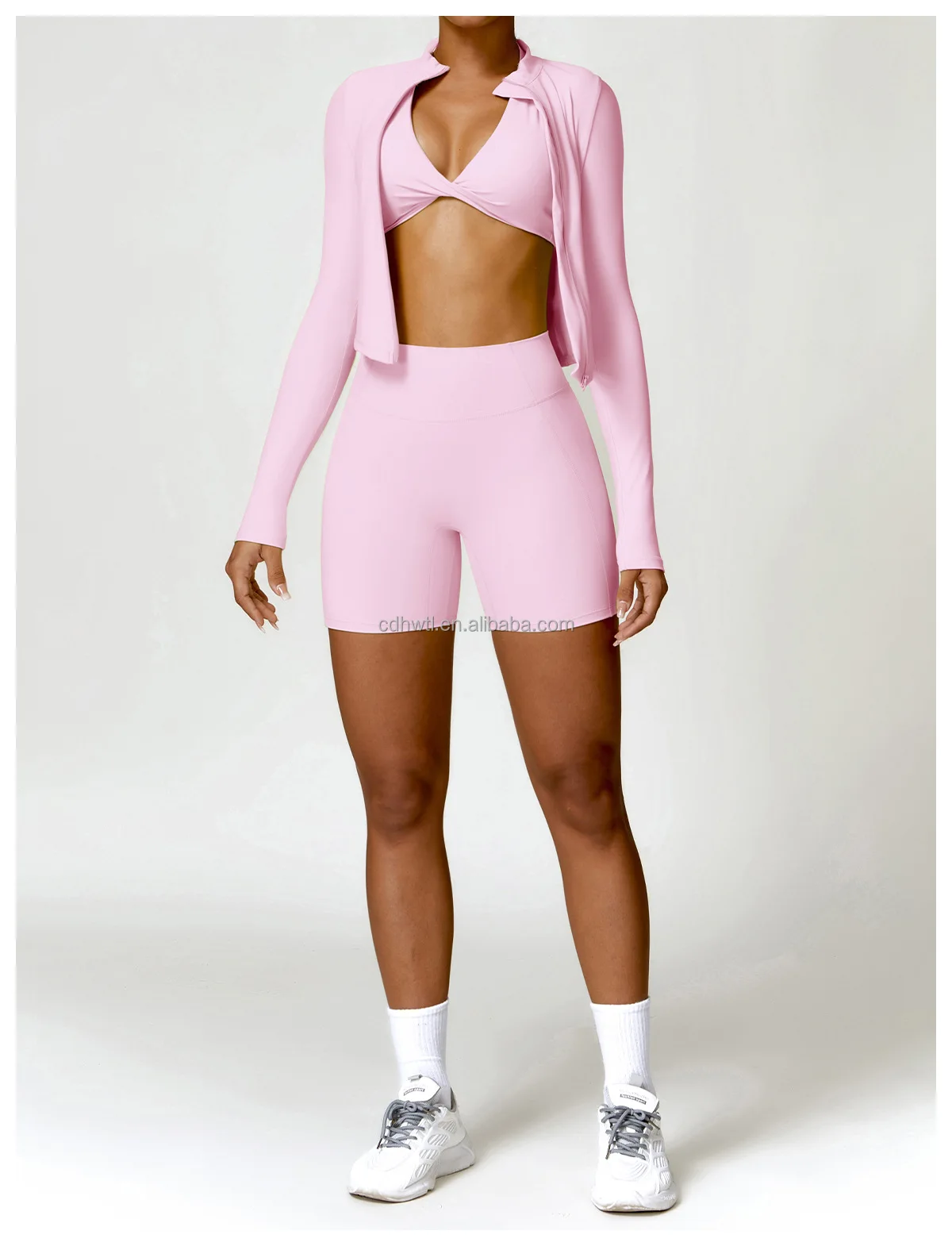 Sportswear Clothes Tracksuit Fitness Yoga Slim Running Zipper Jacket Gym Scrunch Butt Shorts bra leggings 4 Piece Workout Sets