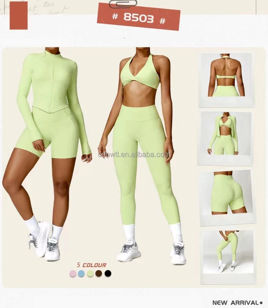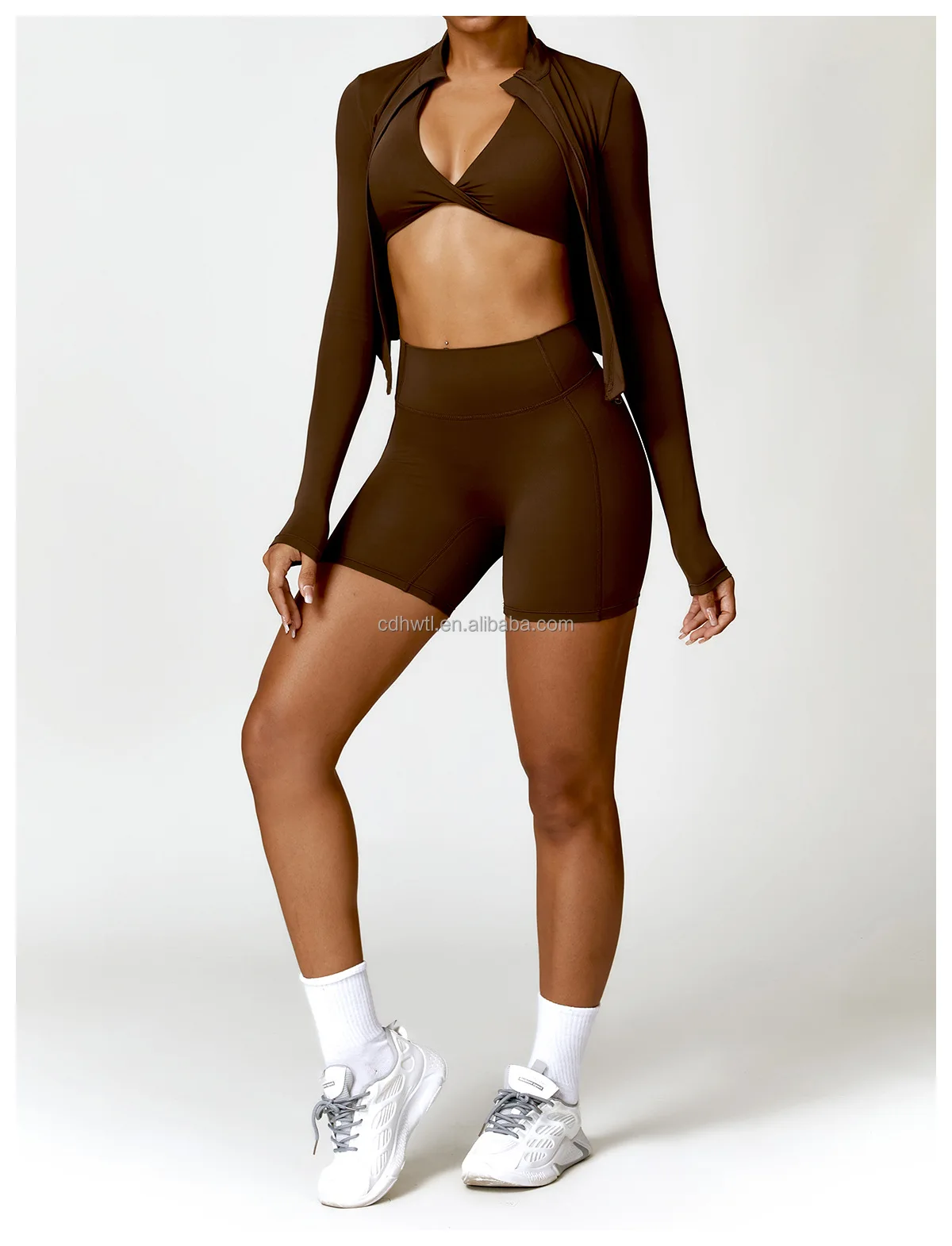 2024 Sportswear Tracksuit Yoga Slim Running Zipper Jacket Gym Scrunch Butt Shorts bra leggings 4 Piece Workout fitness Gym Sets