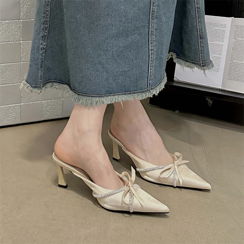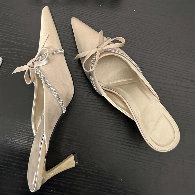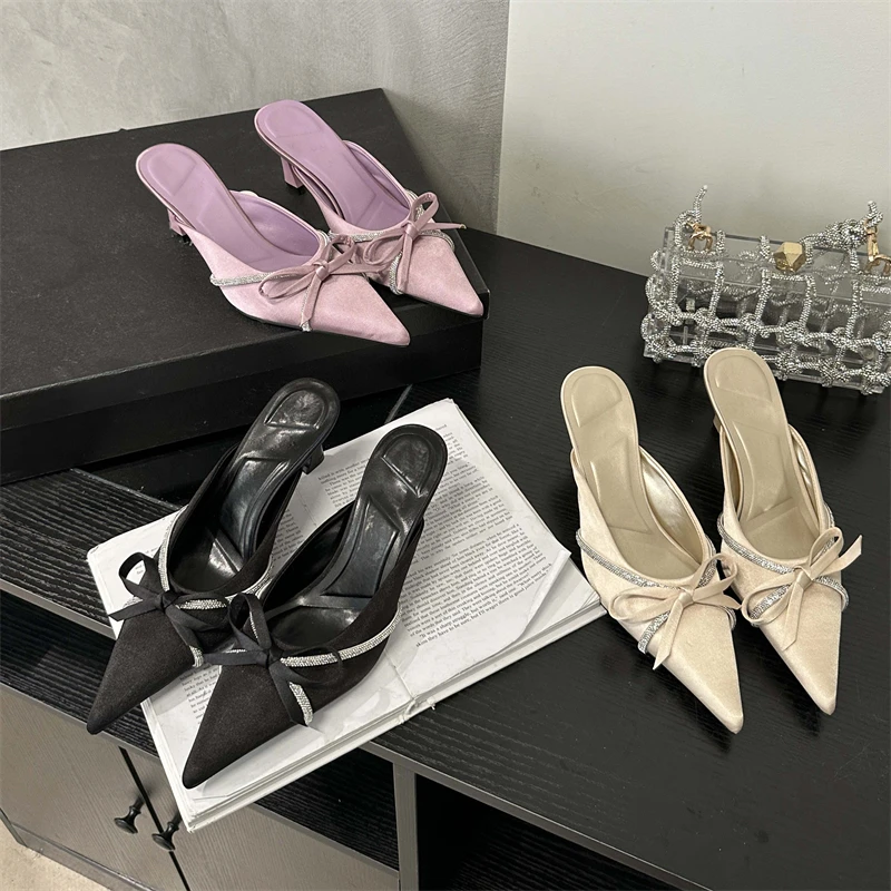 Aneikeh Party Bling Slip-On Butterfly-Knot Sweet Solid Flock Slingback Women Shoes Pointed Toe Leisure Shallow Shoes Fashion