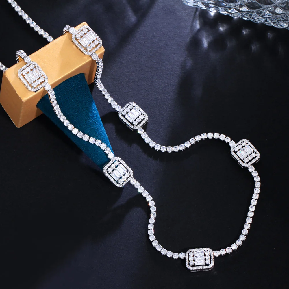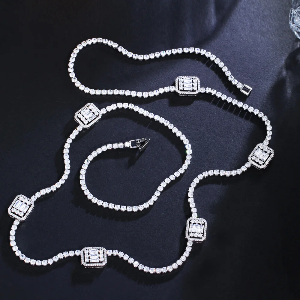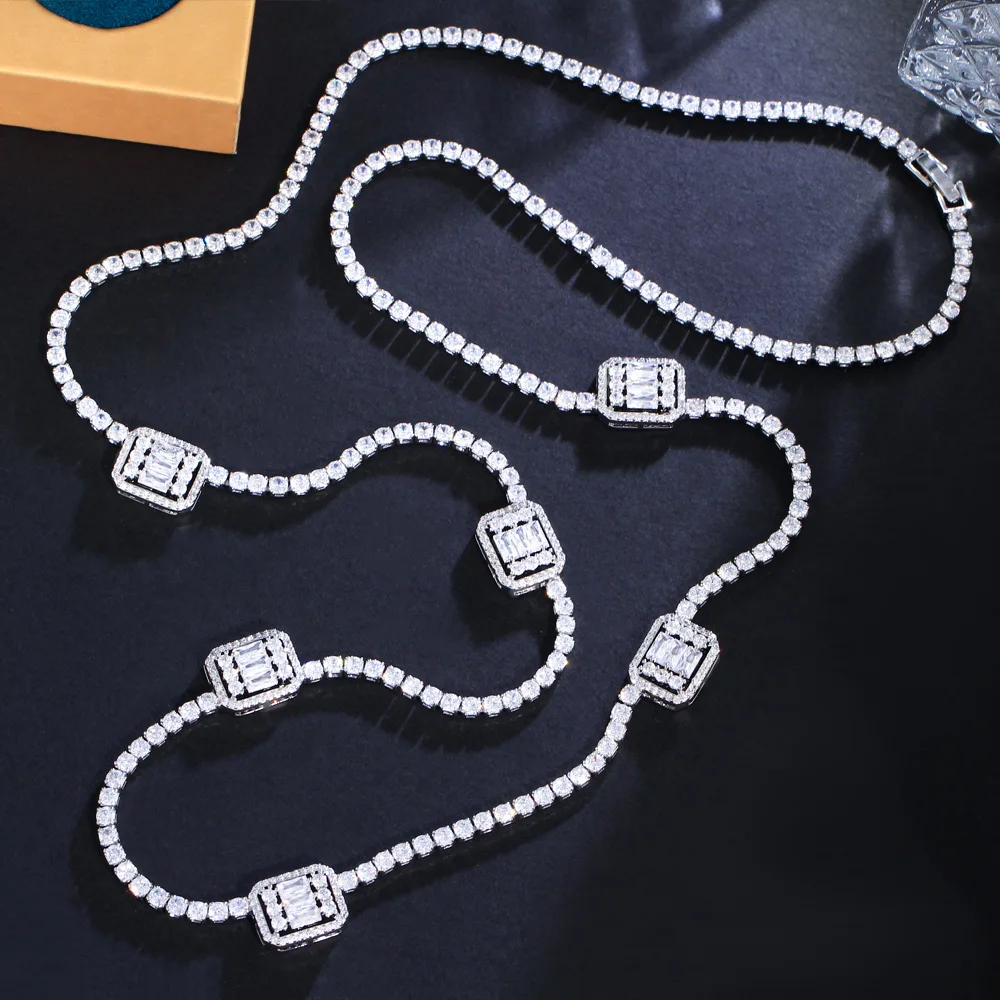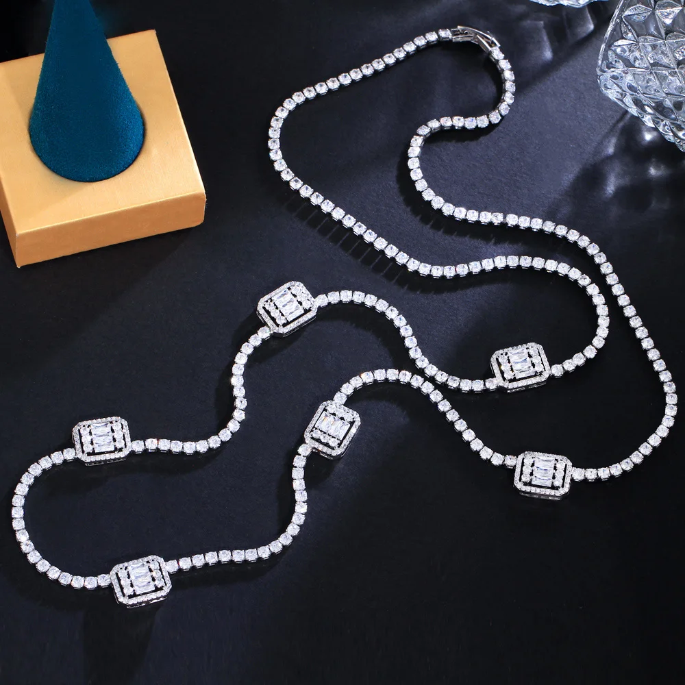 Bling Baguette White CZ Cubic Zircon Pave Silver Color Women Long Sweater Chain Necklace Dubai Bridal Prom Jewelry Accessories