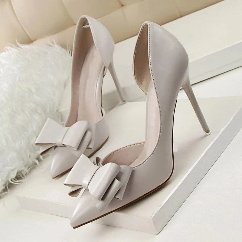 BUSY GIRL DS2161 White stiletto heel pointed toe high heels pumps dress shoes wtih bow bridal d'orsay pump shoes for women