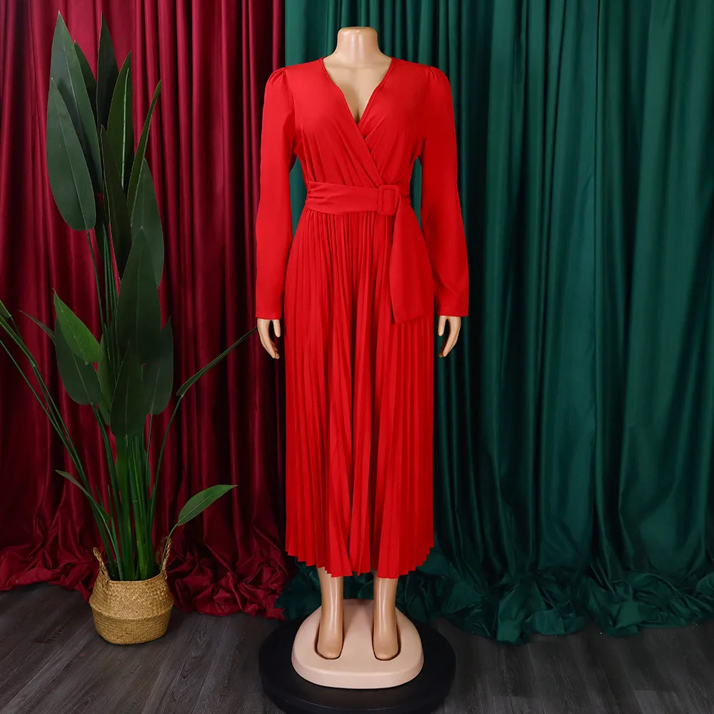 C8557 Latest Design Women's Casual Dresses V-neck Waist Strap A-line Pleated Dresses Women Lady Elegant Office Dress With Belt