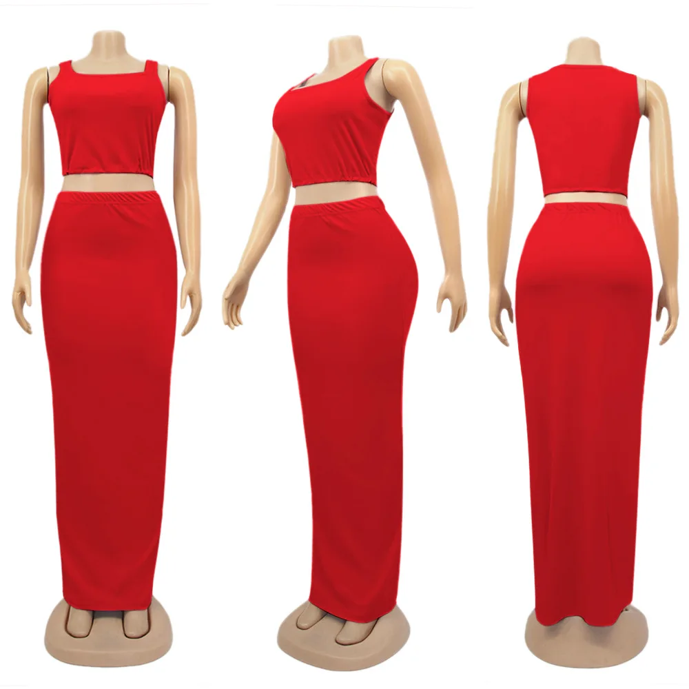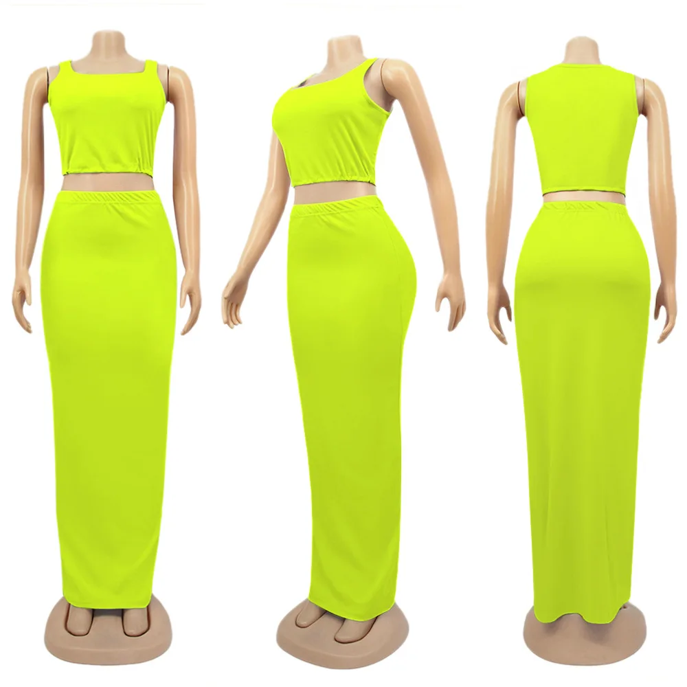 CM.YAYA Women Set Solid Sleeveless Strap Square Collar Crop Tops Stretchy Long Skirts Two Piece Set Sexy Fashion Outfits Summer
