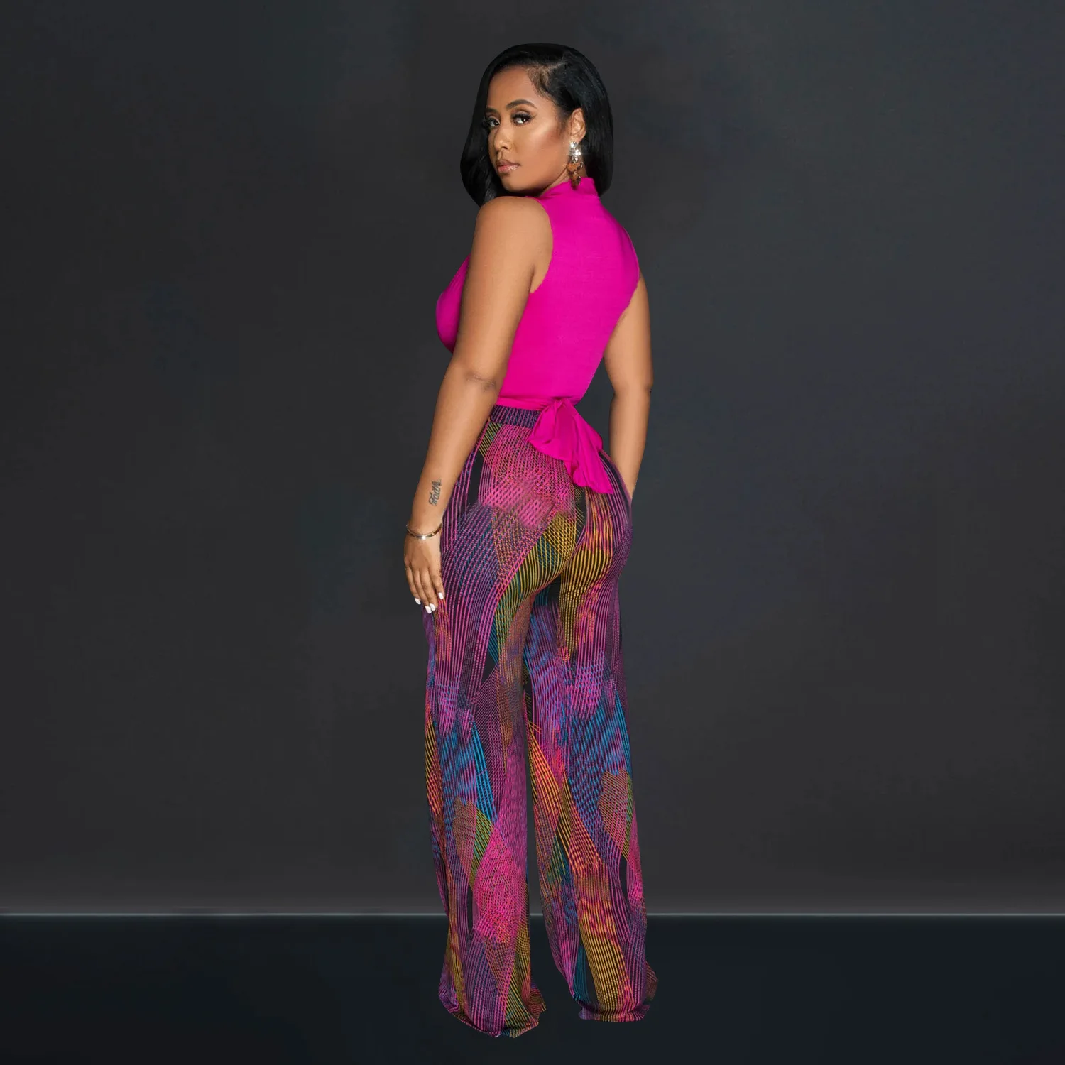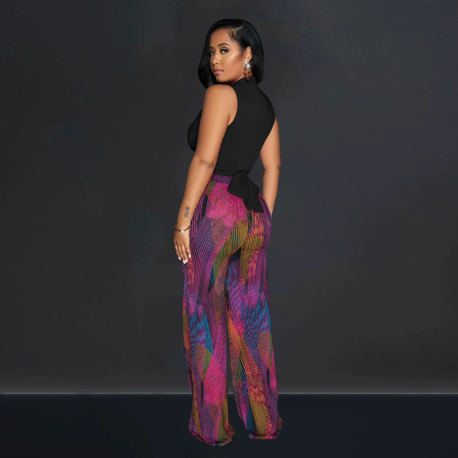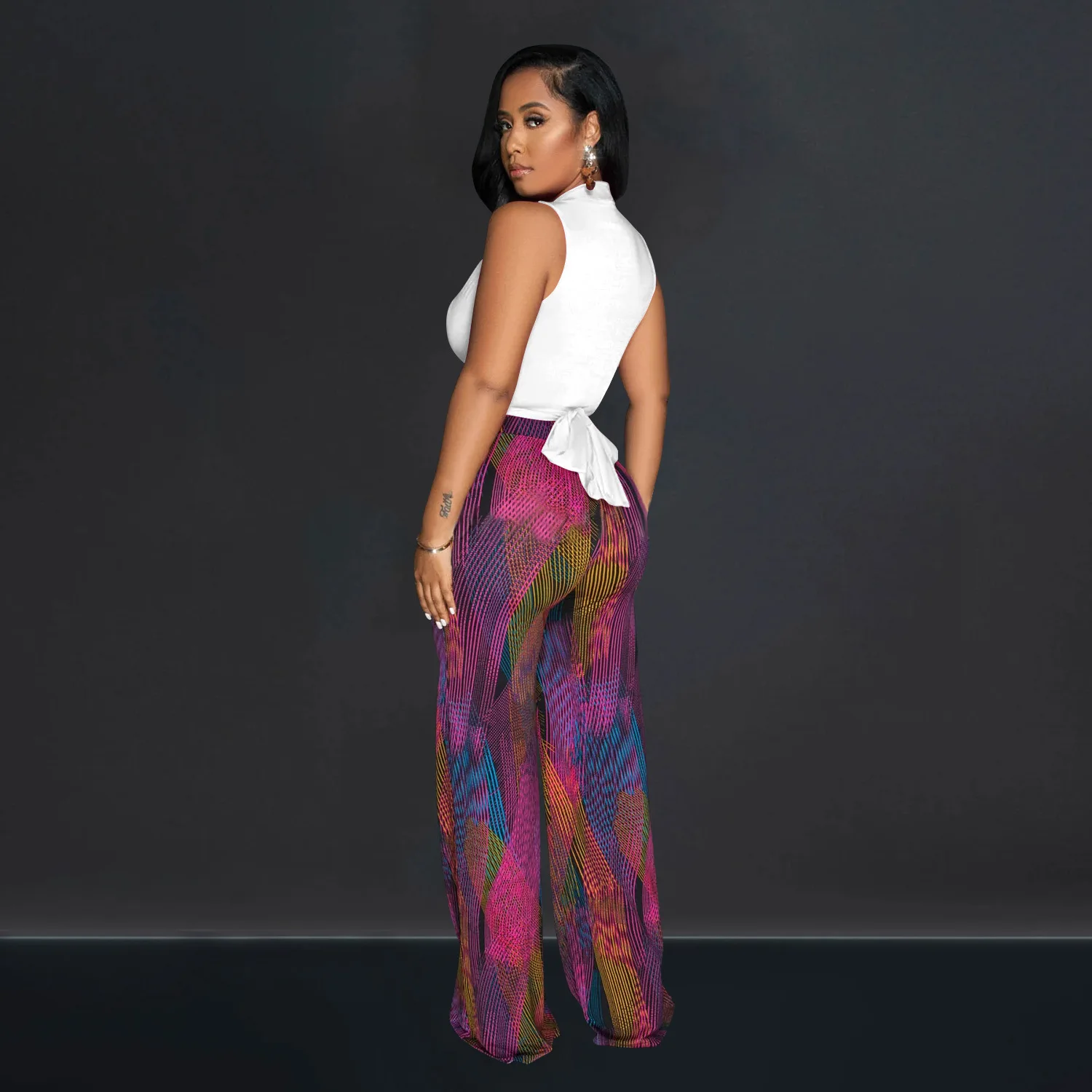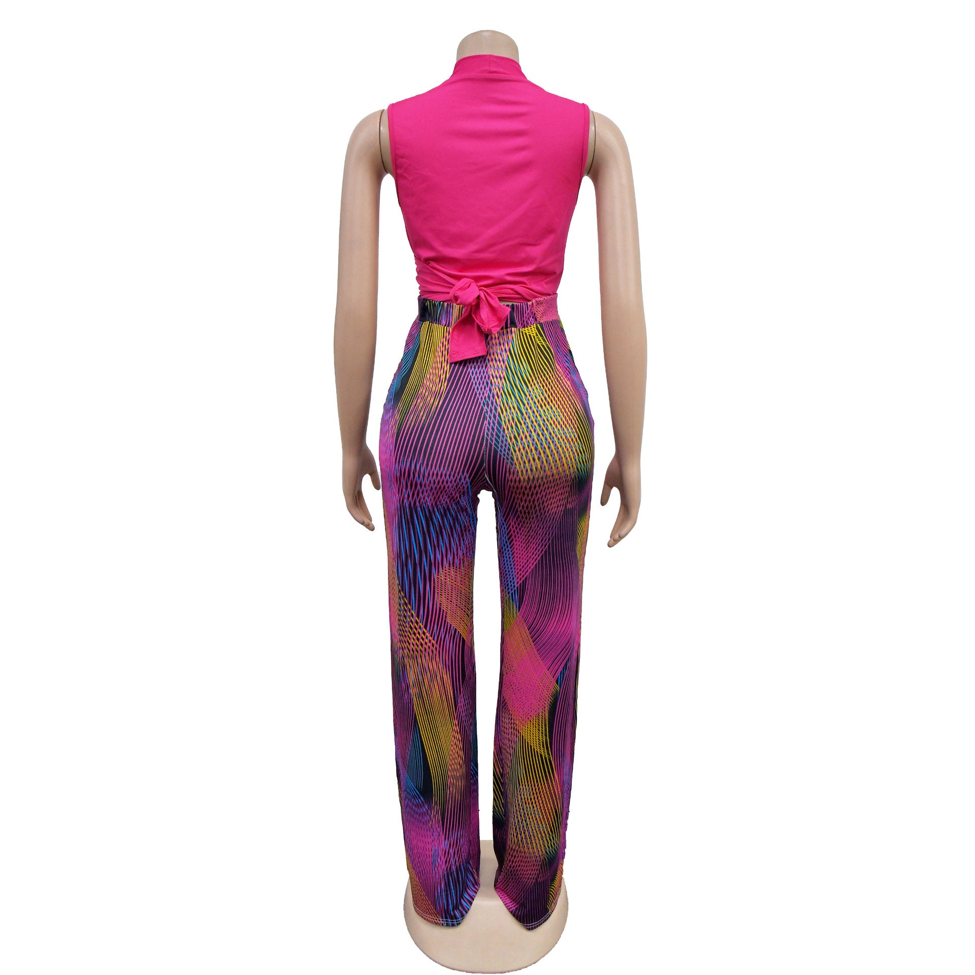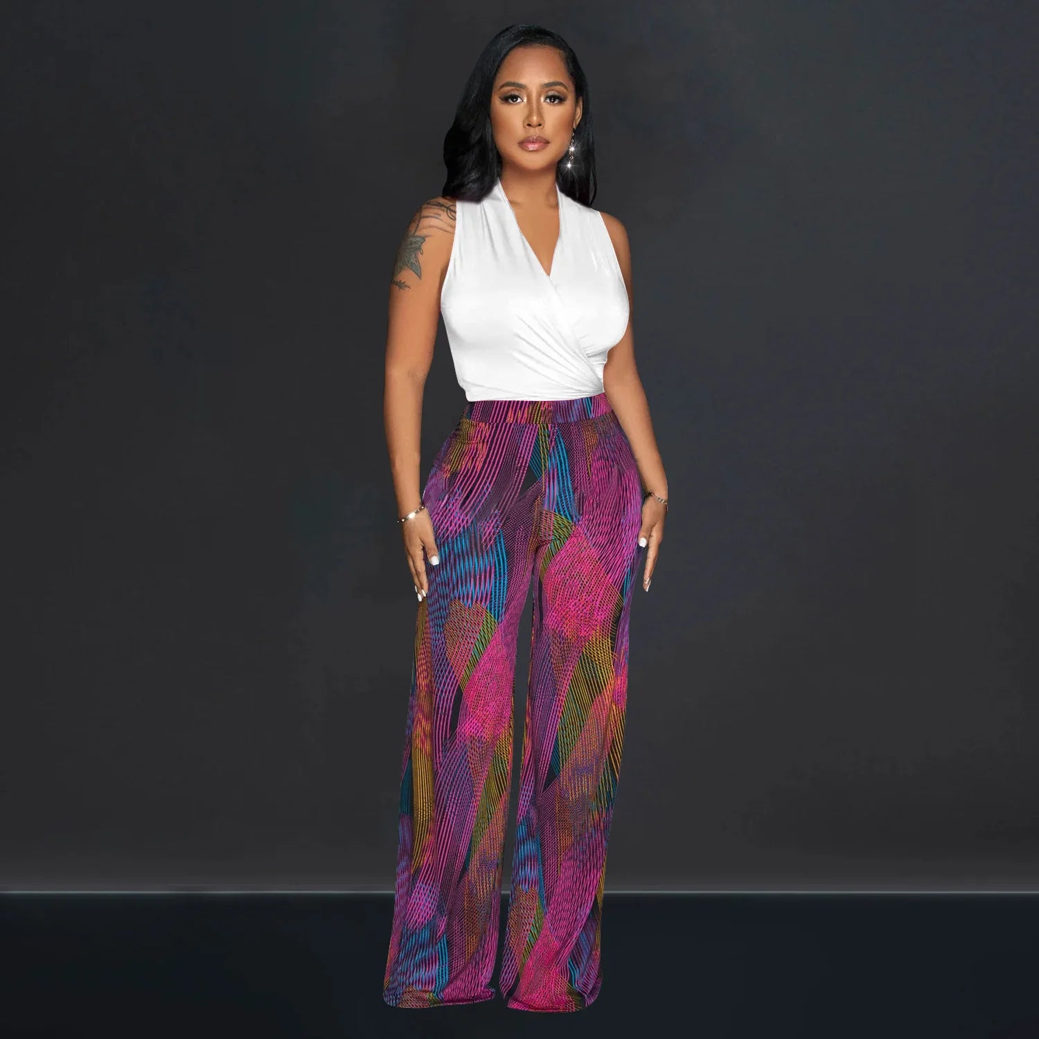 CM.YAYA Women's Set Wrap V-neck Tie Up Tank Top and Galaxy Striped Wide Leg Pants 2023 Street Two 2 Piece Sets Outfits Tracksuit