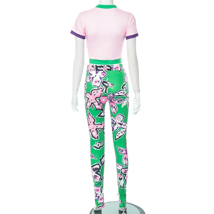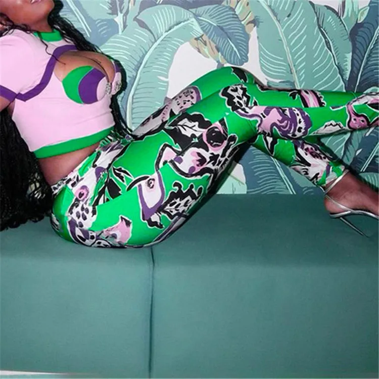 Colours Graphic Print Bodycon 2 Two Piece Set Casual Vacation Clothing For Woman 2024 Fashion Crop Top Pants Set