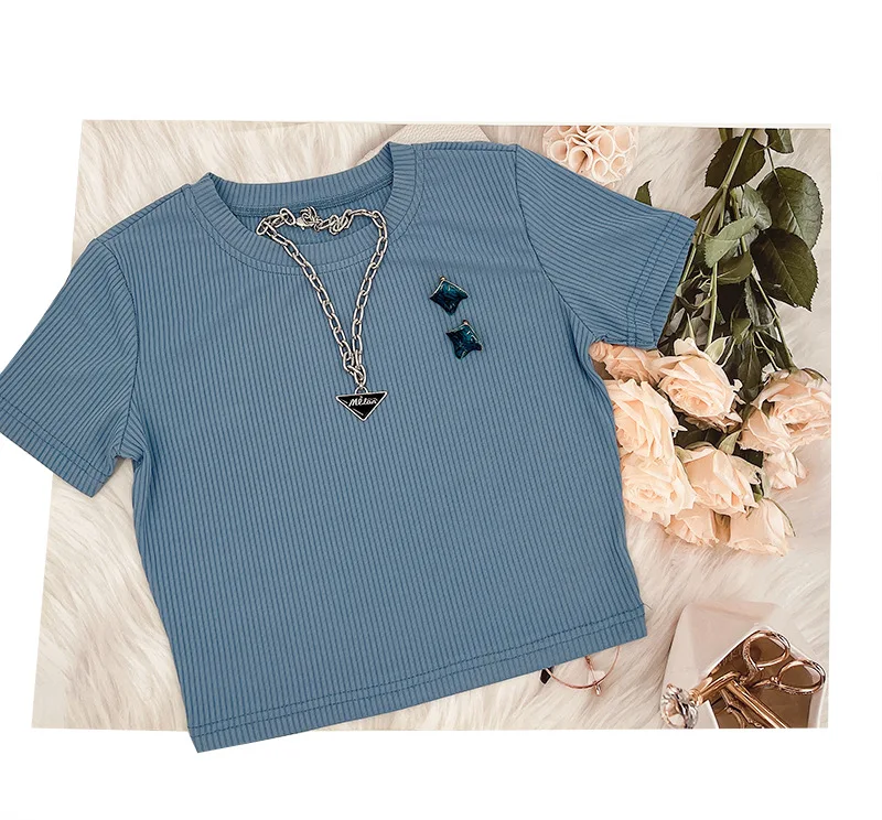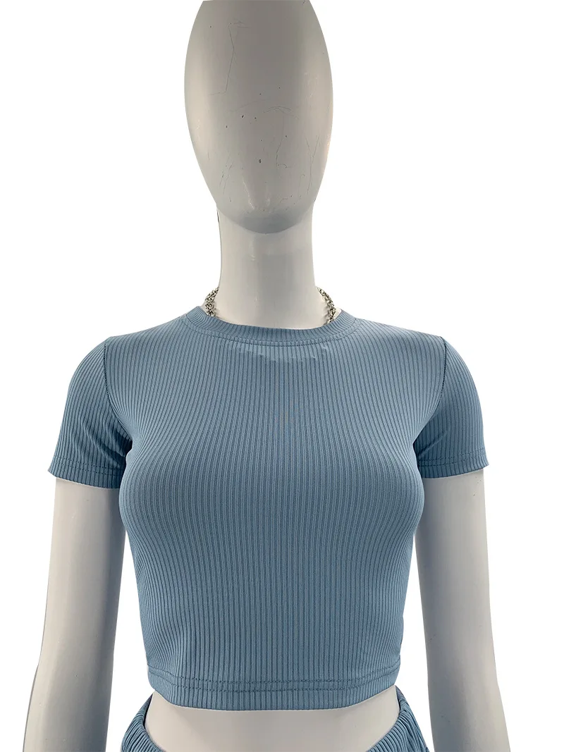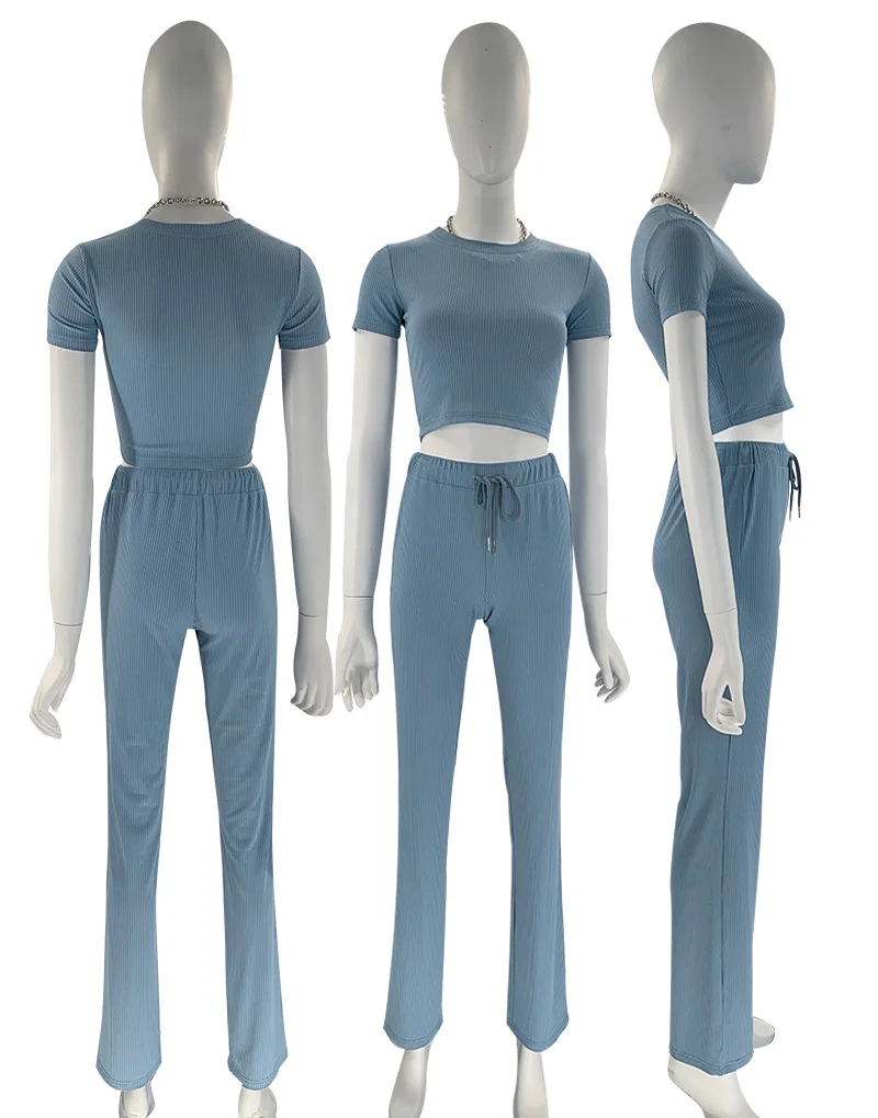 Custom logo Rib knitted Solid color elastic Crop top t shirt and pant two piece set for women clothing