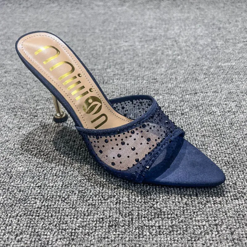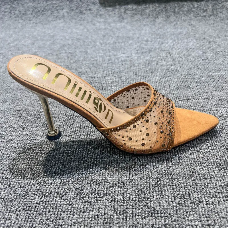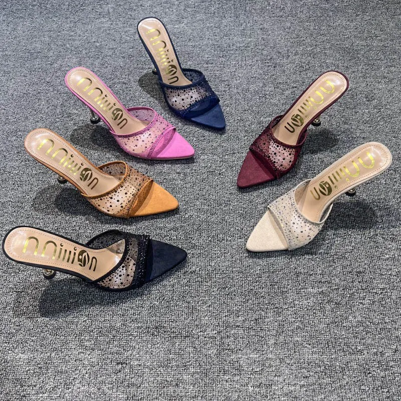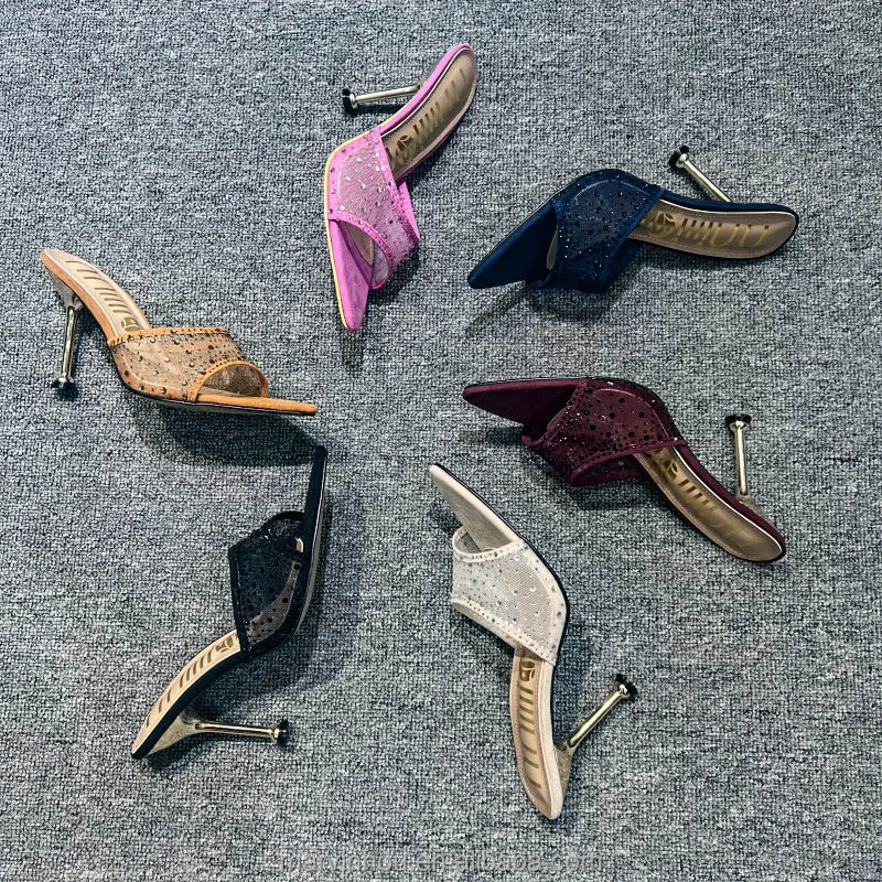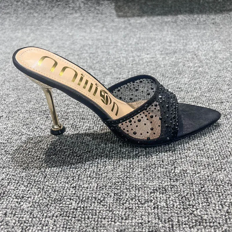 Dropshipping Custom Logo Mesh Rhinestone Sexy Stiletto Heeled Sandals Pointed Toe High Heels Slippers for Women