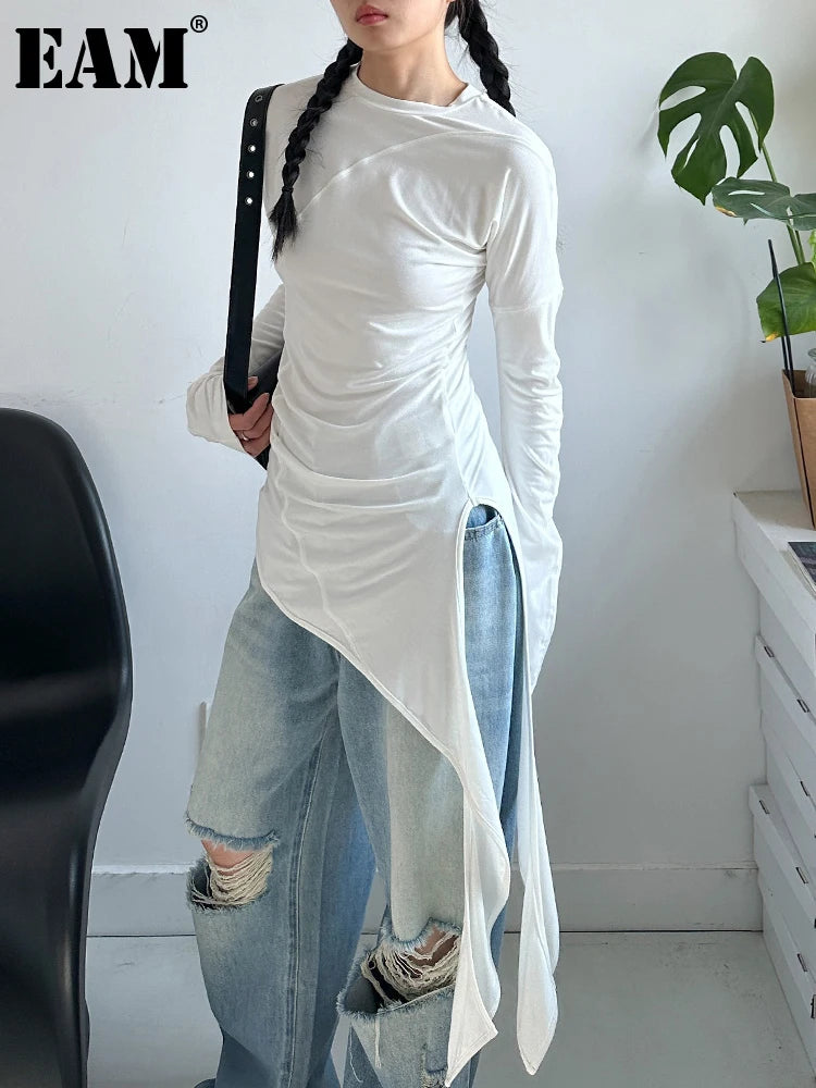 [EAM] Women White Irregular Hem Elegant Long Slim T-shirt New Round Neck Long Sleeve Fashion Tide Spring Autumn 2025 1DJ0097