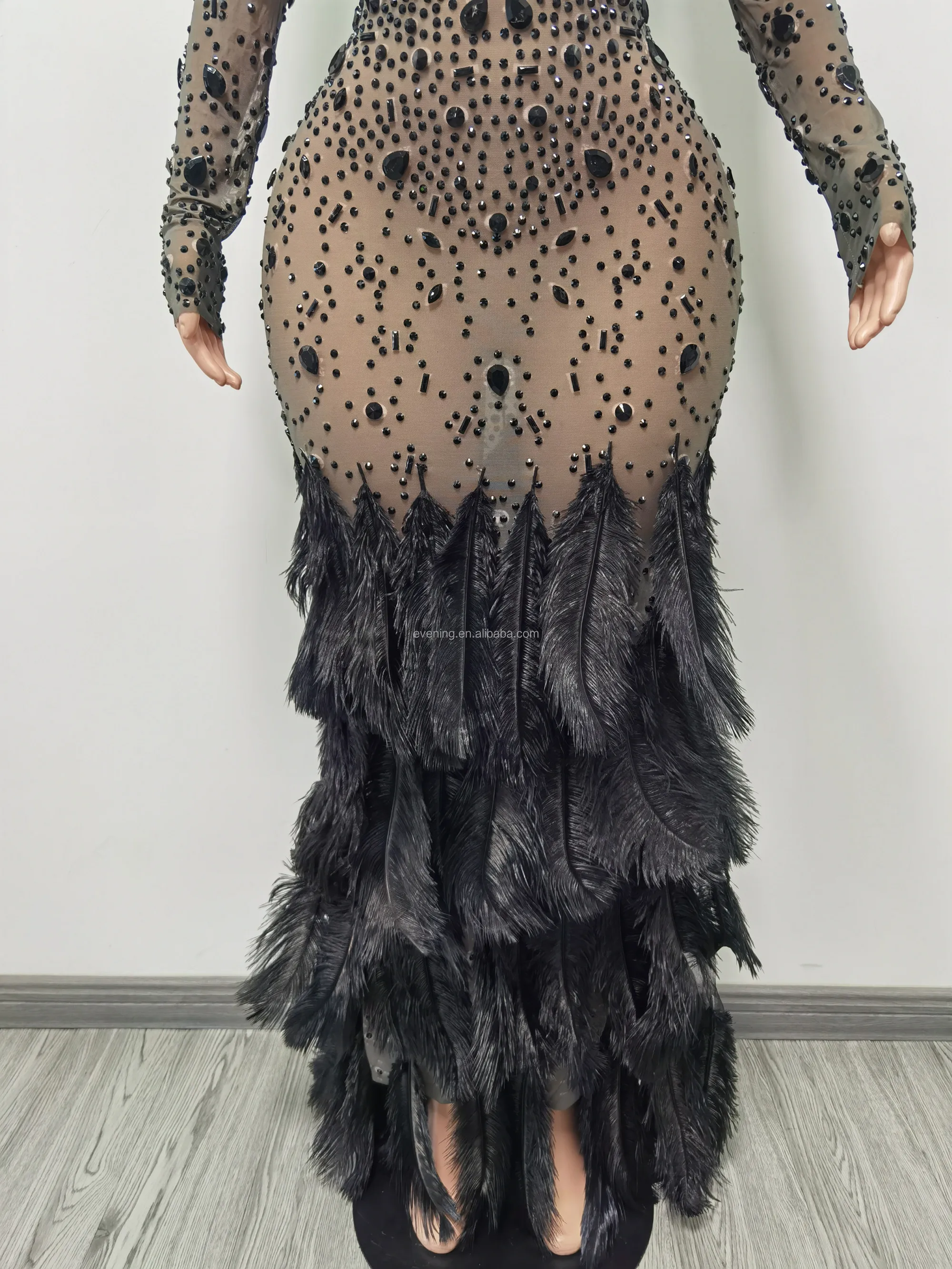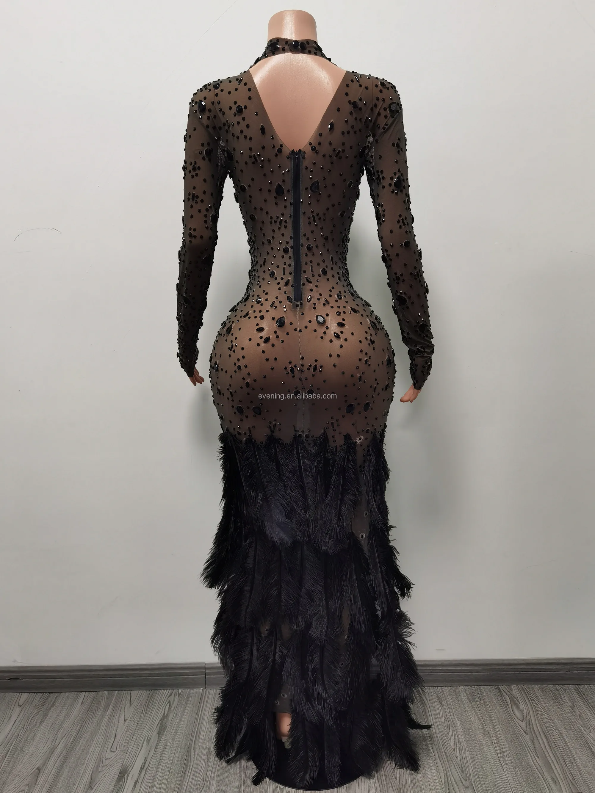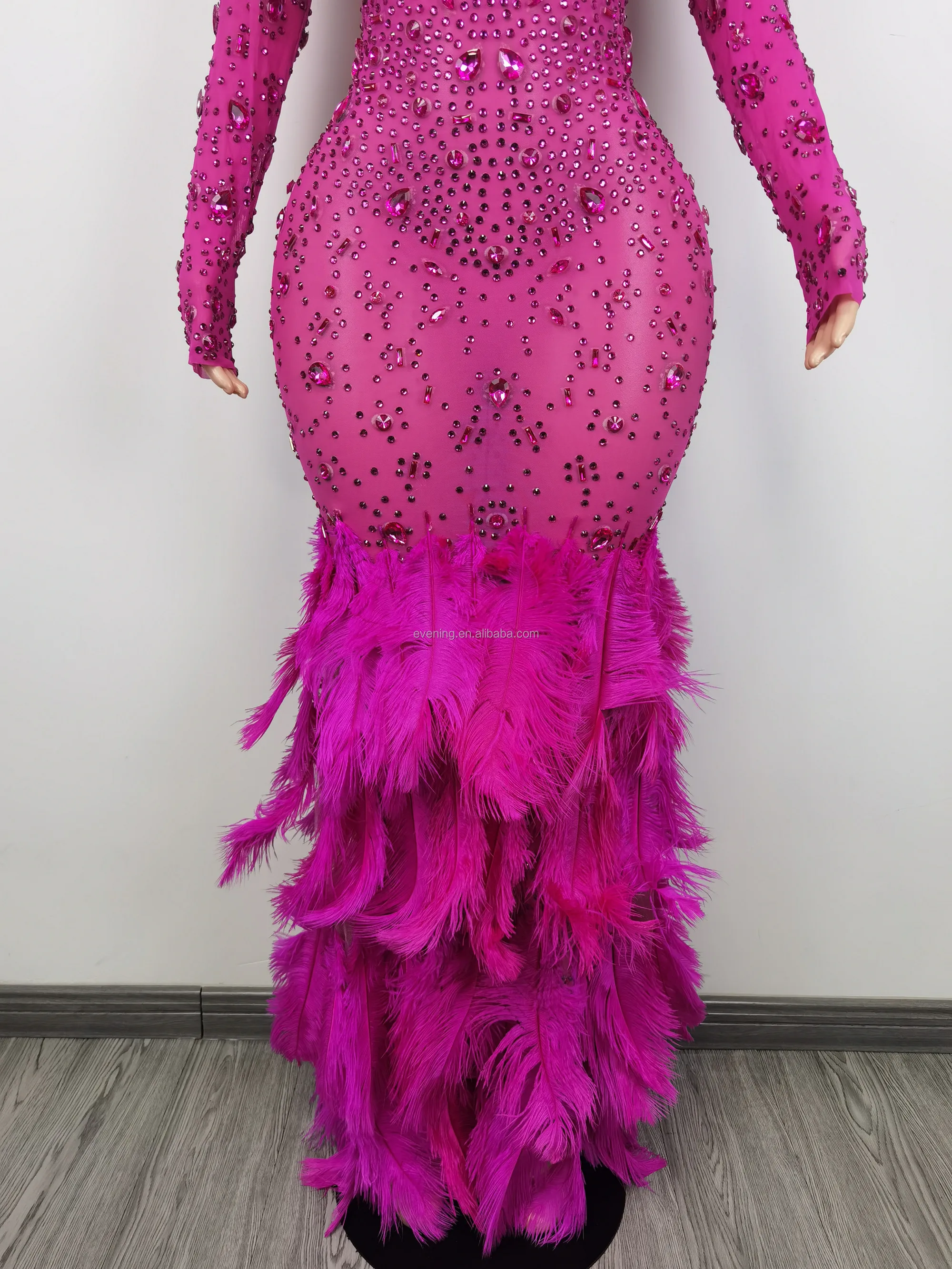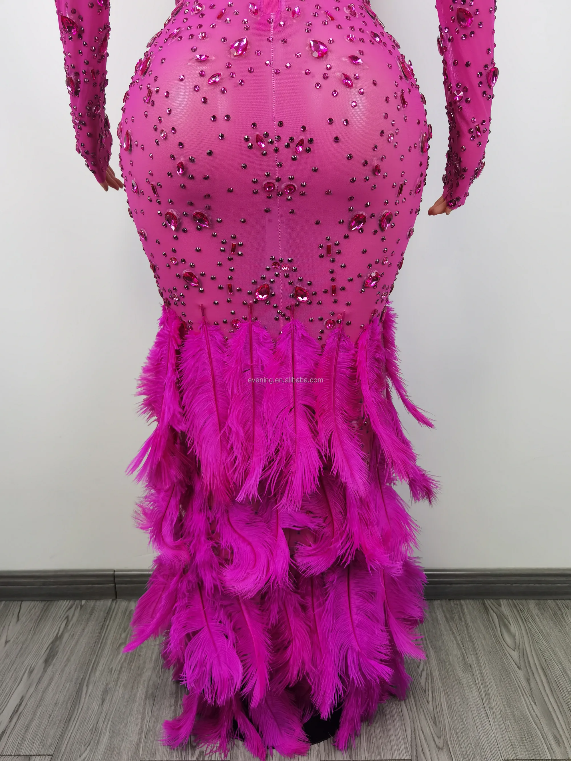 Elegant Mesh Diamond Birthday Banquet Long Mermaid Dress Lady Wear Feathers Formal Prom Dress Women Sexy Party Evening Dresses