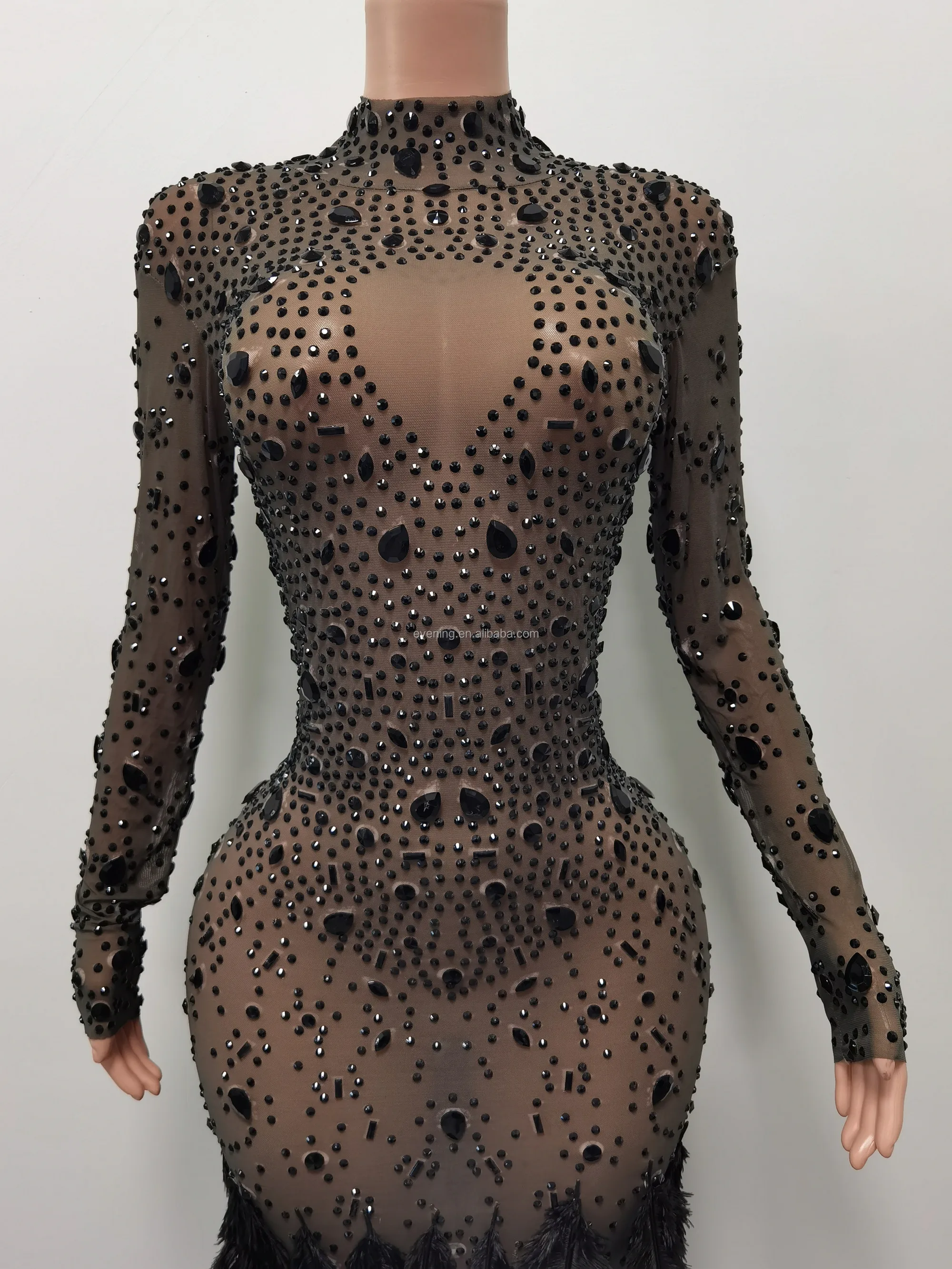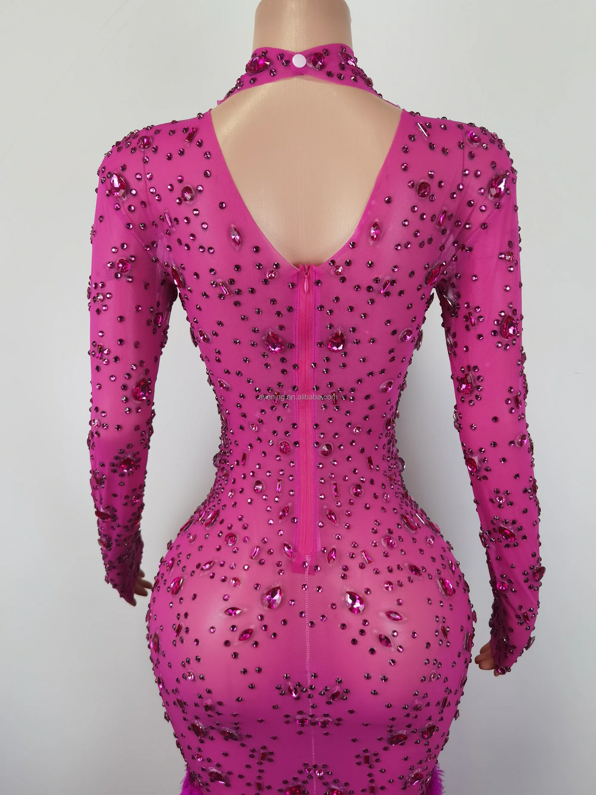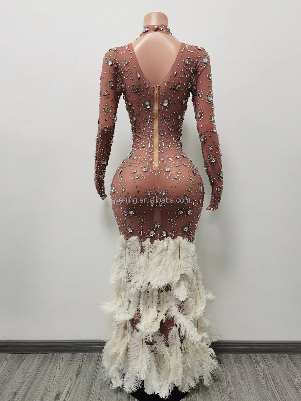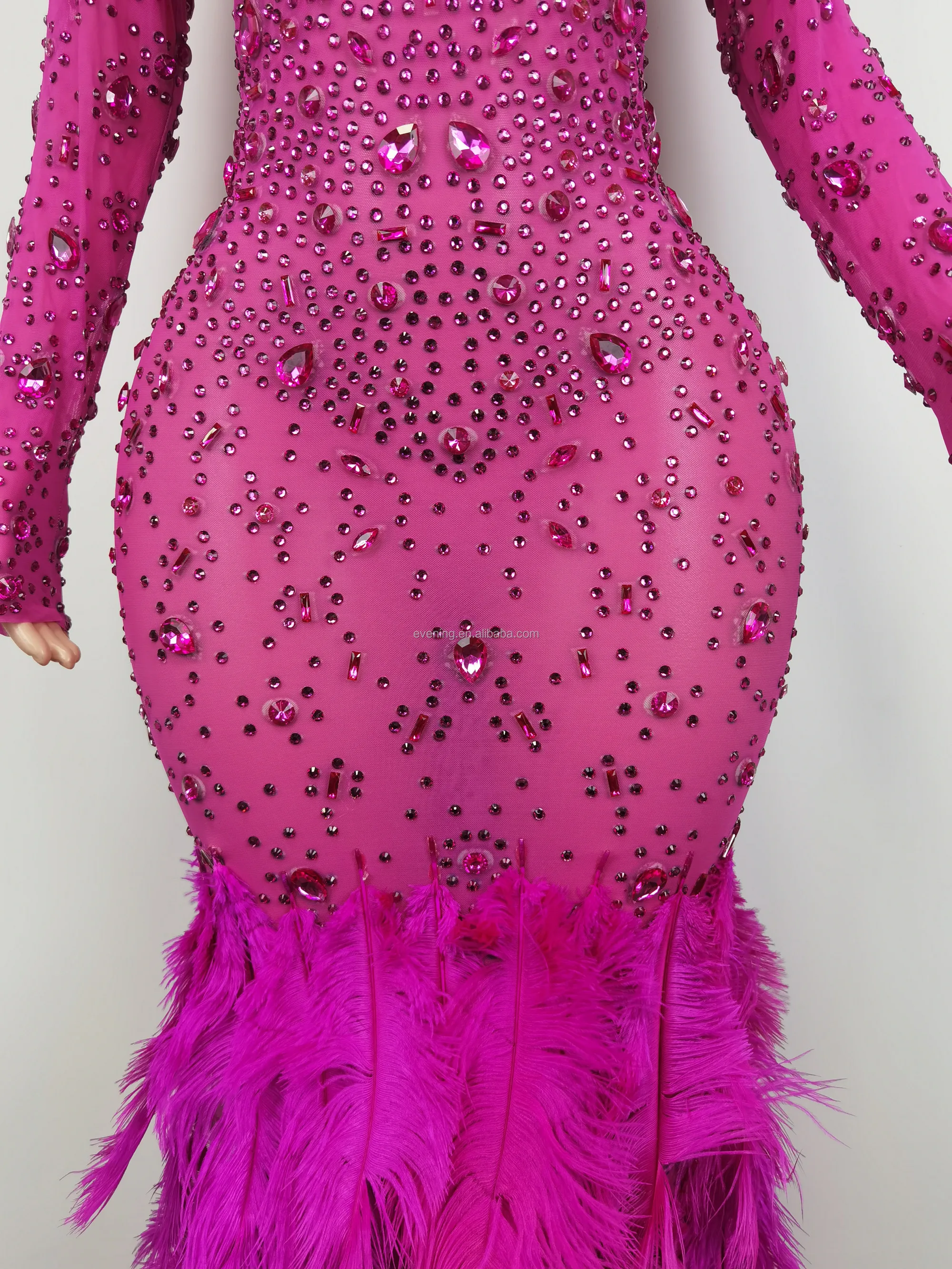 Elegant Mesh Diamond Birthday Banquet Long Mermaid Dress Lady Wear Feathers Formal Prom Dress Women Sexy Party Evening Dresses