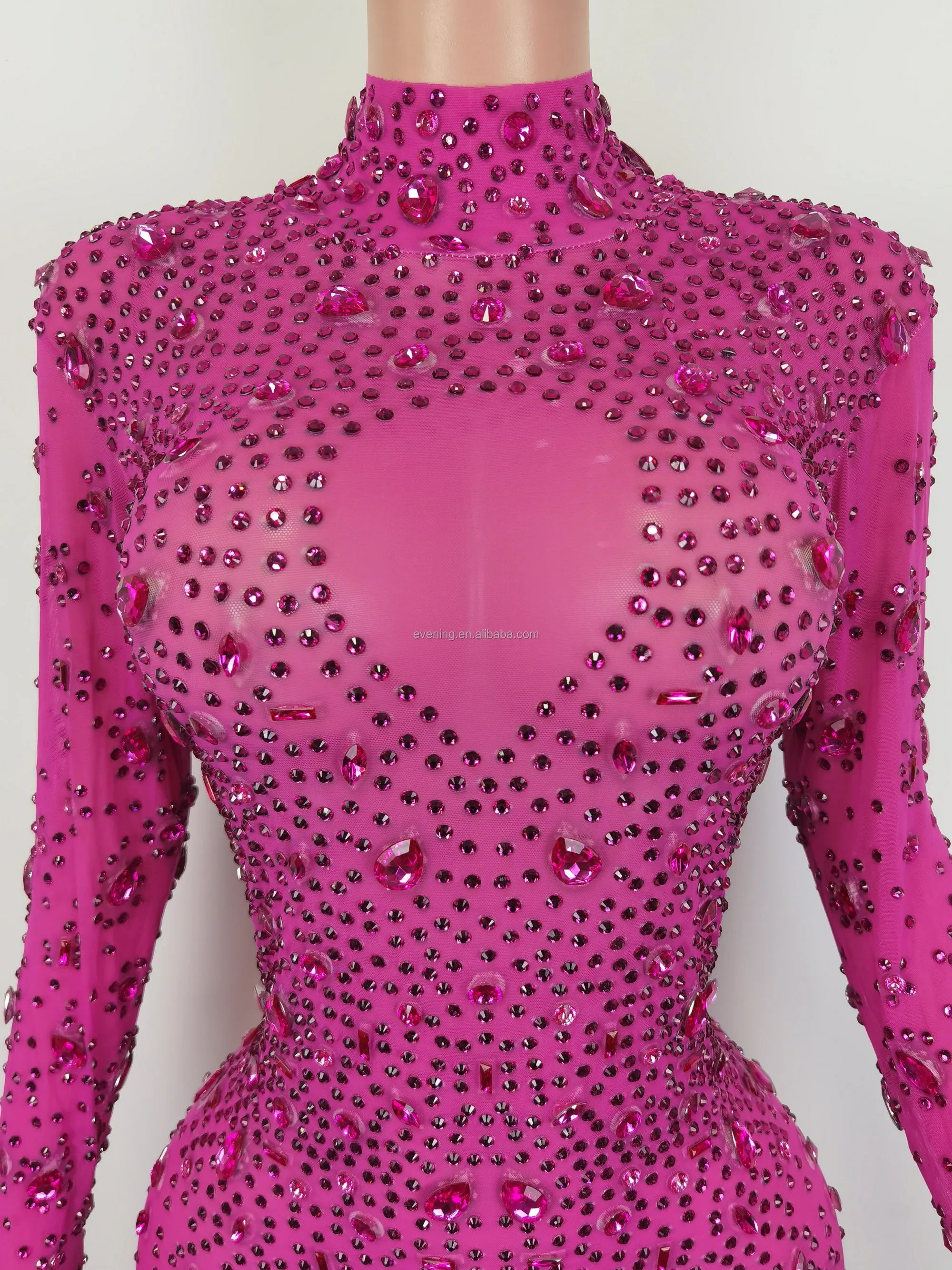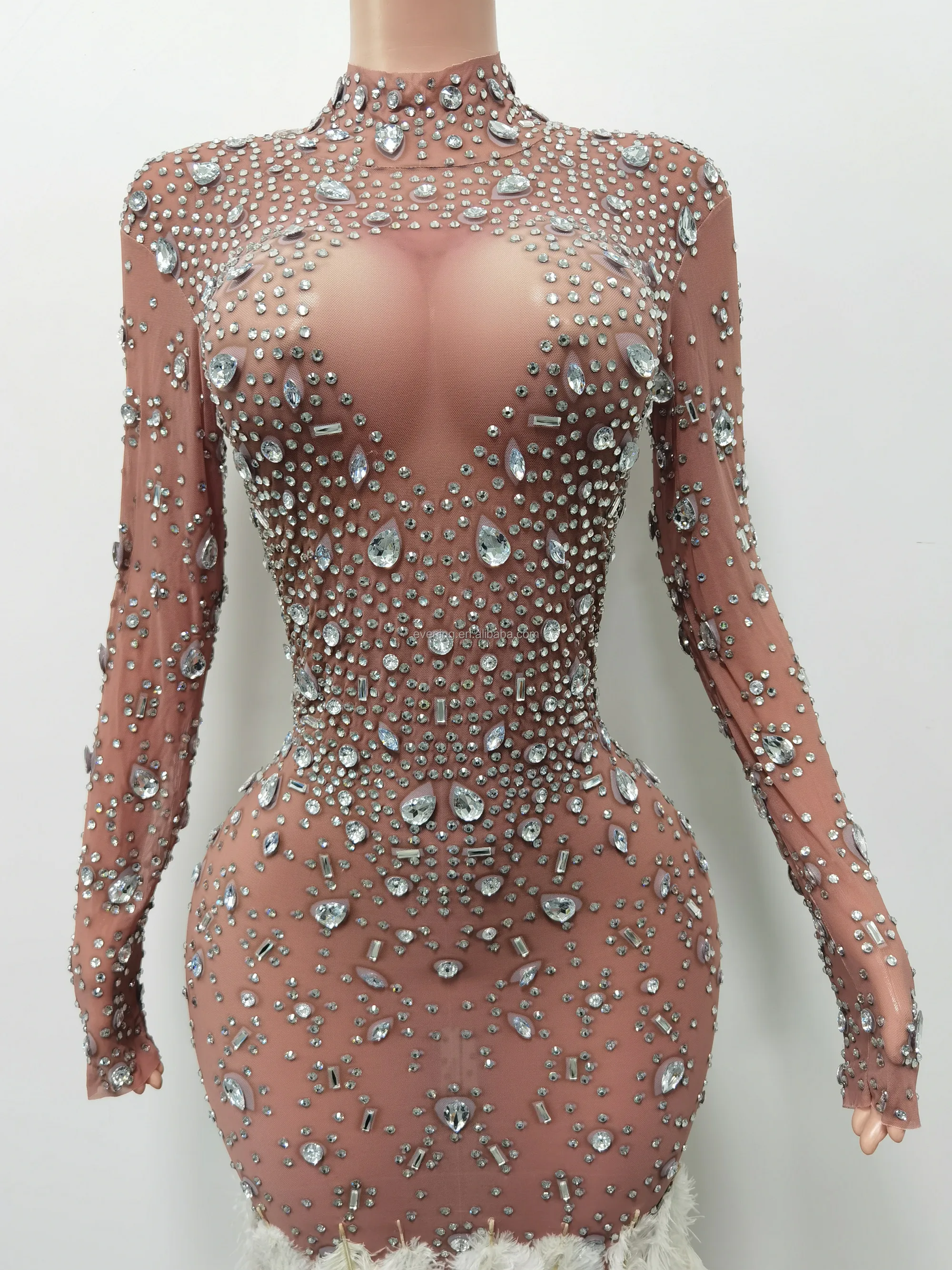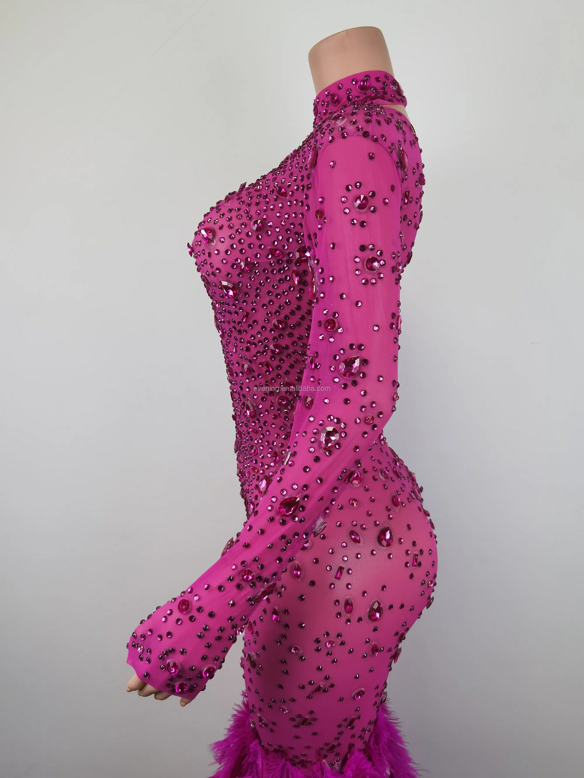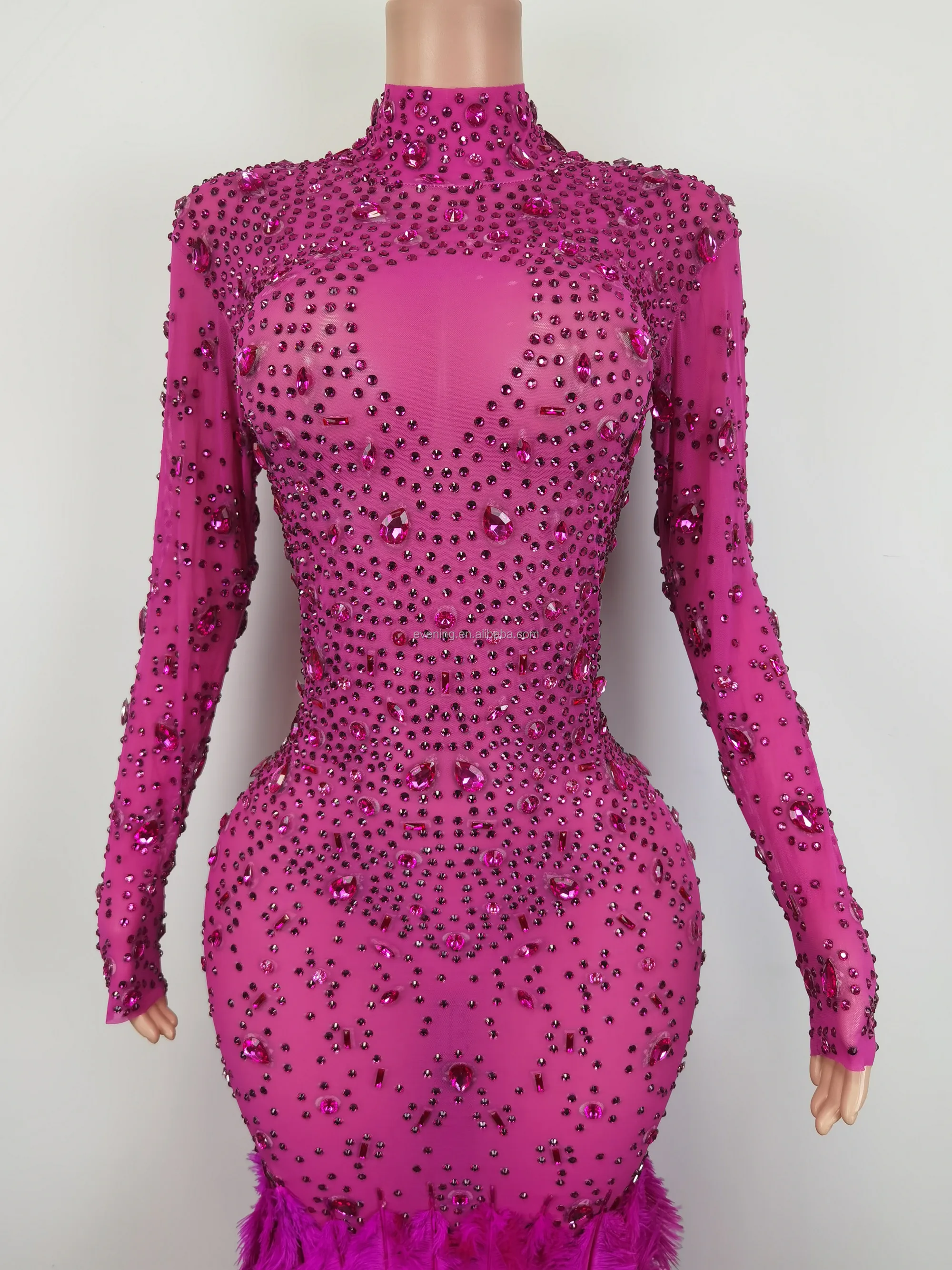 Elegant Mesh Diamond Birthday Banquet Long Mermaid Dress Lady Wear Feathers Formal Prom Dress Women Sexy Party Evening Dresses