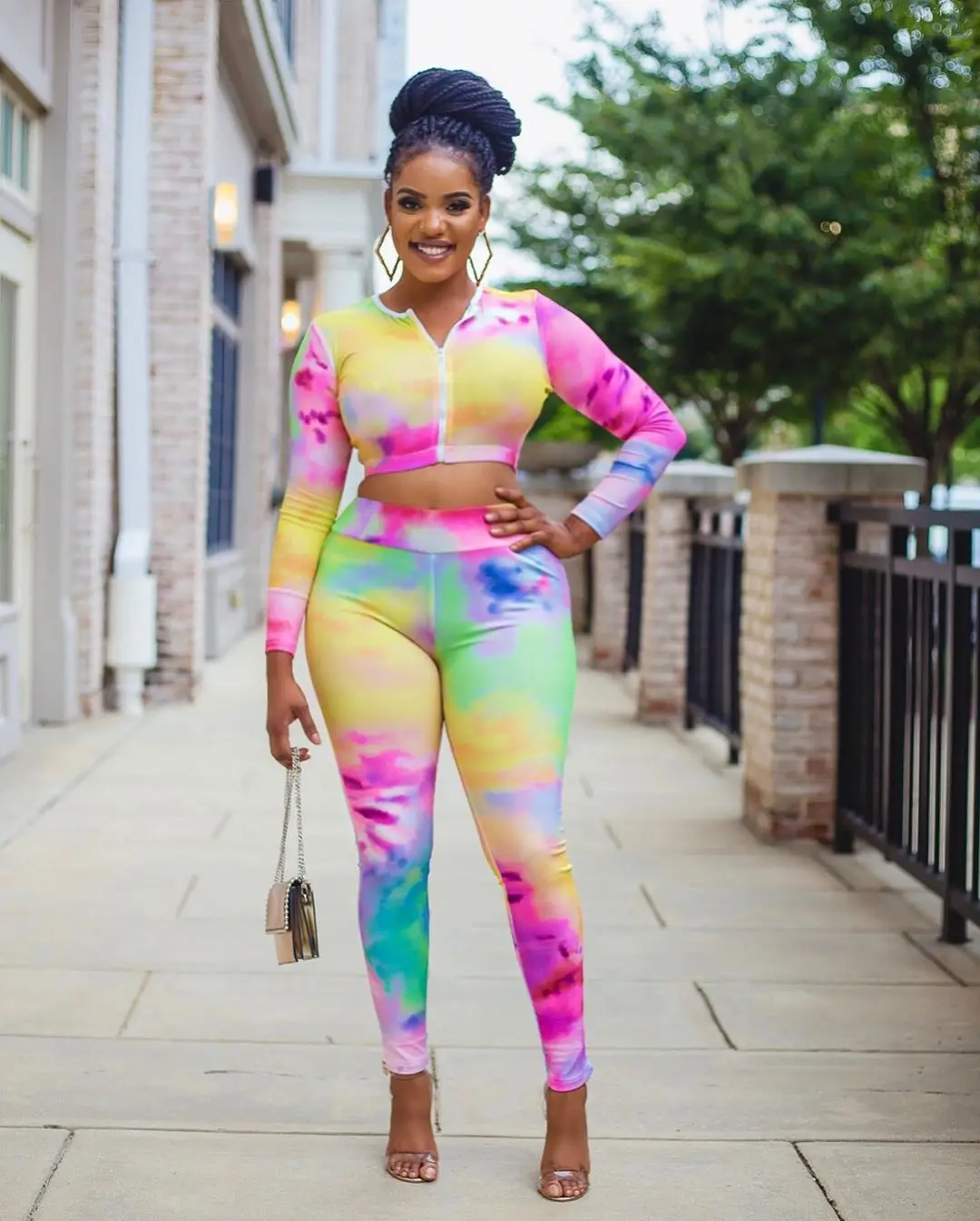 Fall Winter Full Zip Up Tie Dye Crop Tops Sport Outfits 2 Two Pieces Pants Set Women Clothing Bodycon Ladies Outfits