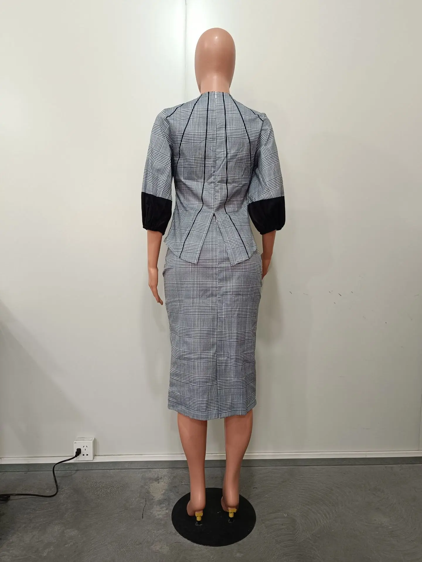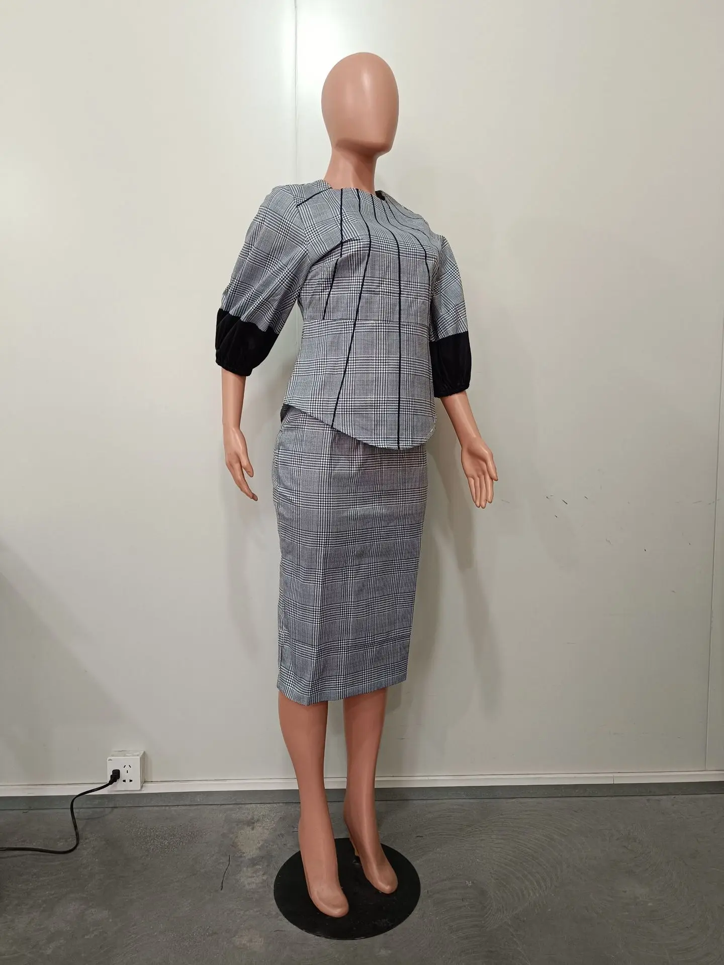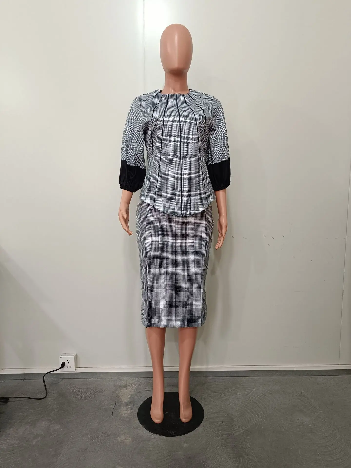 Fall Winter Women's Clothing Patchwork Lantren Sleeve Tops And Midi Skirt Set Fashion Print Split 2 Piece Skirt Set