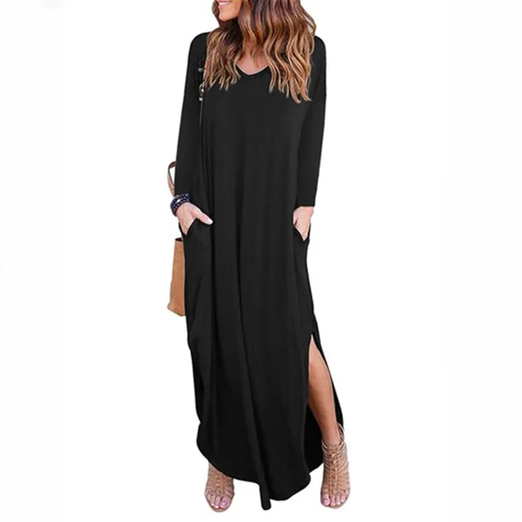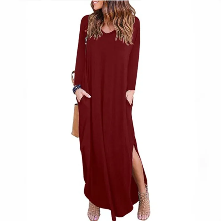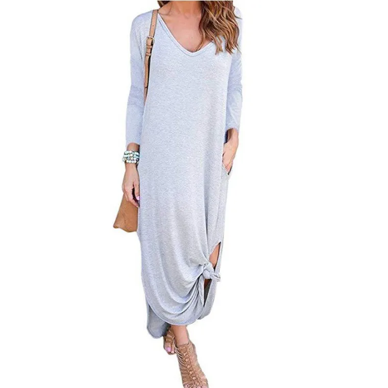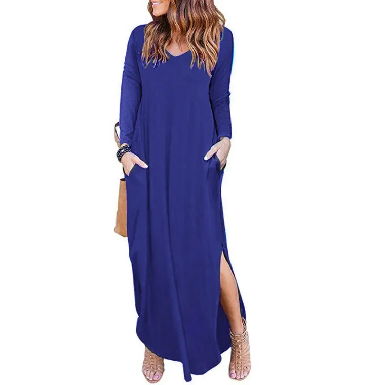 Fashion V-neck Long Sleeve Solid Color Casual Women Maxi Dress Summer Clothing Dresses Women Lady Elegant