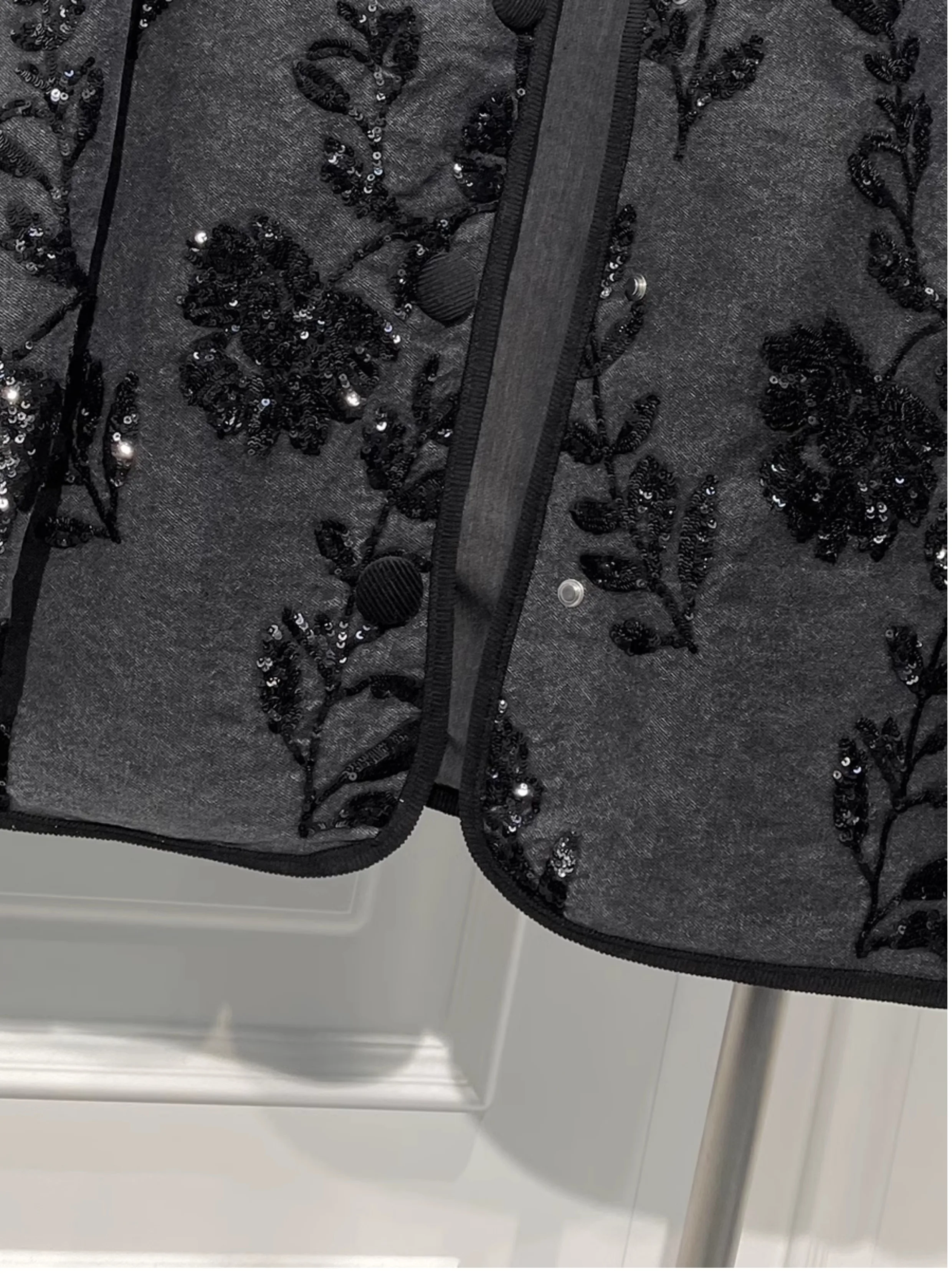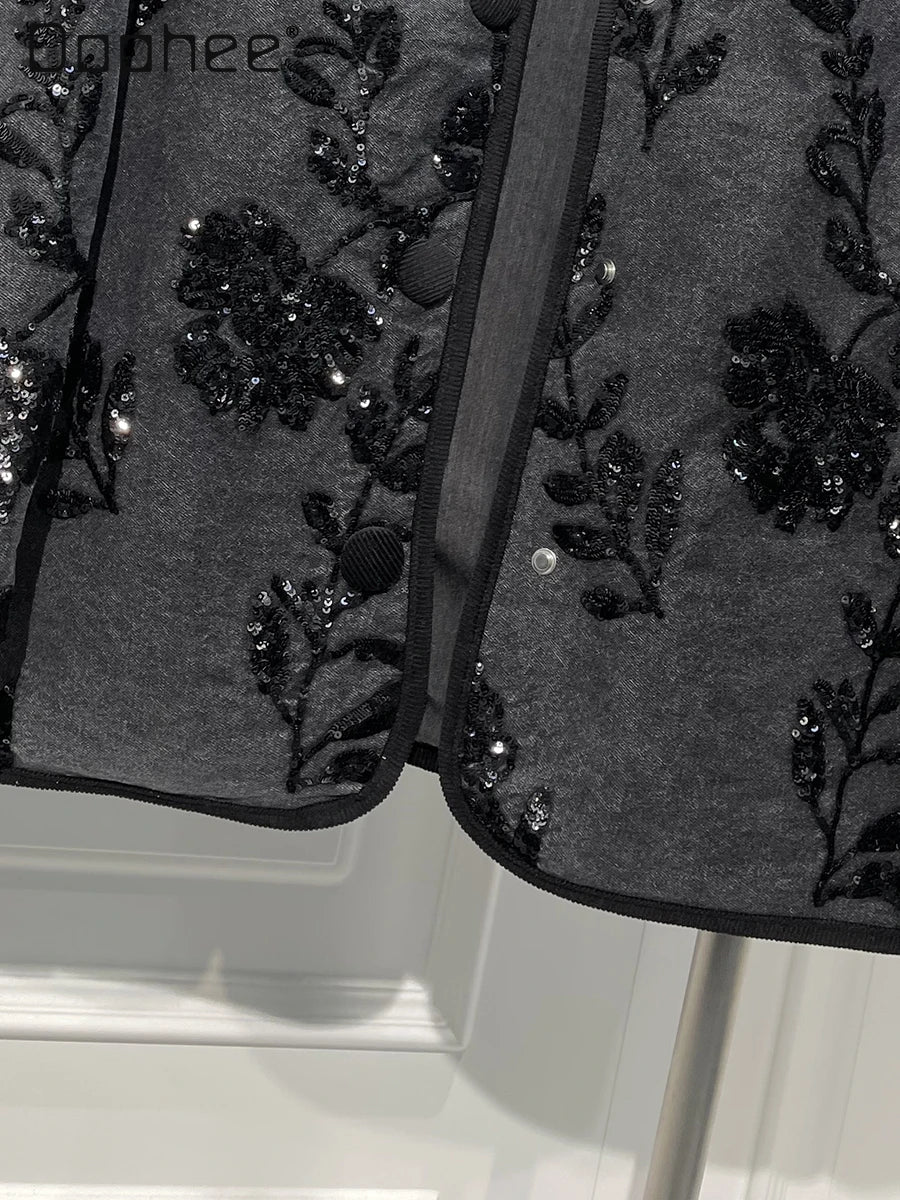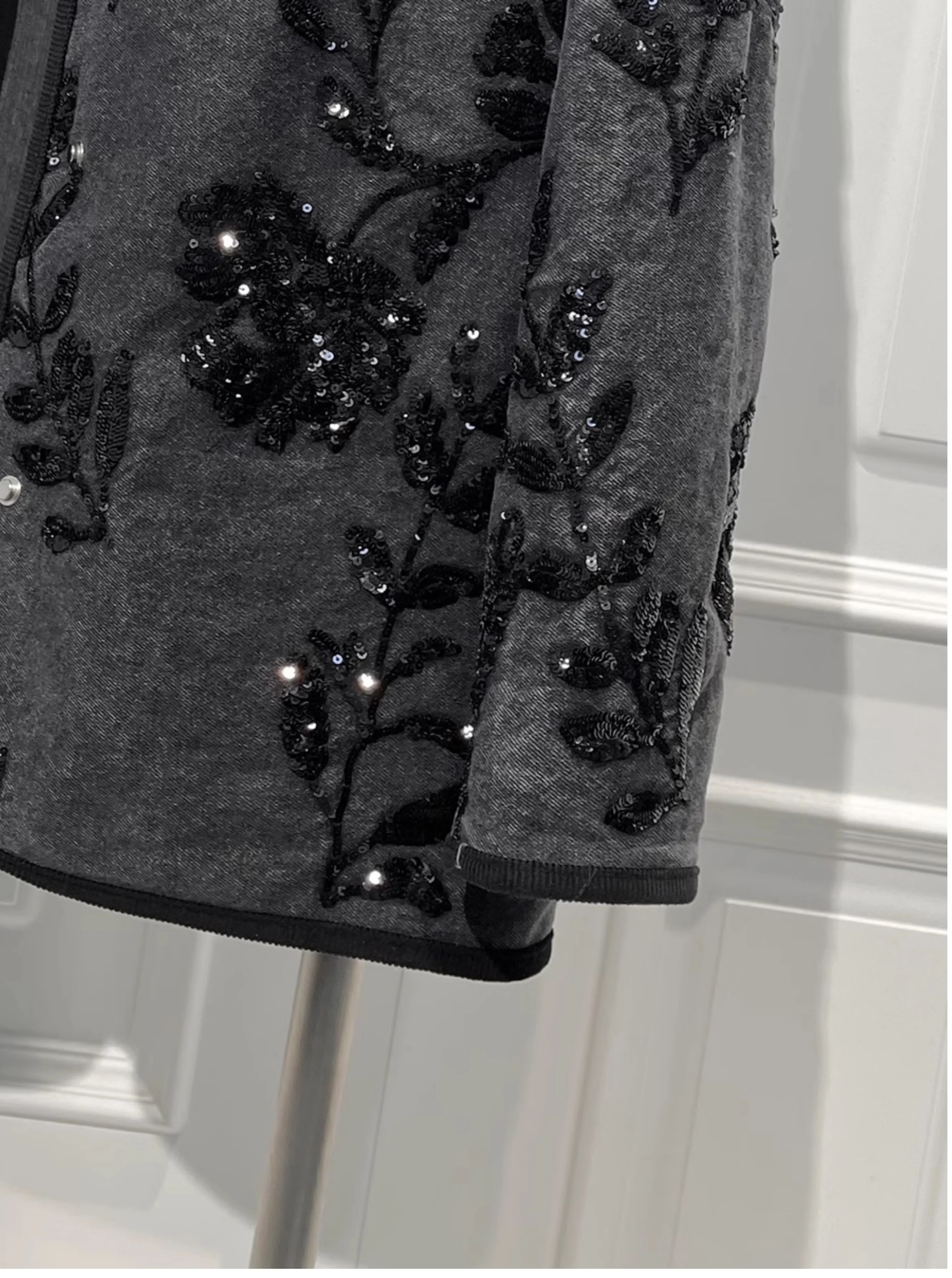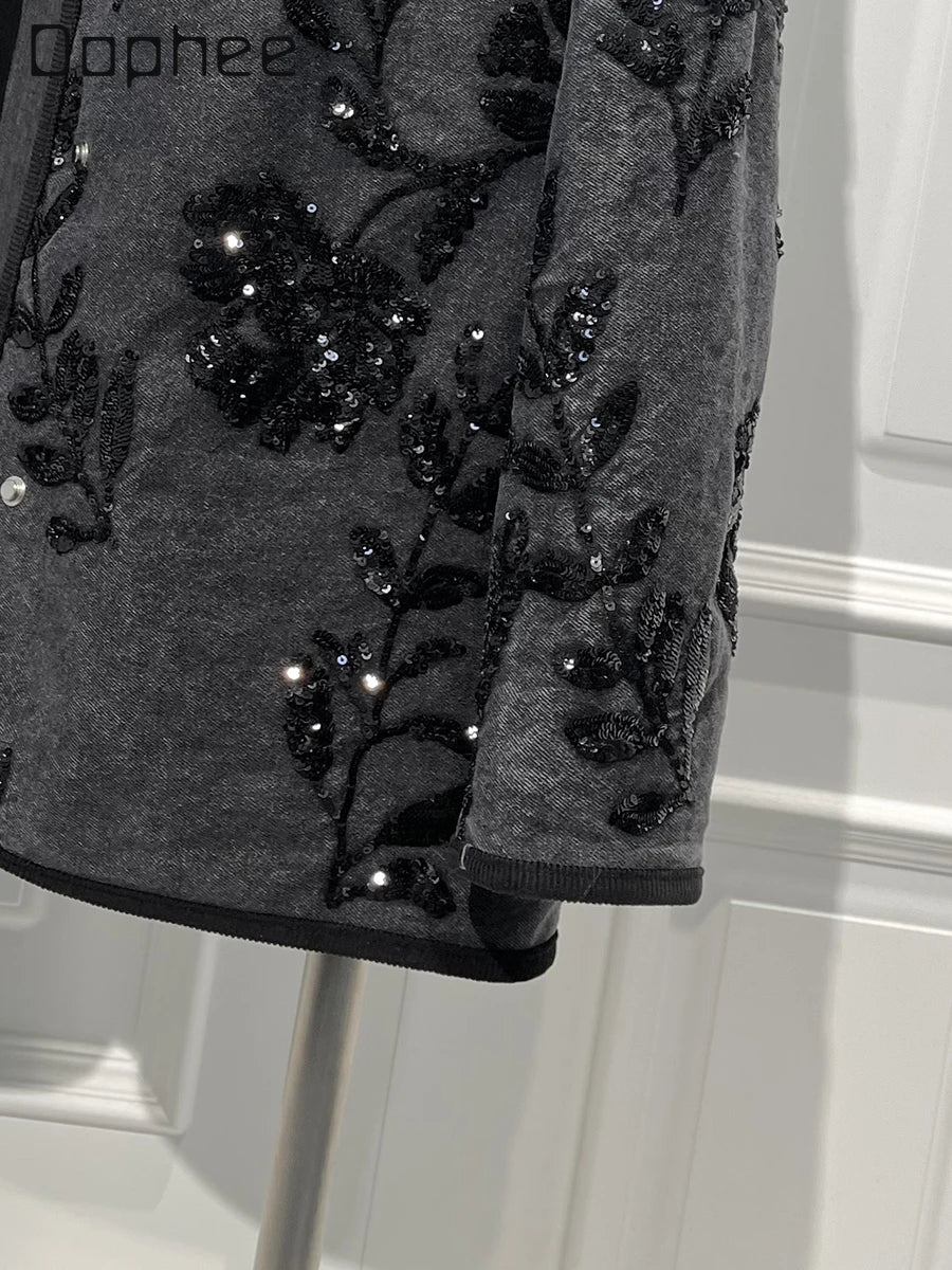 Fashion Versatile Heavy Industry Embroidered Flower Denim Jackets for Women Spring New Loose Casual Mid-length Sequined Jacket