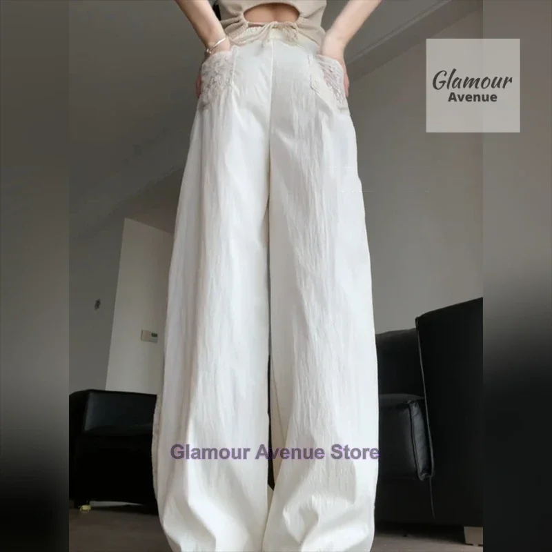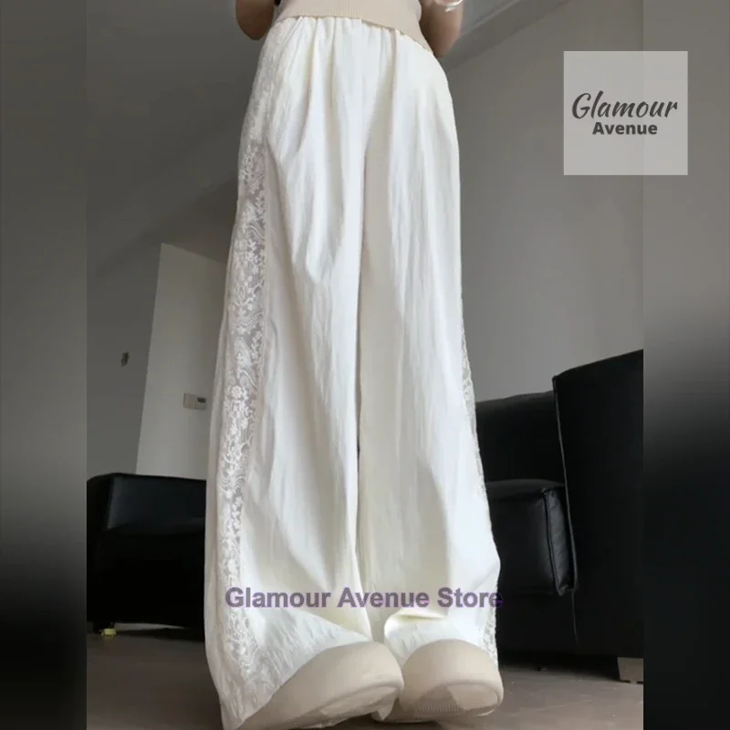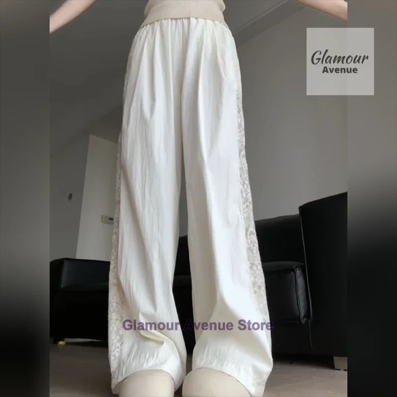 French retro lace design stitching pants women's summer new fashion temperament straight loose wide leg drop casual pants.