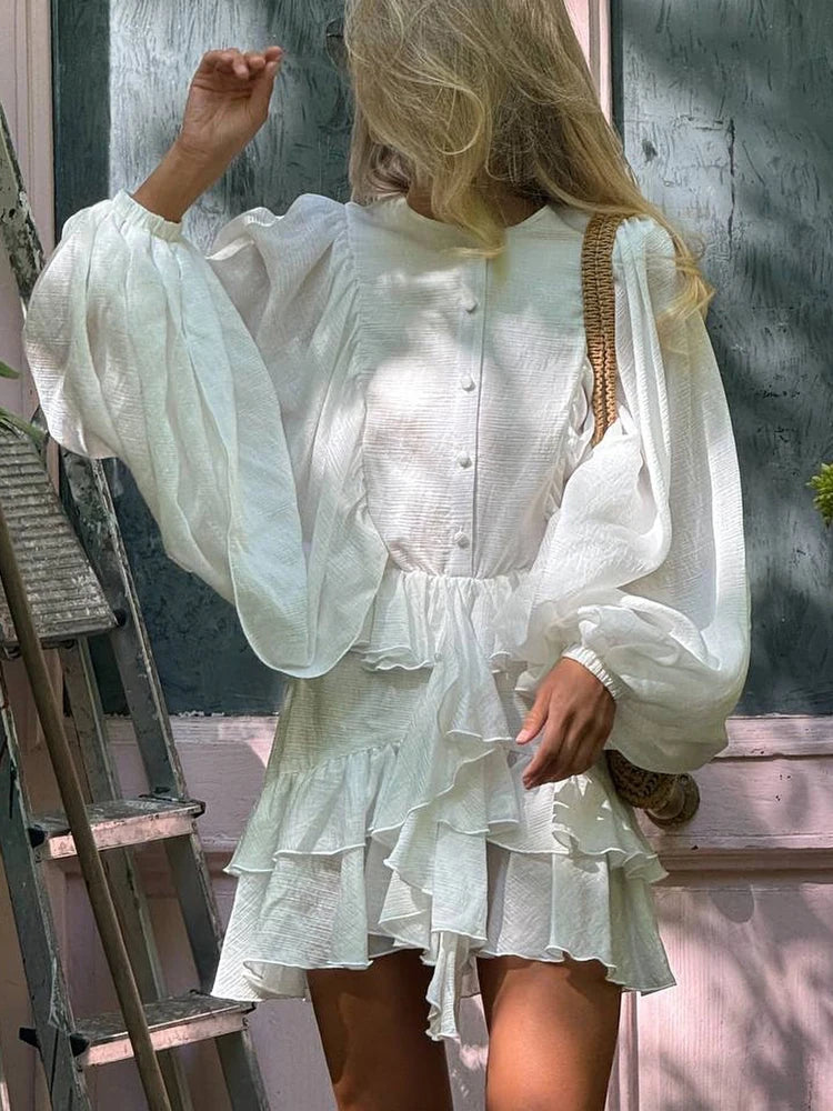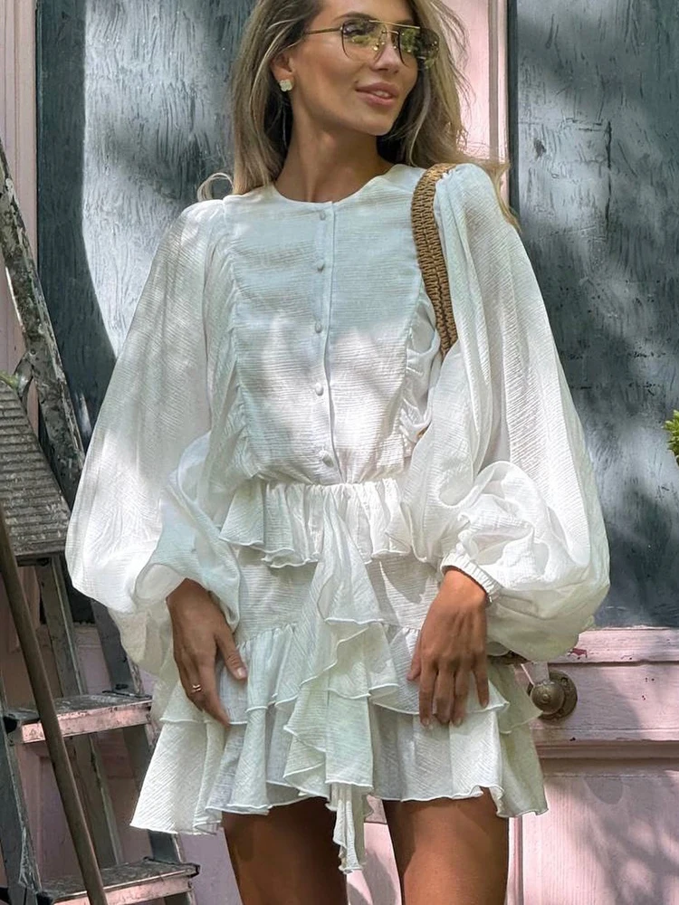 FSMG Elegant Lantern Sleeve Ruffle Edge Mini Dress Casual O Neck Pleated Single Breasted Loose Short Skirt Holiday Banquet Dress
