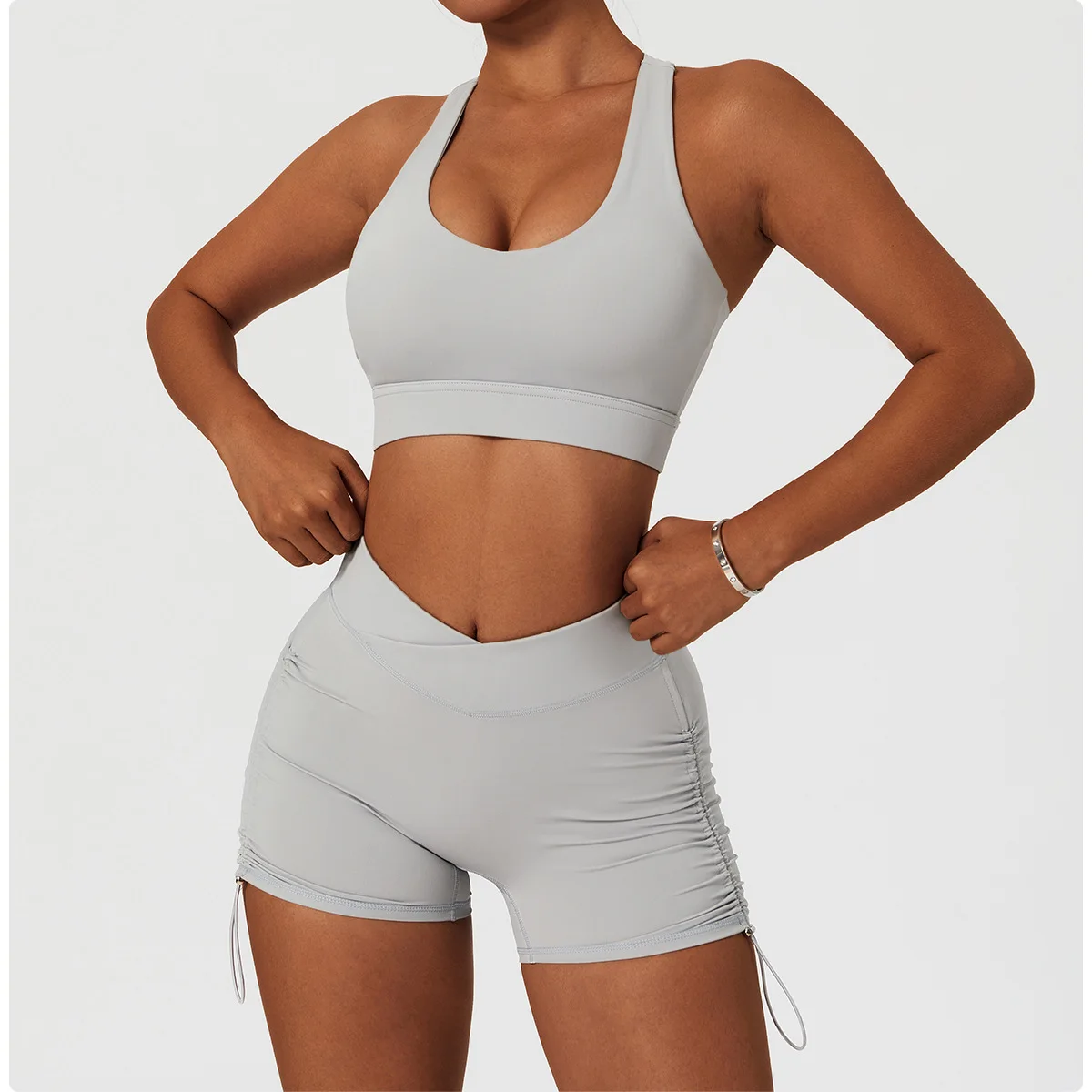 High Impact Bra and Cross V Waist Shorts Yoga Biker Set 2 PCS Stretchy Nylon Workout Running Clothing 2024 Women Gym Sportswear