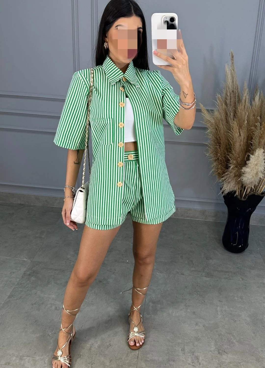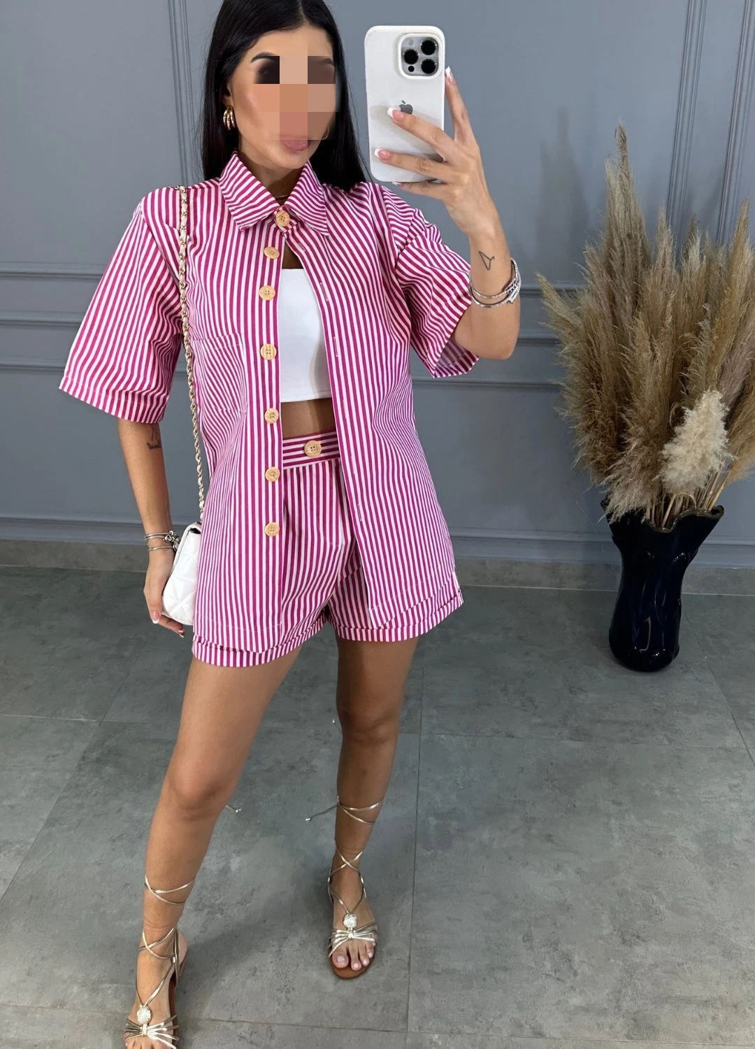 HK5283 Wholesale Casual Women Clothing Set Cotton Stripes Sleepwear Button Turndown Collar Shirt