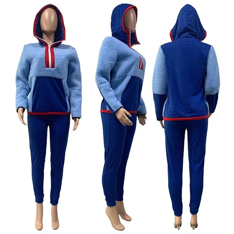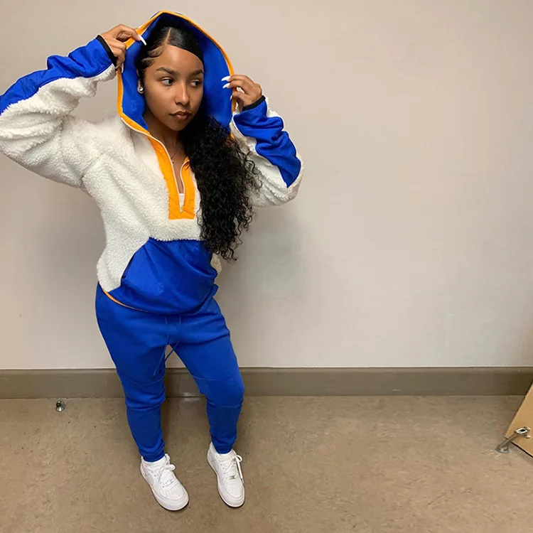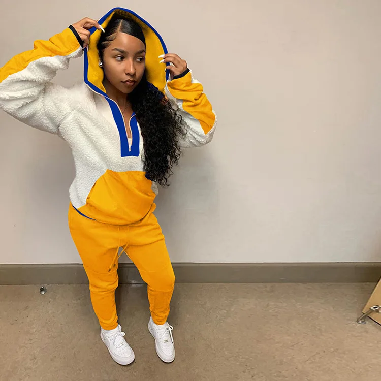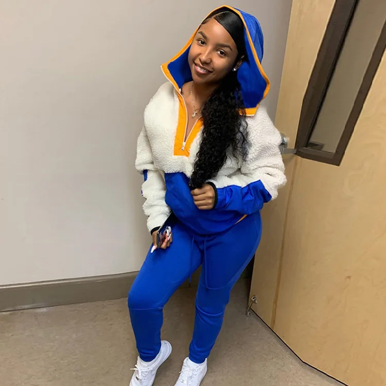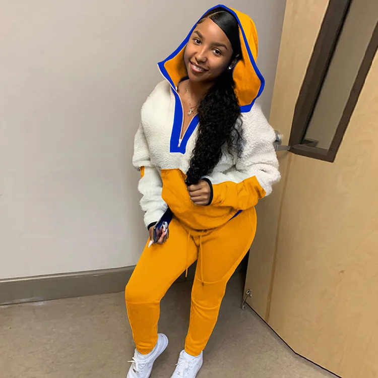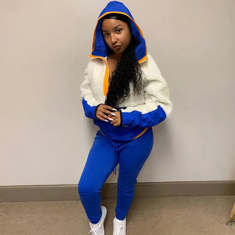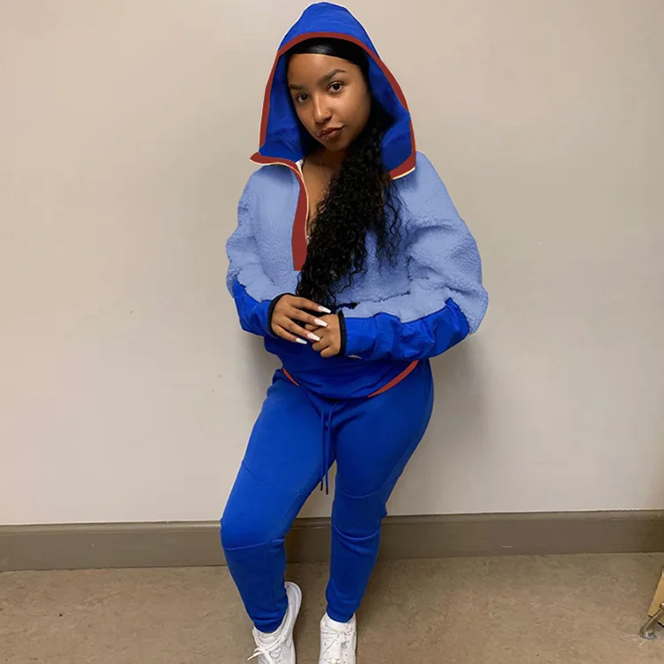Lamb Hair Sweater Two Piece Set Women Clothing Hooded Patchwork 2 Piece Pants Set for Ladies