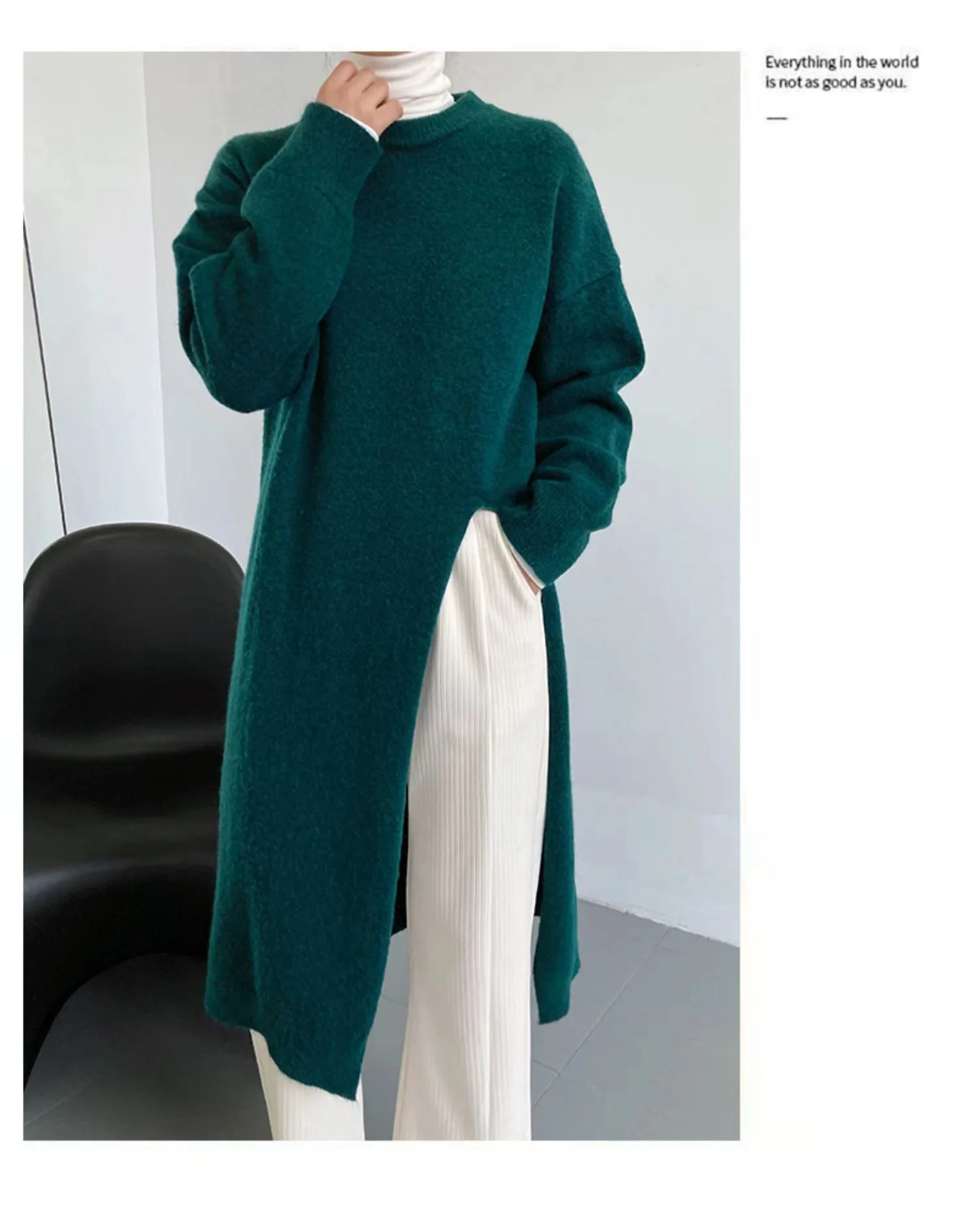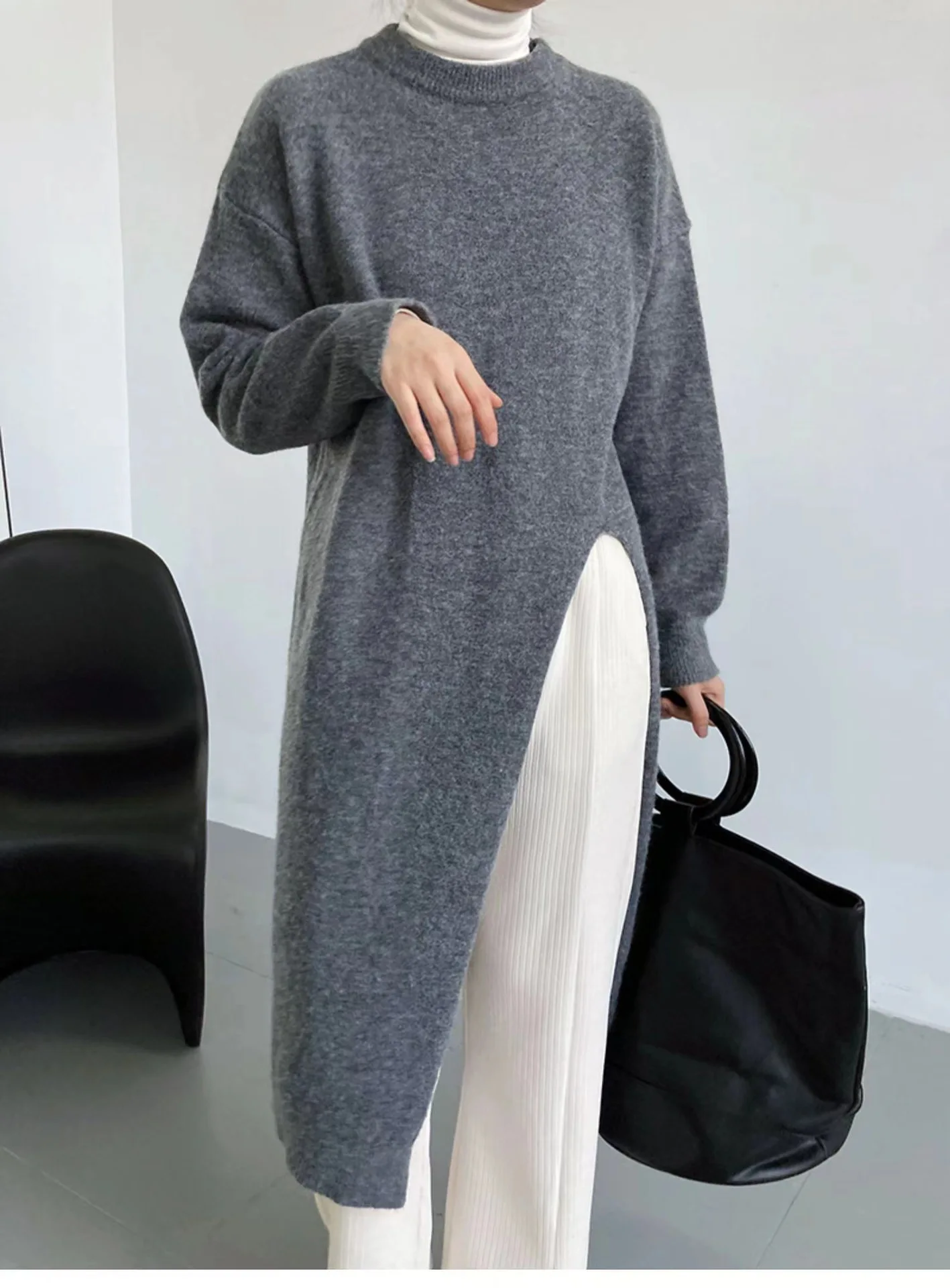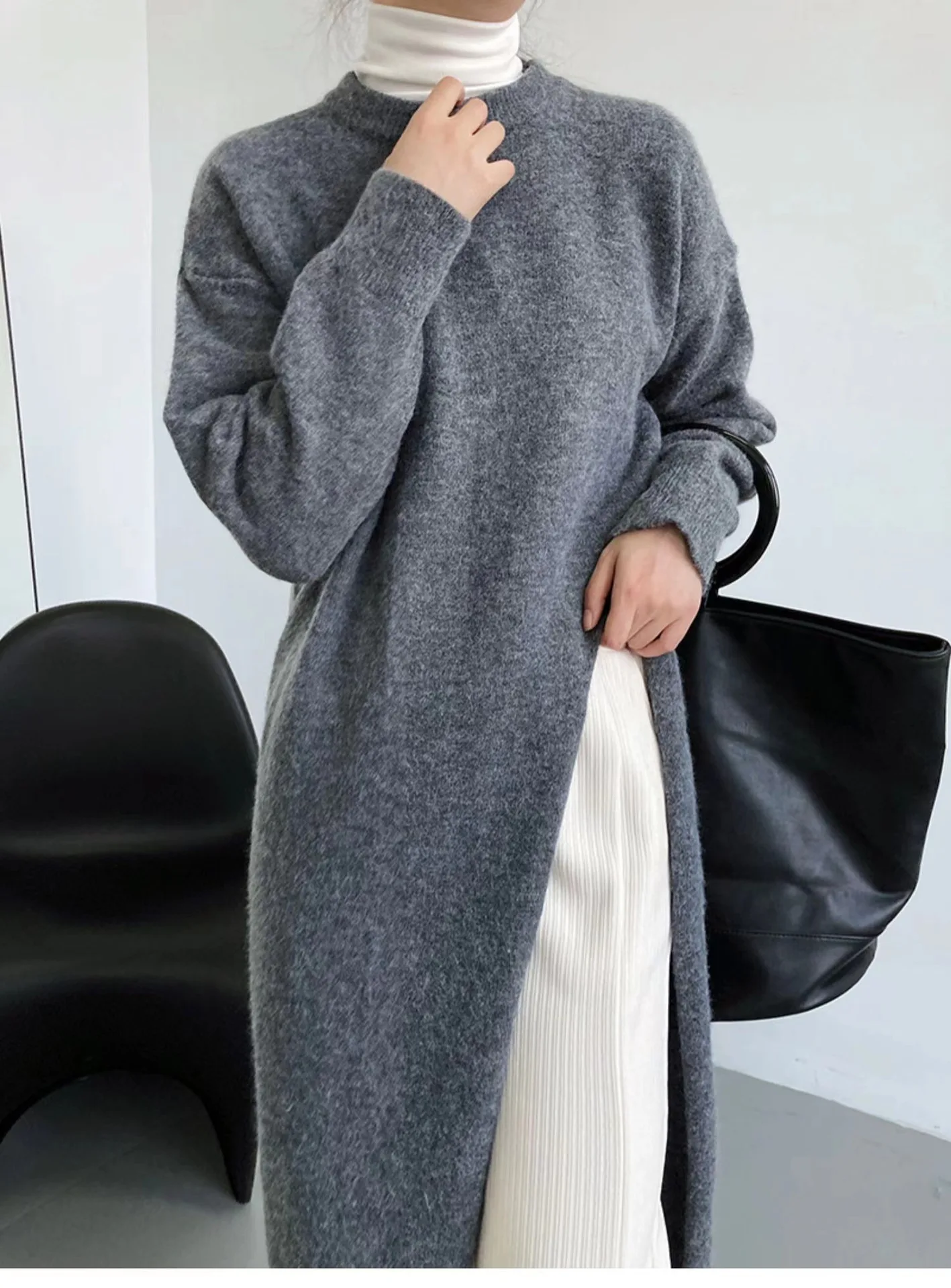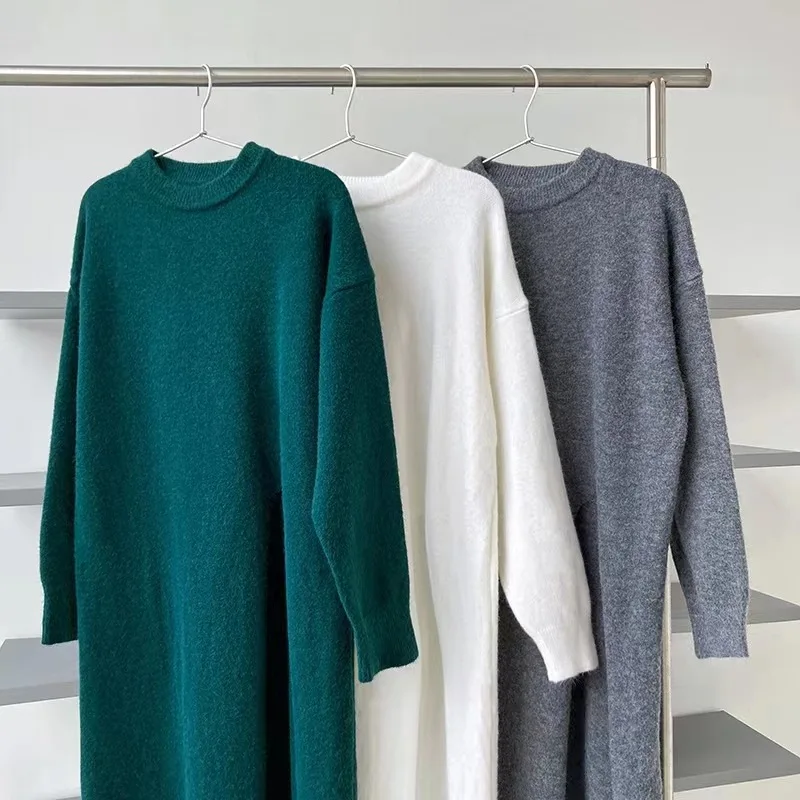 Latest Batwing Long Sleeve Sweater Dress Women Solid Size Slit Loose Clothing Fall Dresses Women French 2023