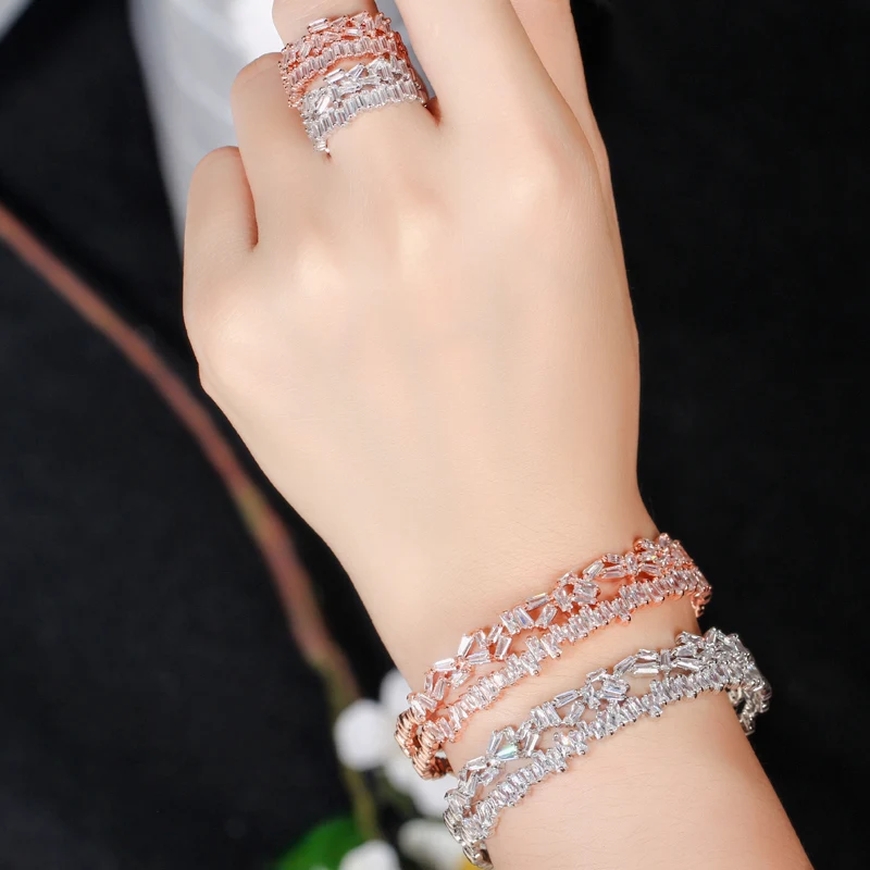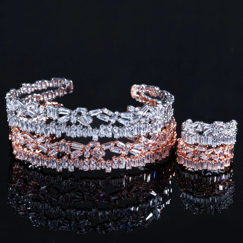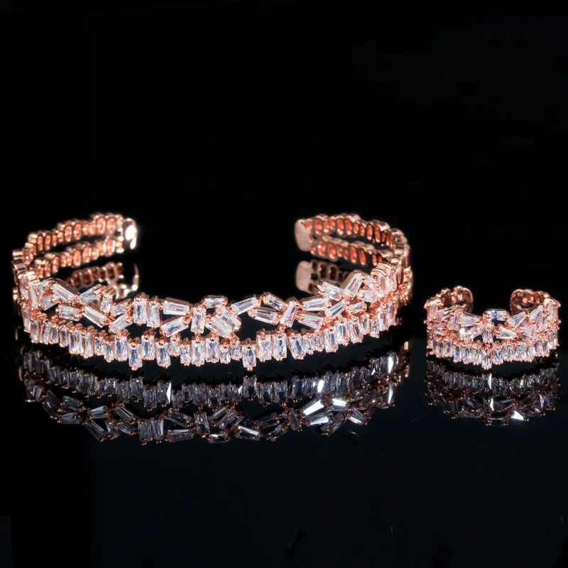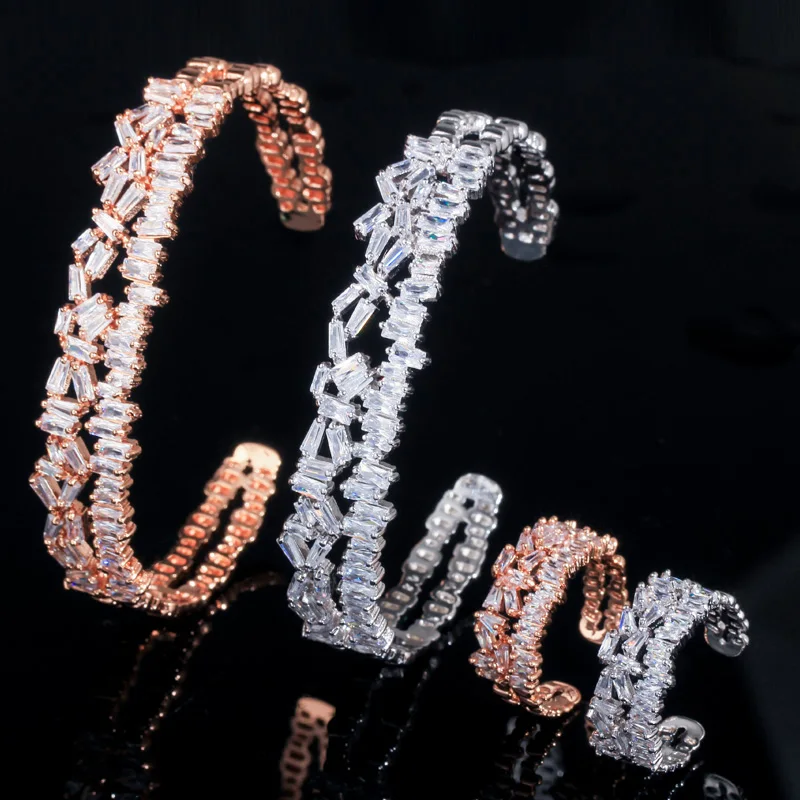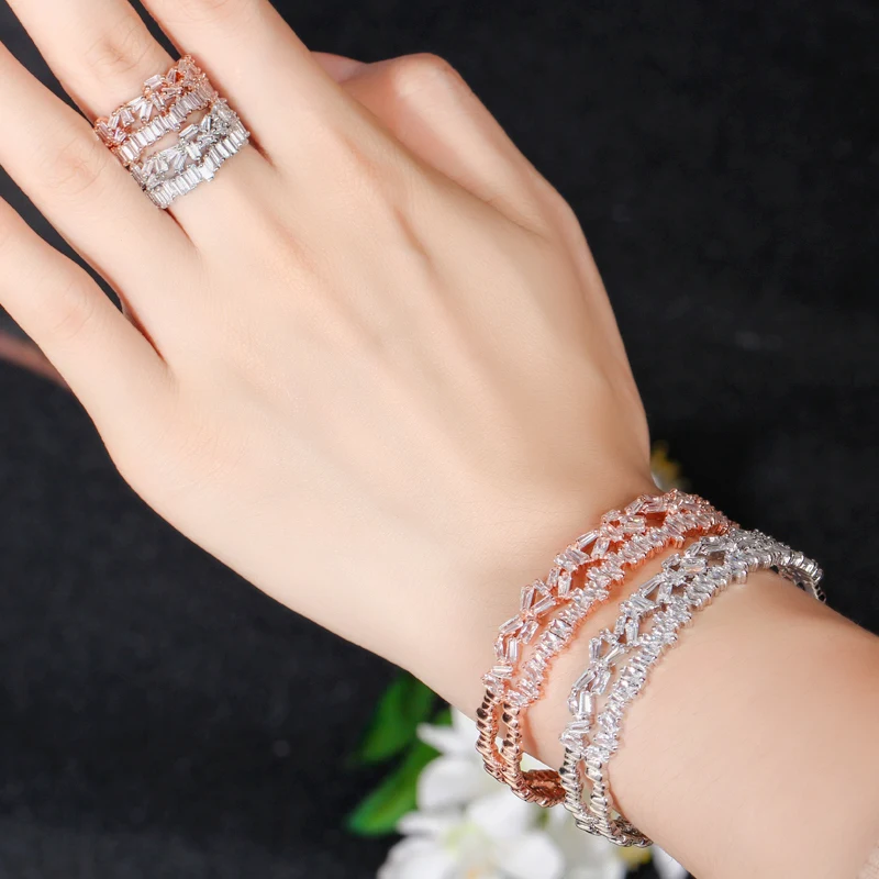 Luxury Rose Gold Silver Color Shiny White Baguette Cubic Zirconia Wedding Bangle with Ring Set for Lady Engagement Jewelry Wear