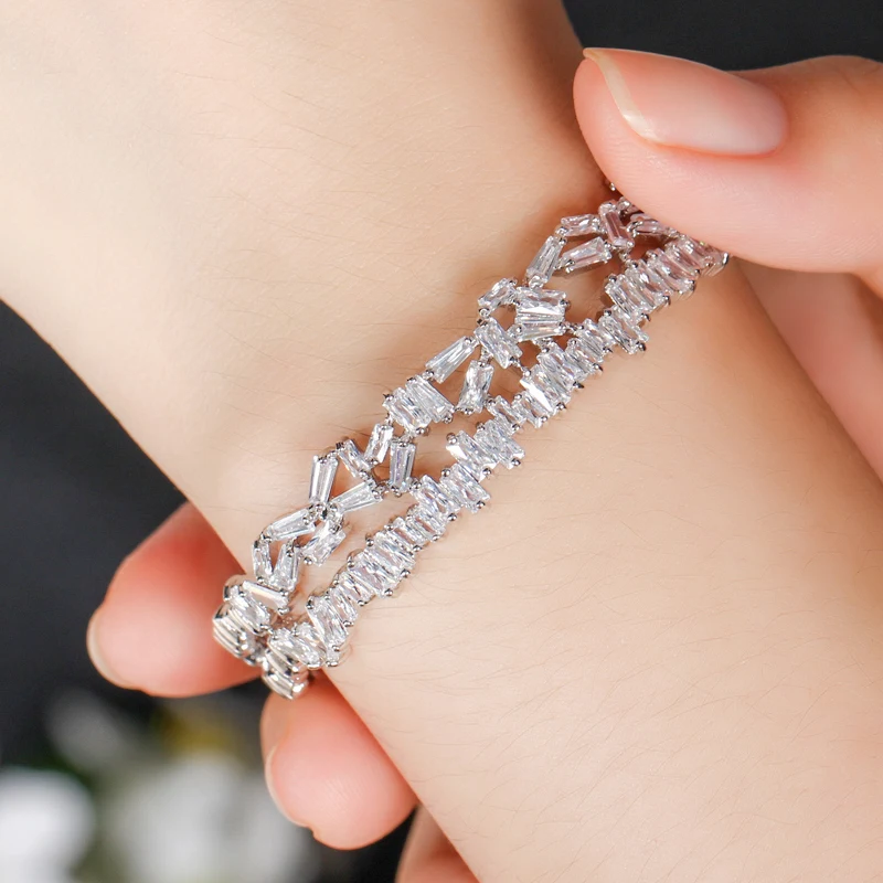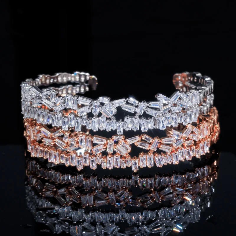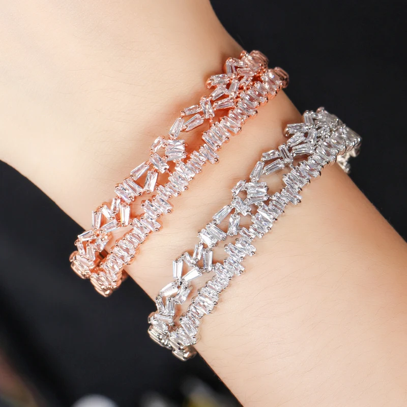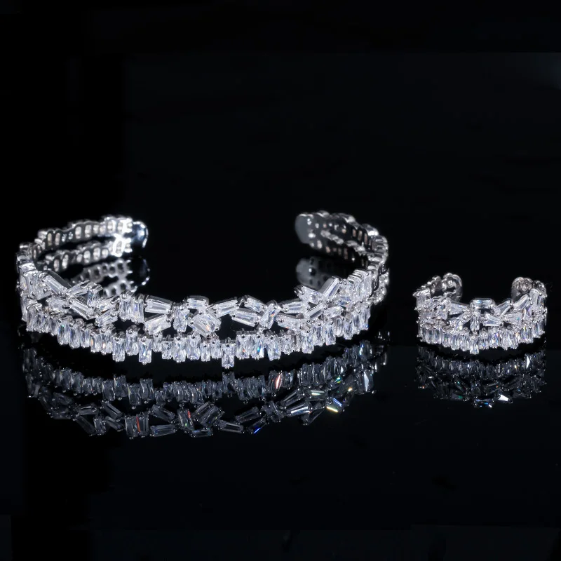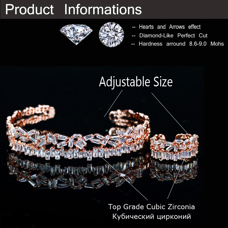 Luxury Rose Gold Silver Color Shiny White Baguette Cubic Zirconia Wedding Bangle with Ring Set for Lady Engagement Jewelry Wear