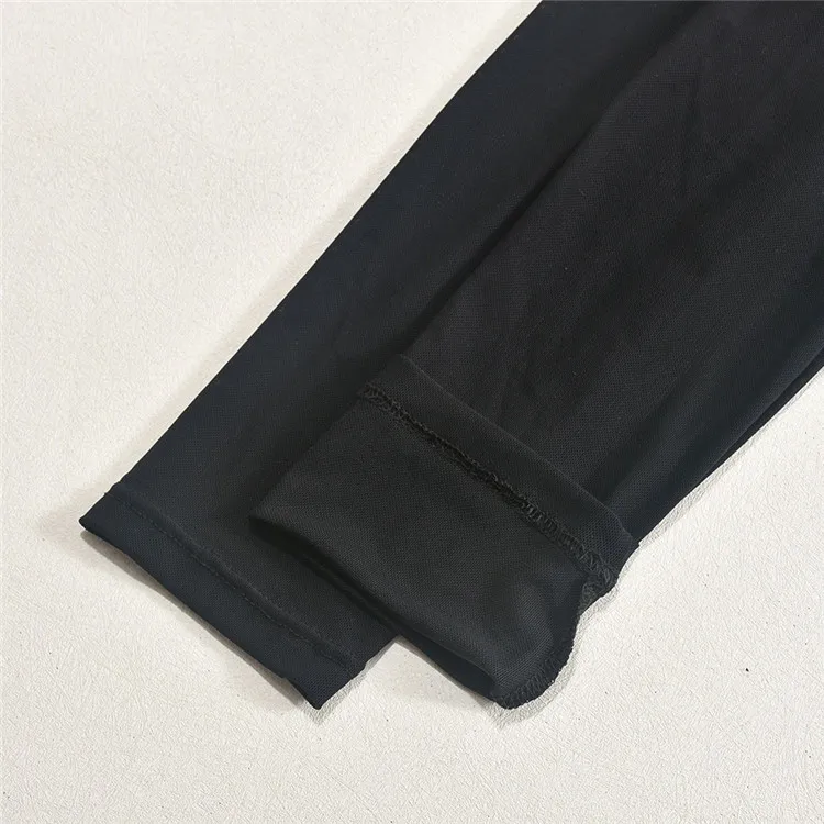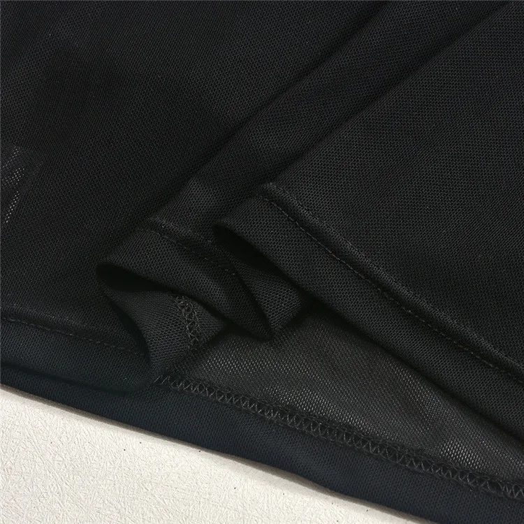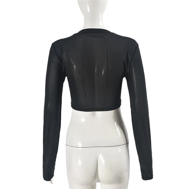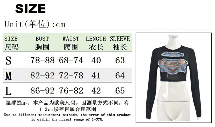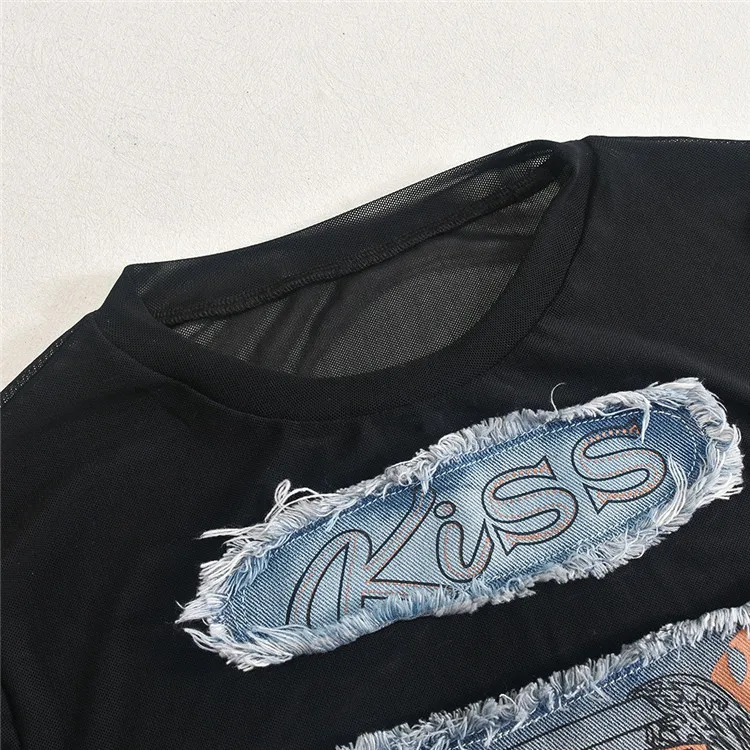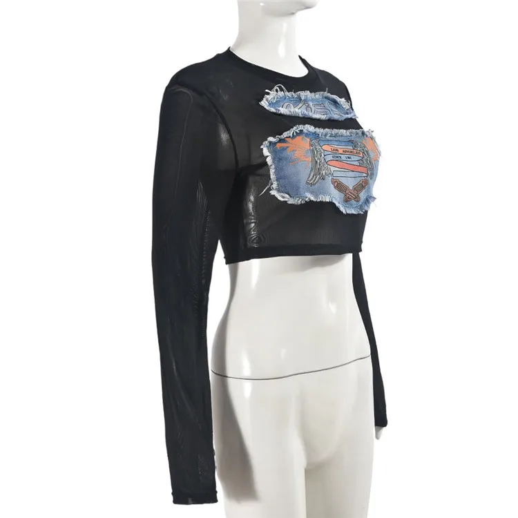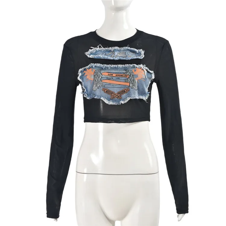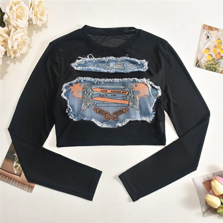 Mesh Applique Denim Y2K T-Shirts Women Hipster Sexy O-Neck Long Sleeve Slim Crop Tops 2024 Summer Graphic Tees