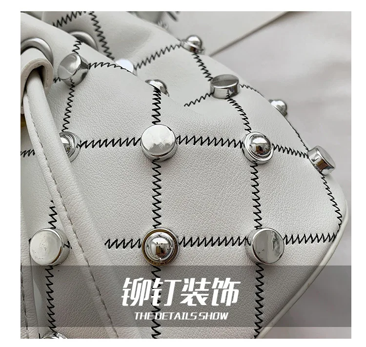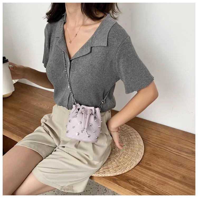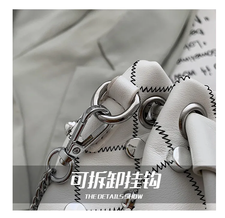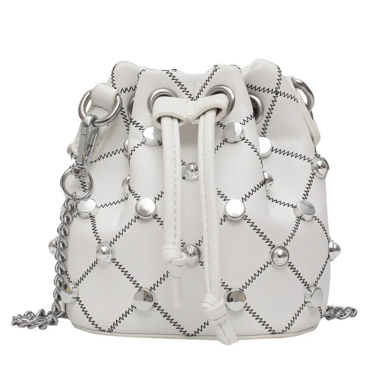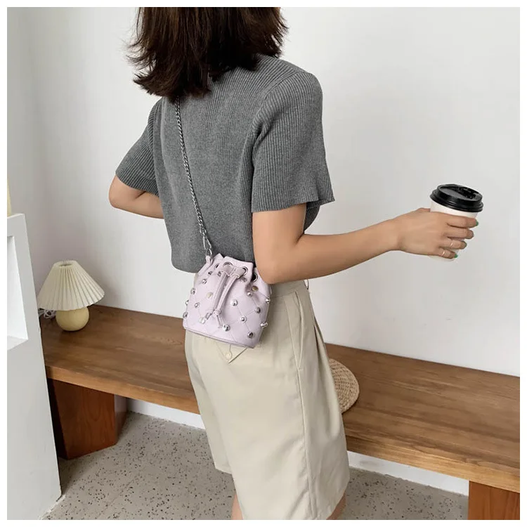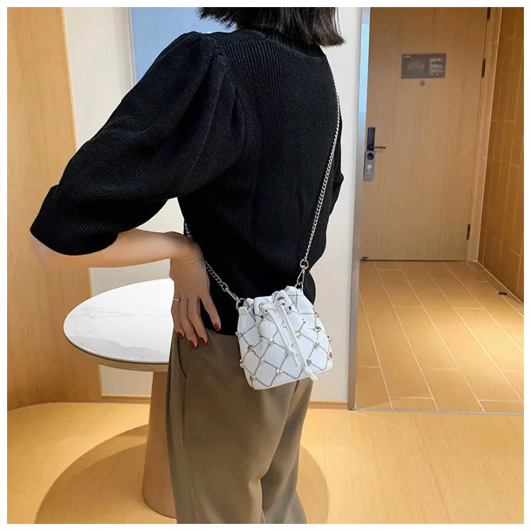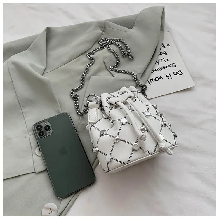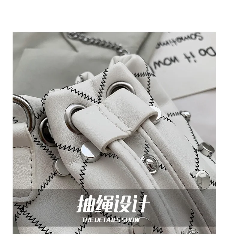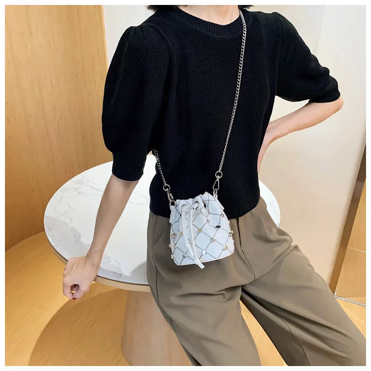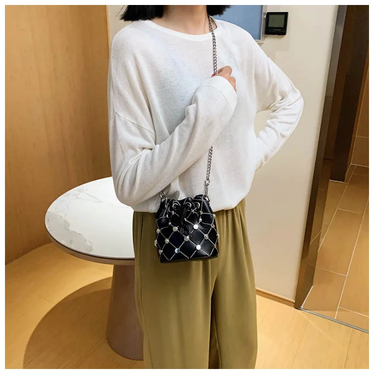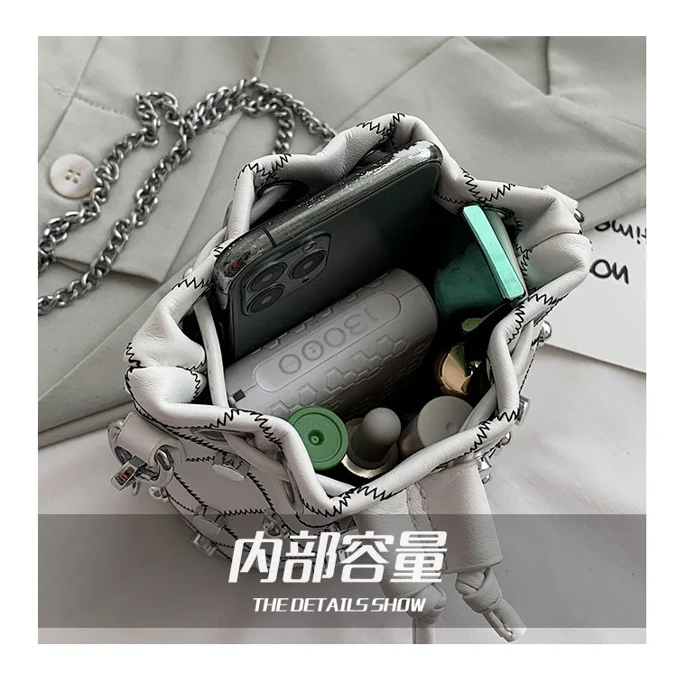 Mini Design Drawstring Bucket Patch Bags Women handbag for ladies PU Leather Embroidery Gold Chain small purse bag