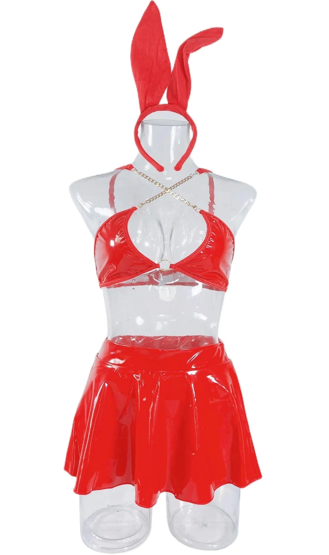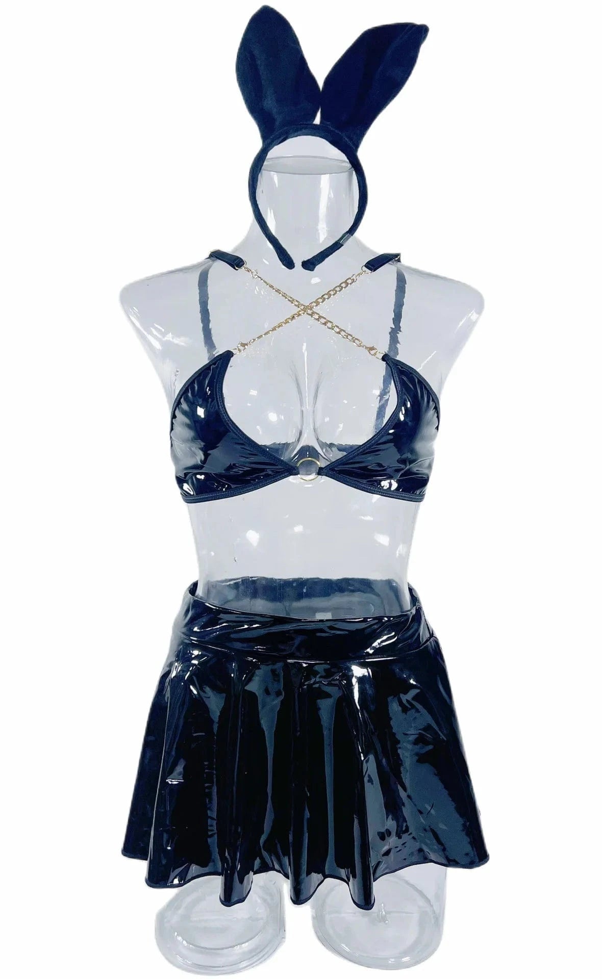 New Arrivals Bra Set Sexy underwear Solid Color PU Leather Uniform Rabbit Ear Headband Sexy Two Piece Set Metal Chain Nightclub