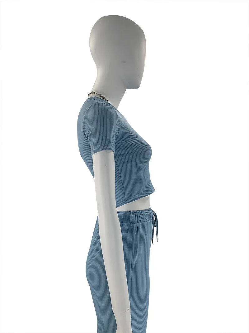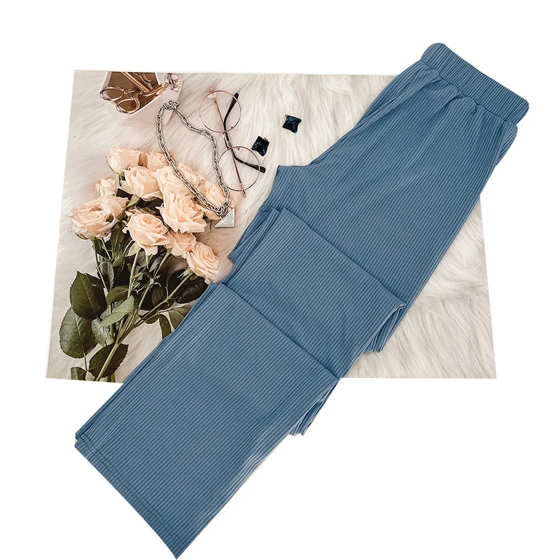 New arrivals casual plain lounge cropped t shirt wide leg pant two piece clothing set ribbed women's pants set 2023