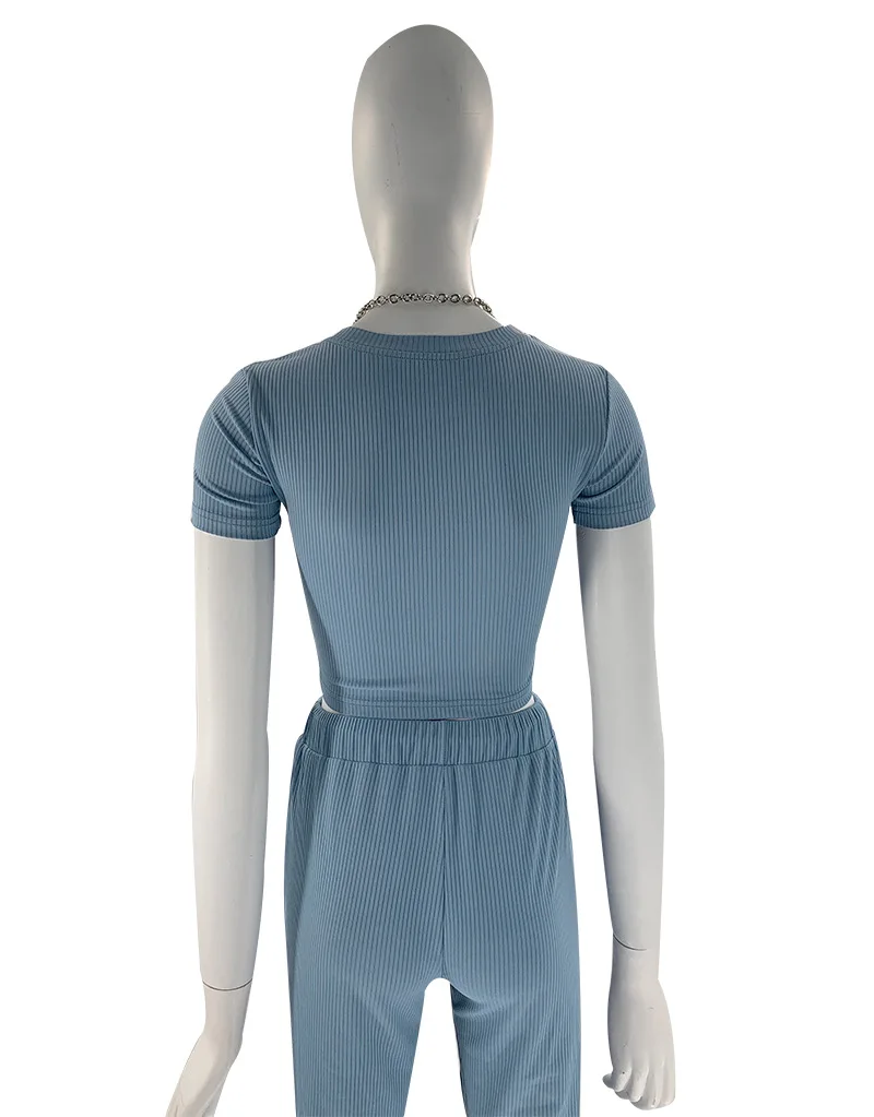 New arrivals casual plain lounge cropped t shirt wide leg pant two piece clothing set ribbed women's pants set 2022