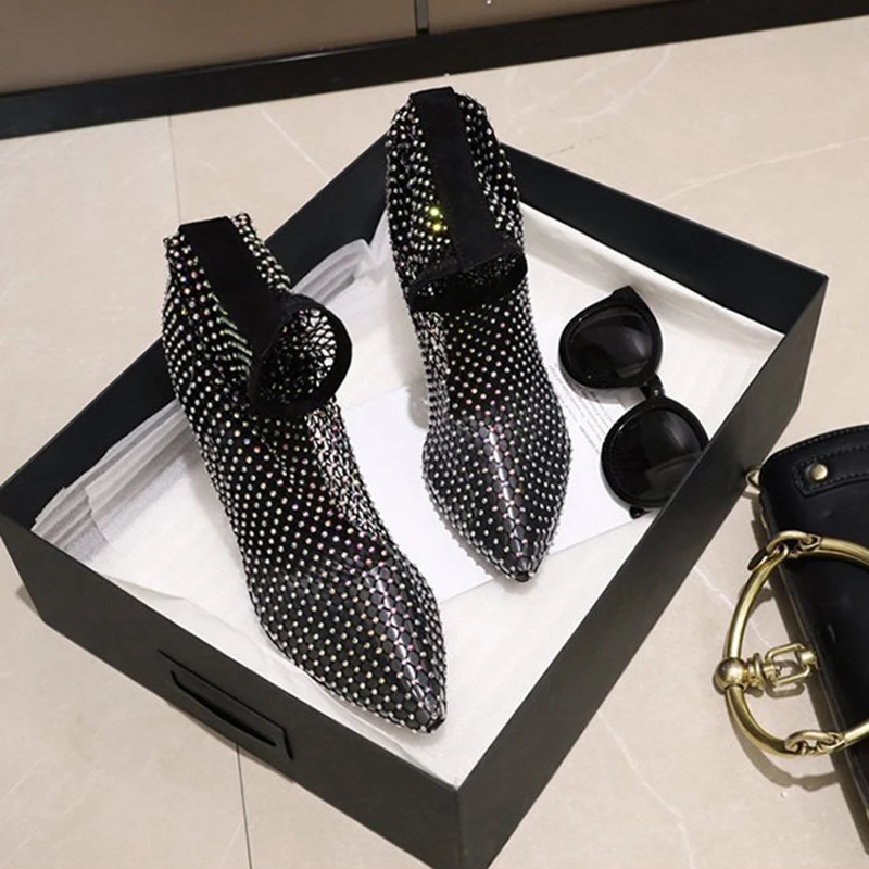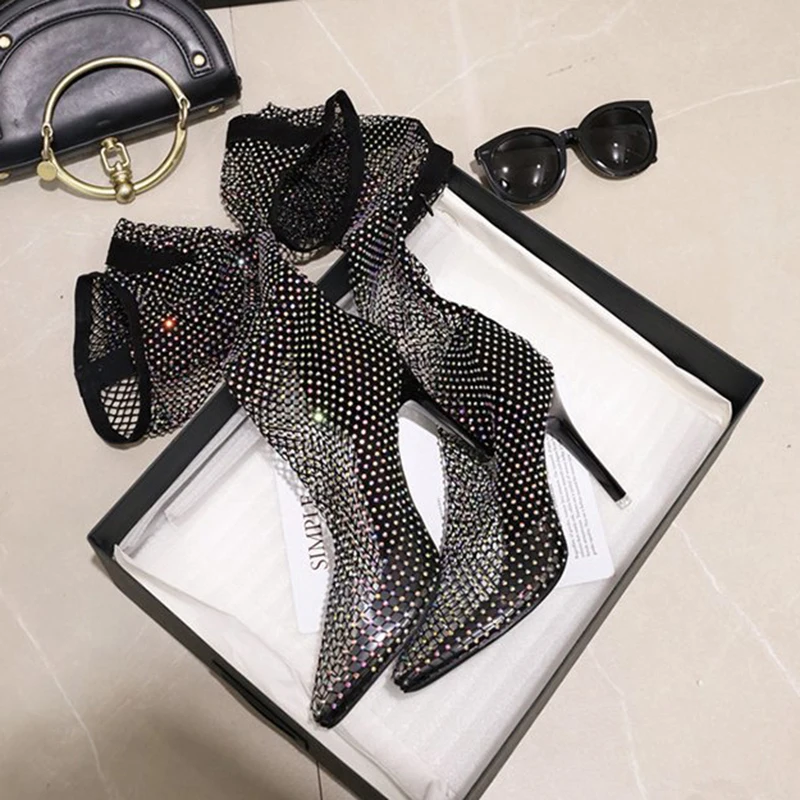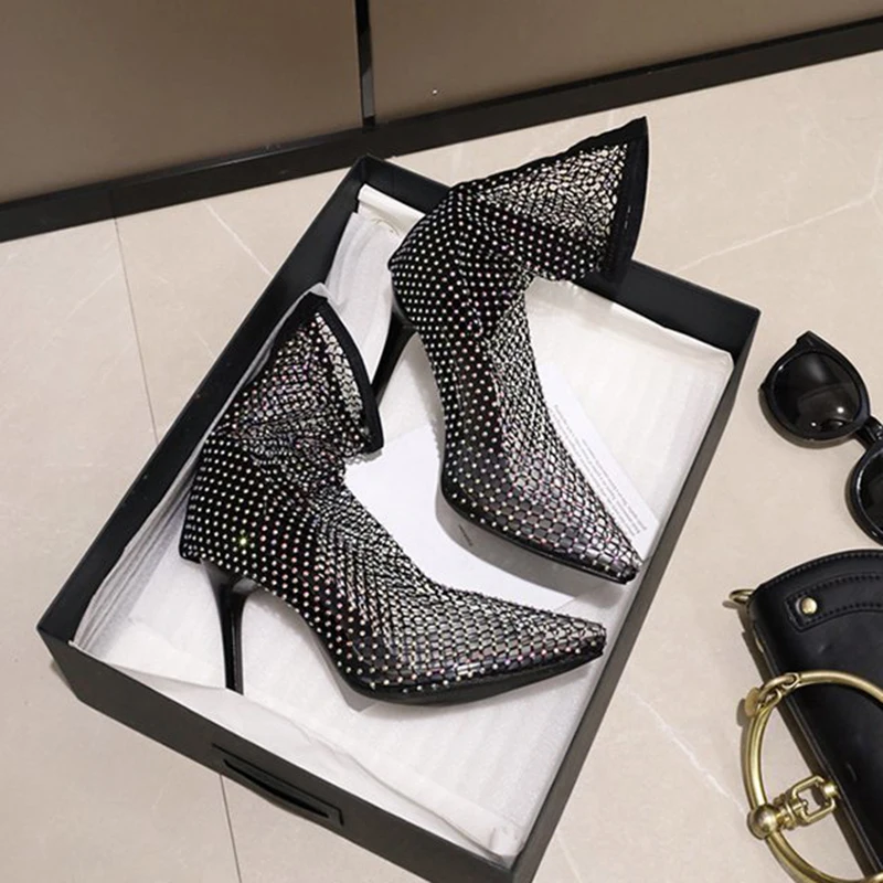 New Fashion Women 2022 Mesh Upper Sandals Short Boots HIgh Heels Lady Summer Shoes shinny Party Pumps Pointed Toe Sexy Diamonds