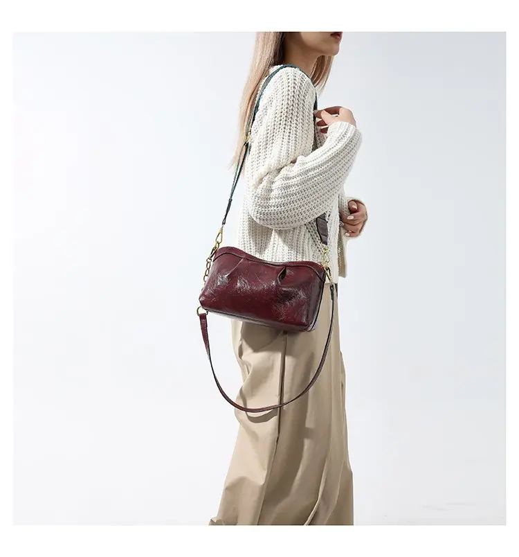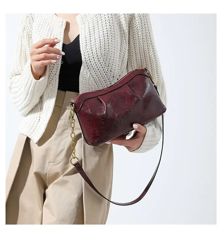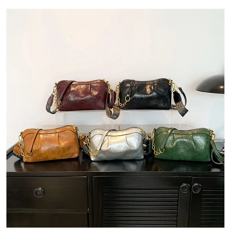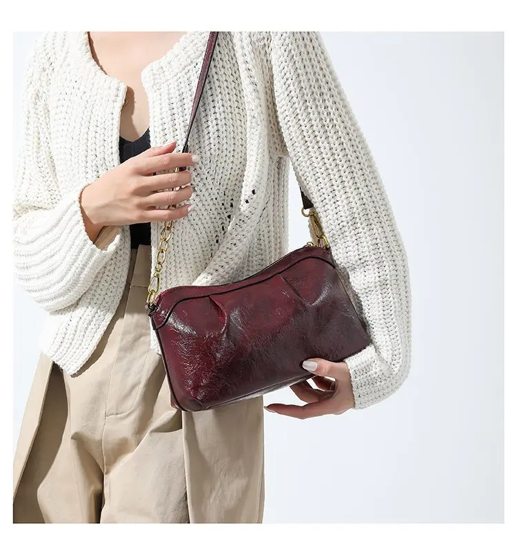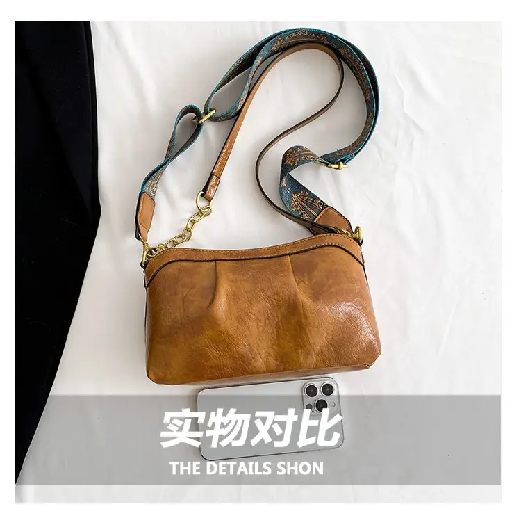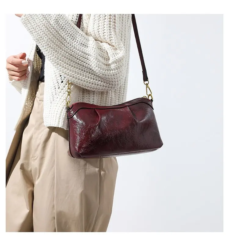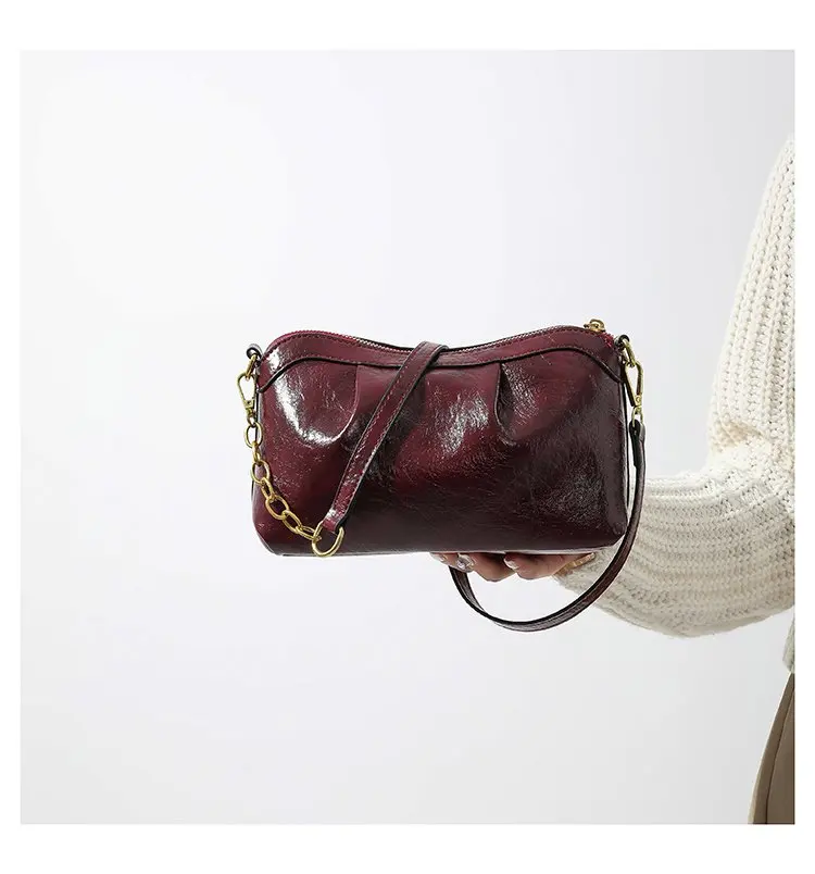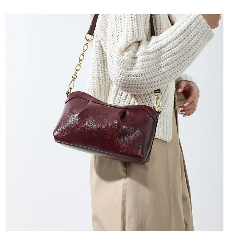 Oil Wax PU Leather Cross Body Small Bag for Women Fashionable and Versatile Shoulder Ruched Hand Bag Ladies Casual Phone Bag