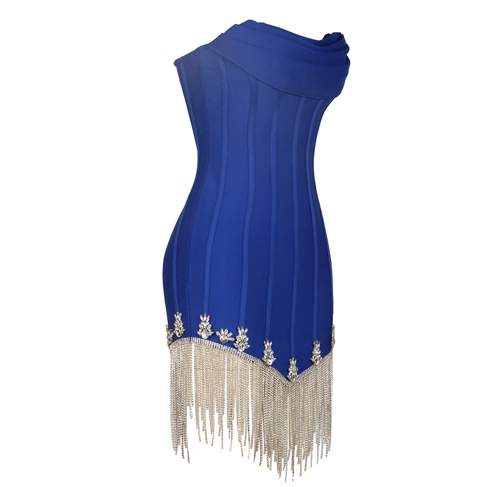 OUDINA 2024 Women's Clothing Rhinestones Silver Jewelry Tassel Chain Knitted Tube Top Pleated Backless Bandage Dress Woman