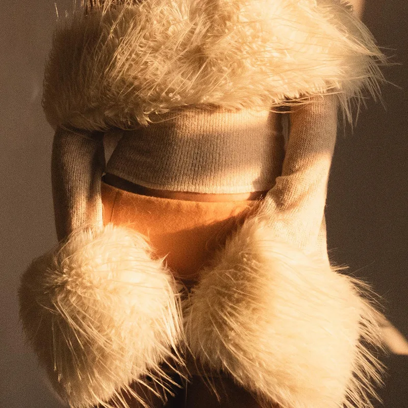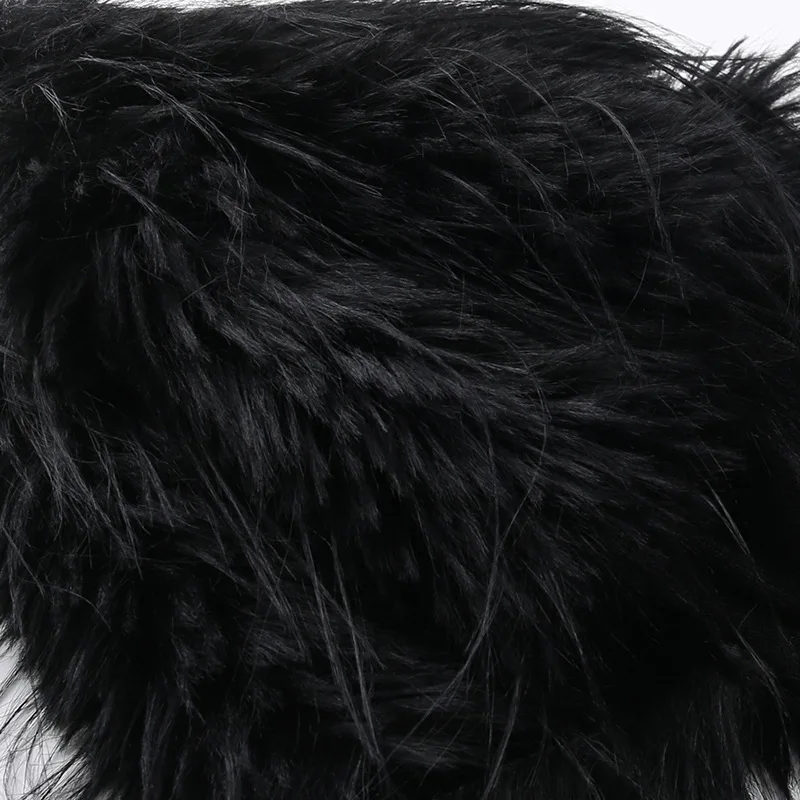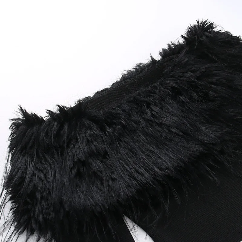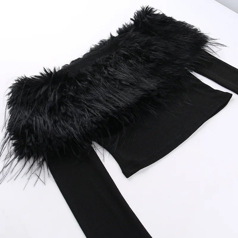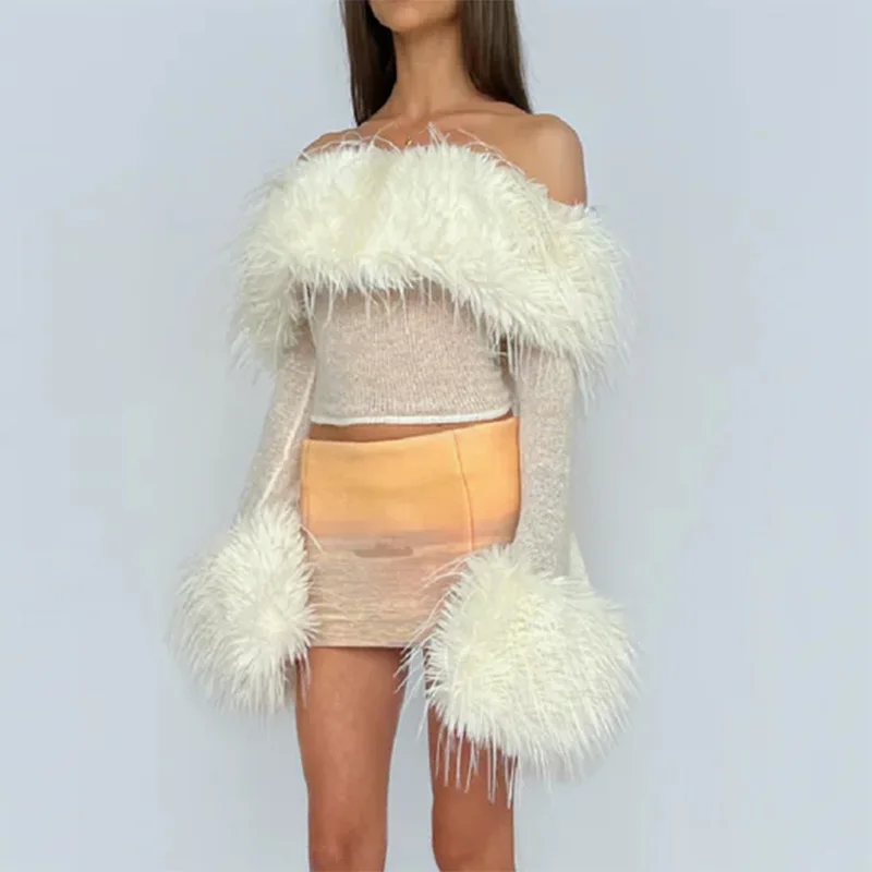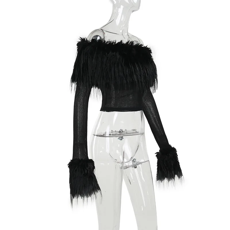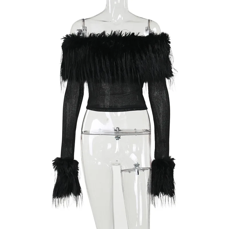 OUDINA Fashion Women's Clothing Tops Long Sleeve One Shoulder Faux Fur See Through Top Crop Tops For Women