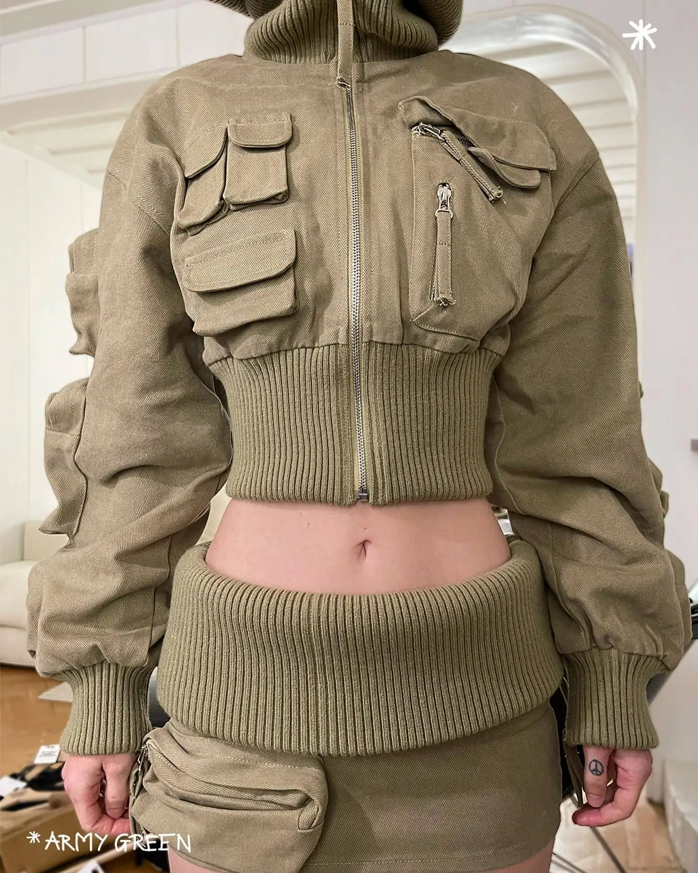 OUDINA New Arrivals Zipper Cargo Jacket Mini Skirt Two Pieces Sets Women Clothing 2 Piece Set Women's Sets