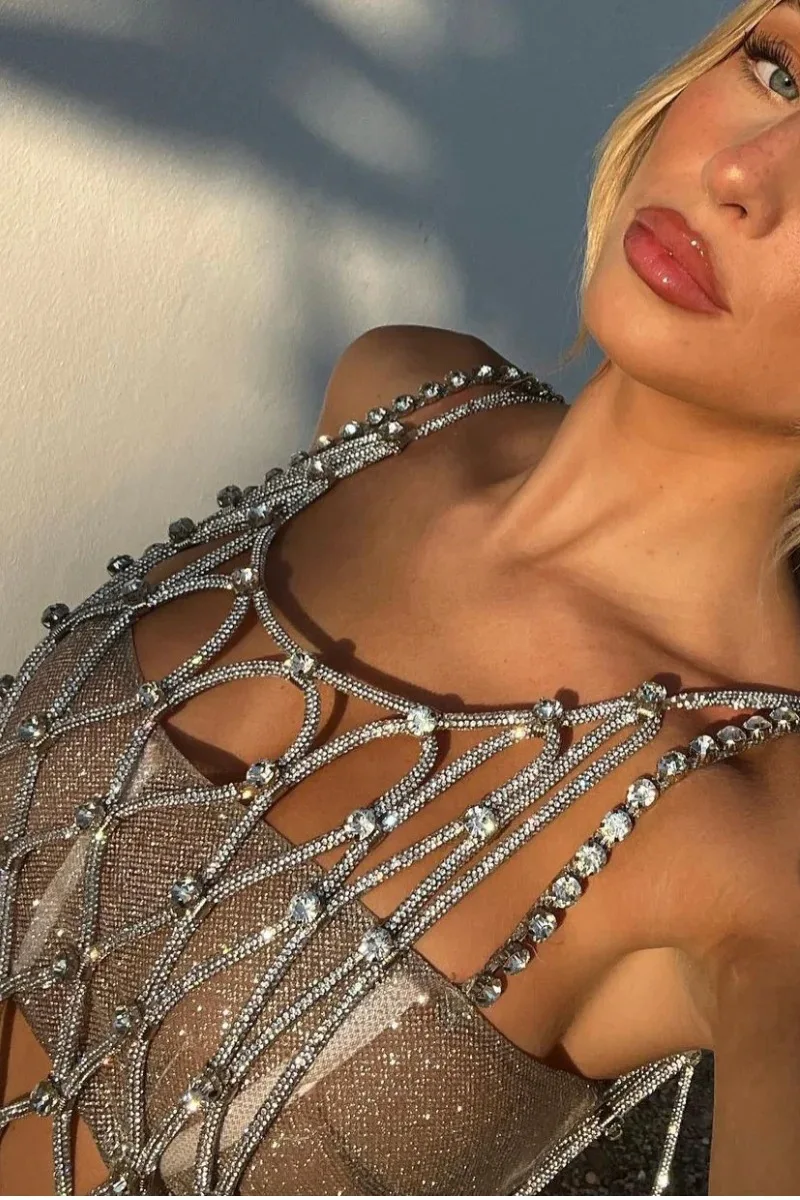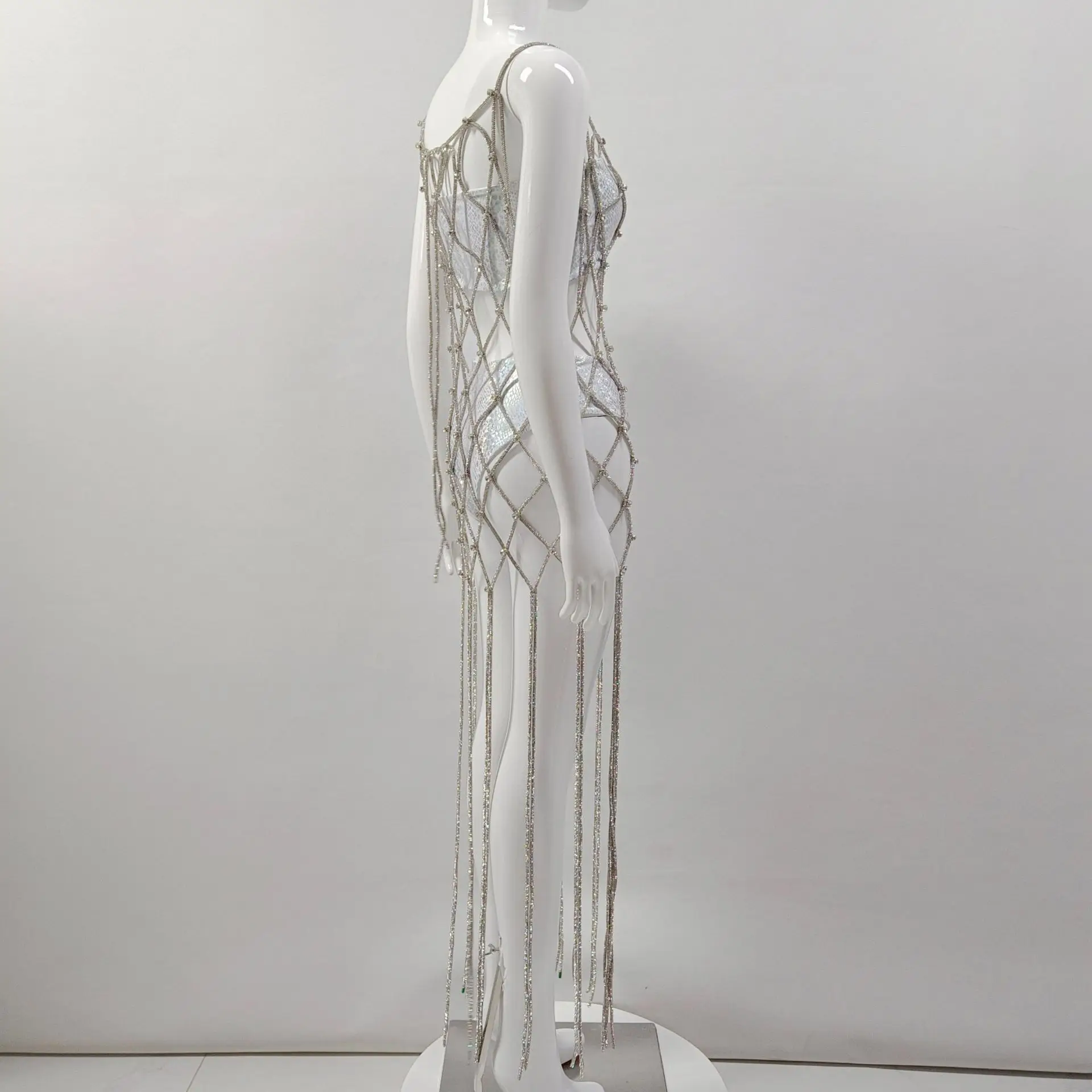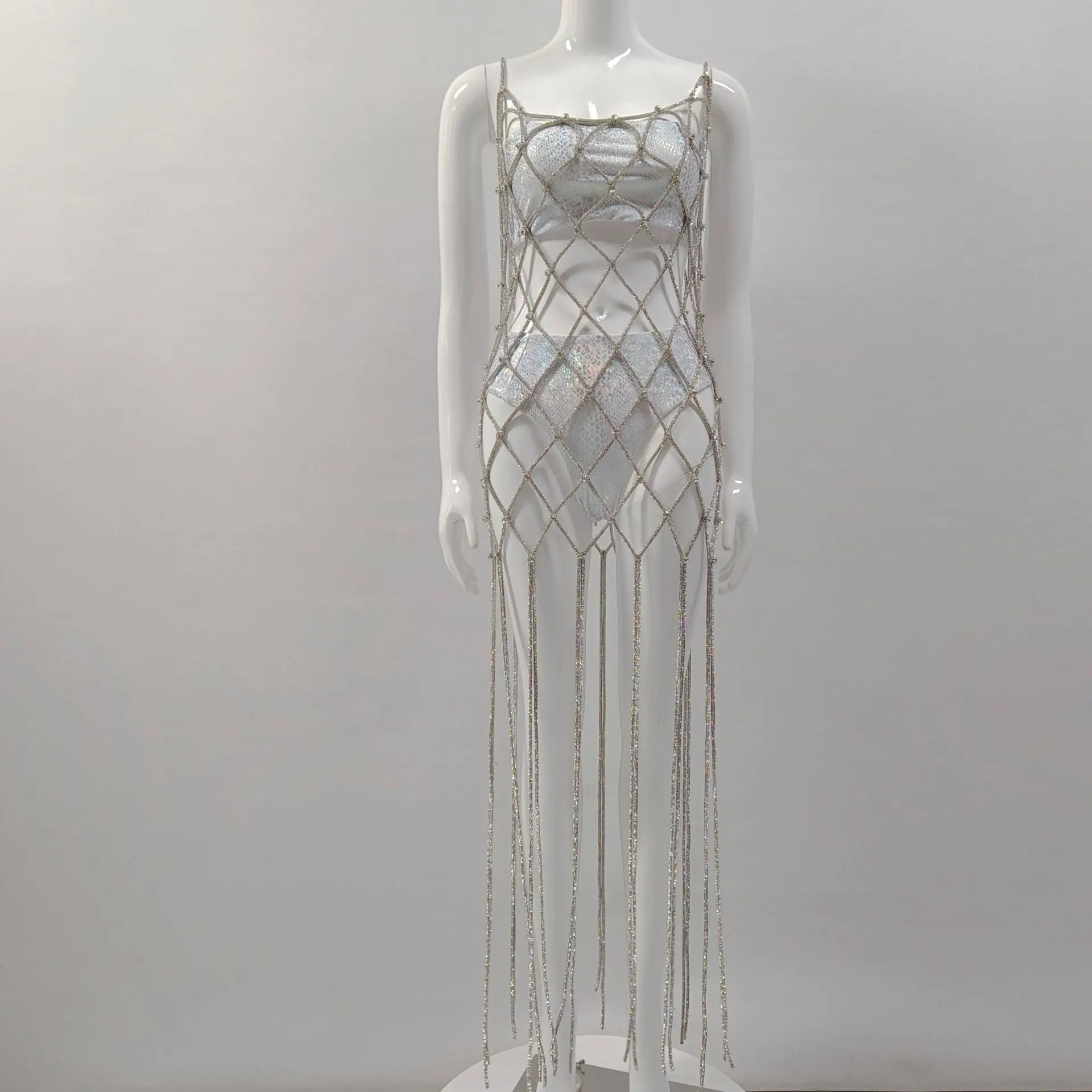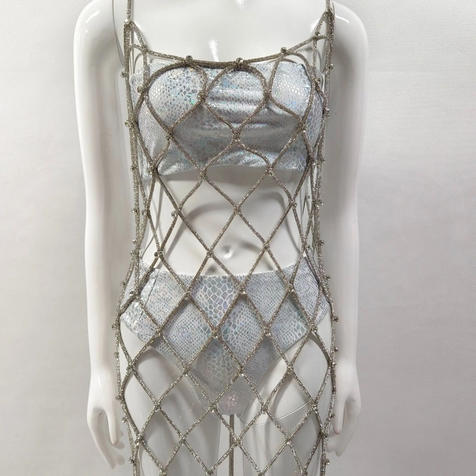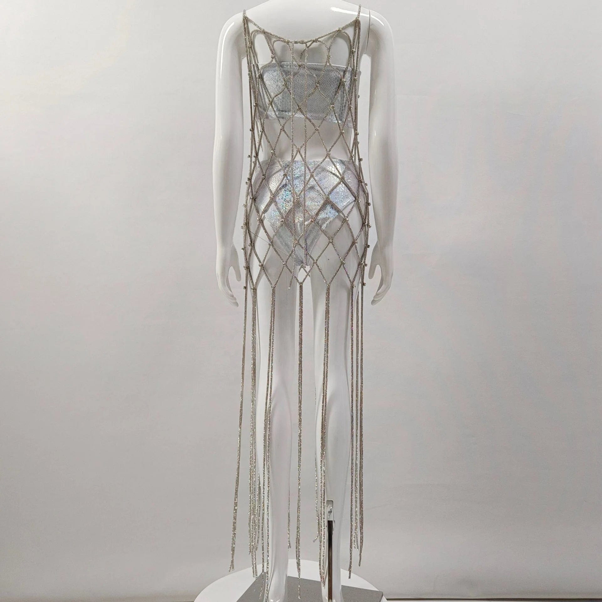 OUDINA Popular Rhinestone Mesh Hollow Tassel Body Chain Dress Crop Tops Shorts 3 Piece Set Women's Clothing Sets For Women