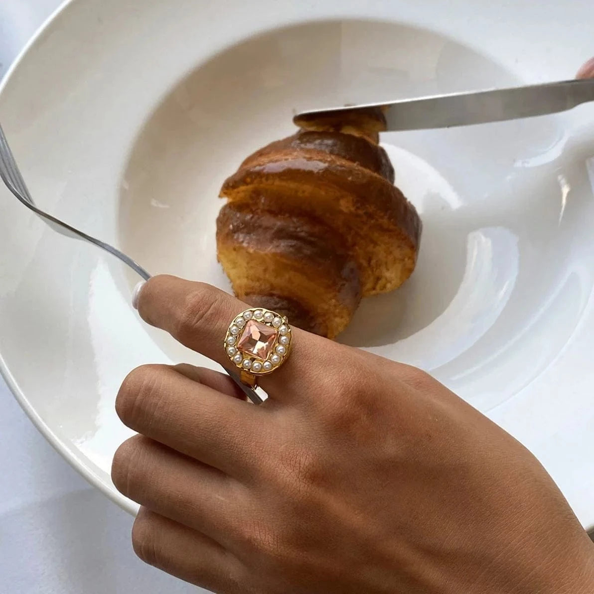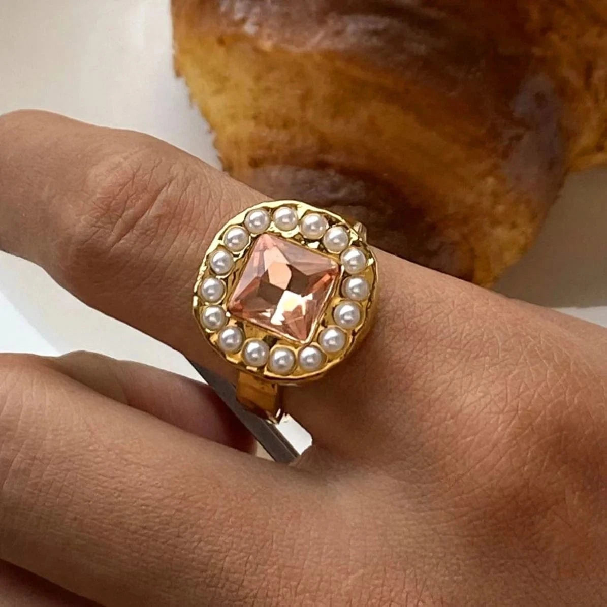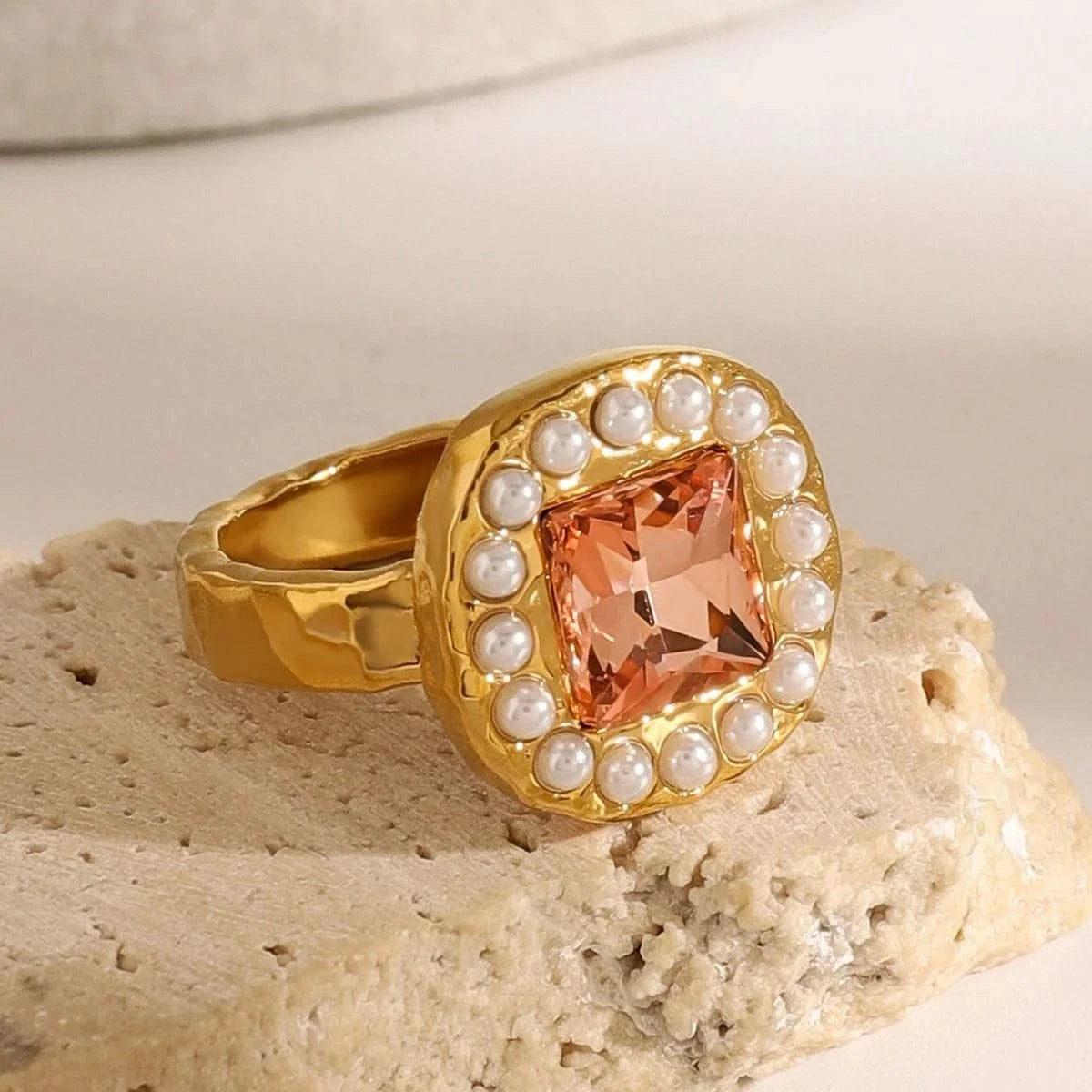 R2474 Rhinestone Pearl/Hammer Pink Rhinestone Ring with Sticky Pearl 18K PVD Gold Plated Stainless Steel Ring