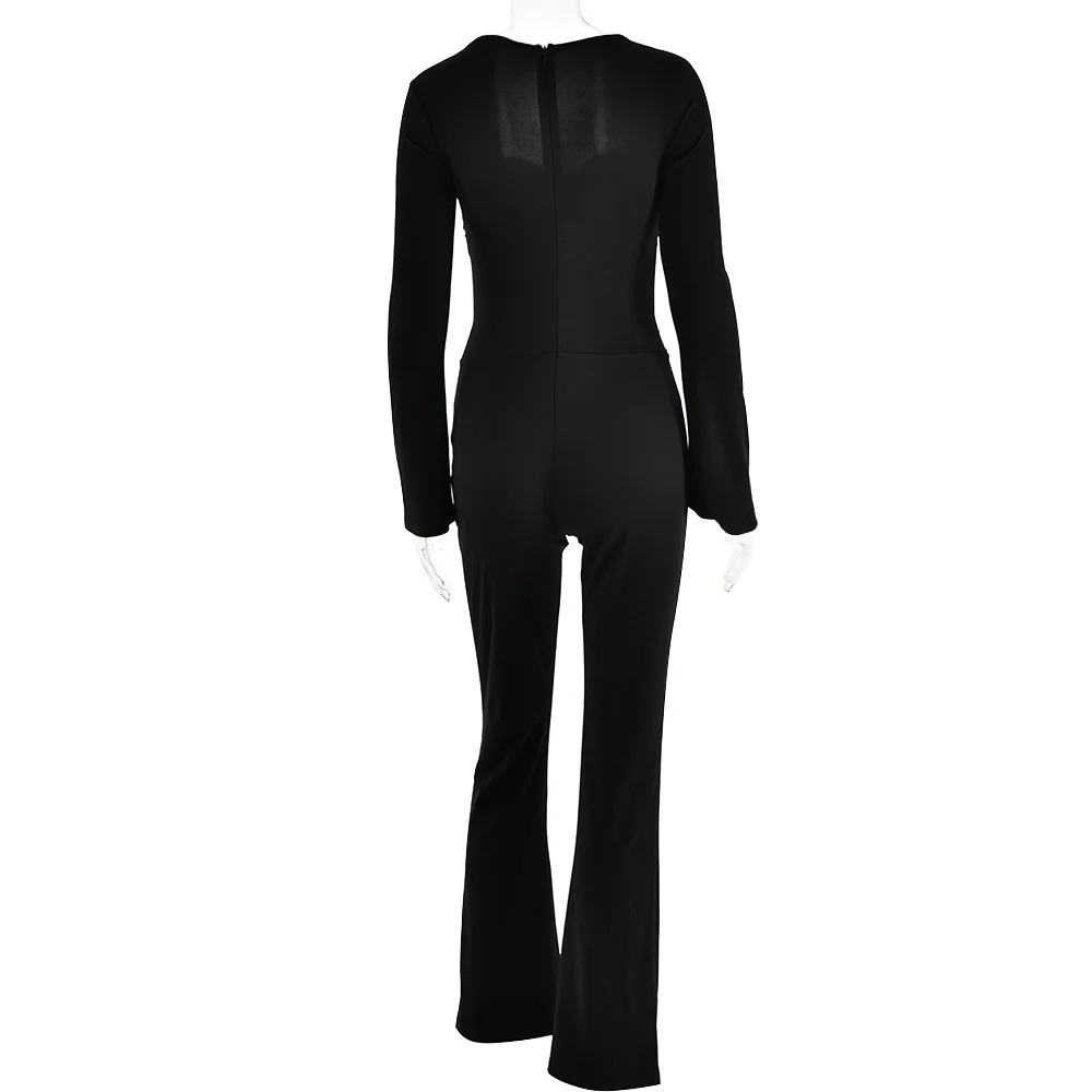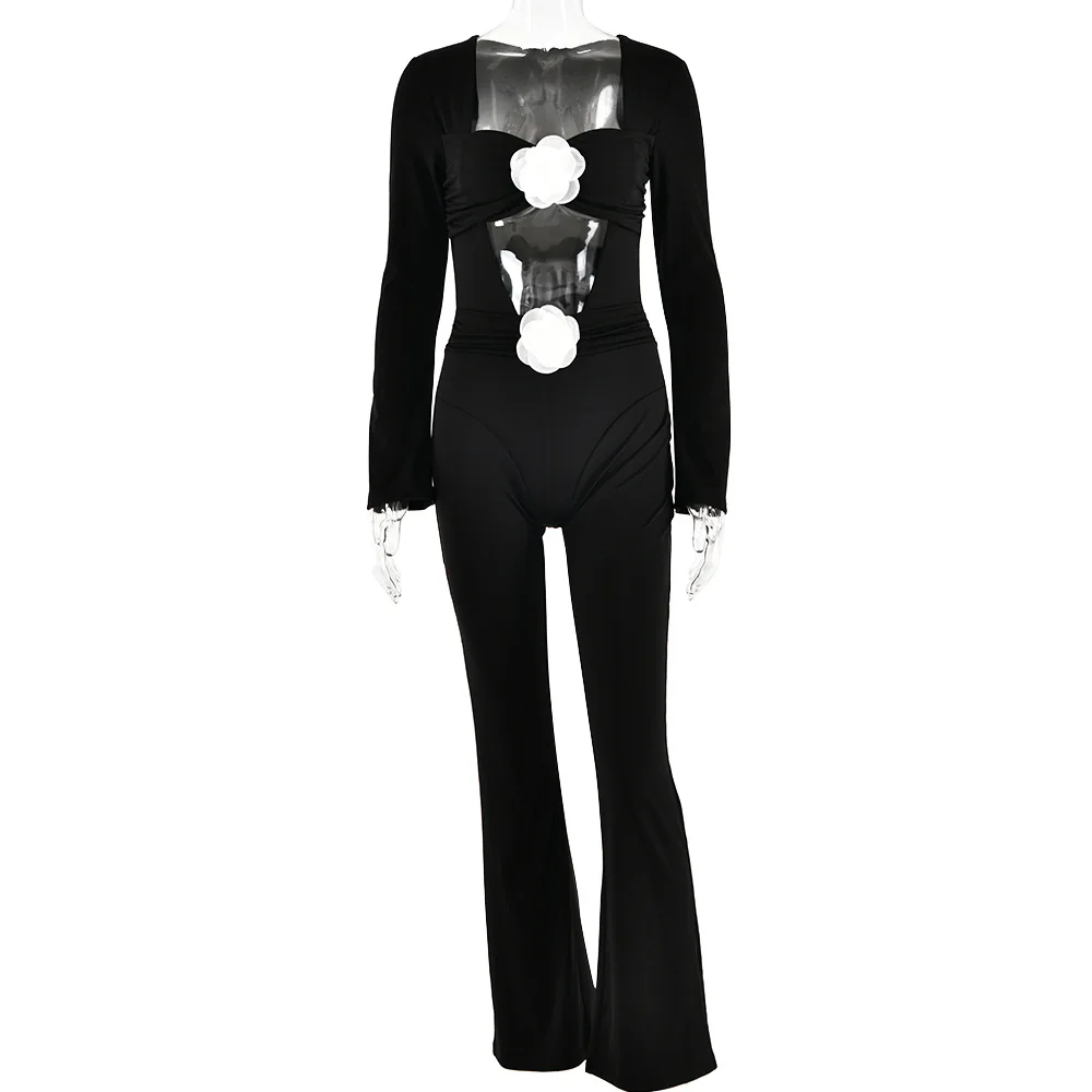 RedPeony Women's Sexy Hollow Slim Bell Bottoms Solid Flowers Decorate High-waisted Women Clothing Long Sleeve Jumpsuit
