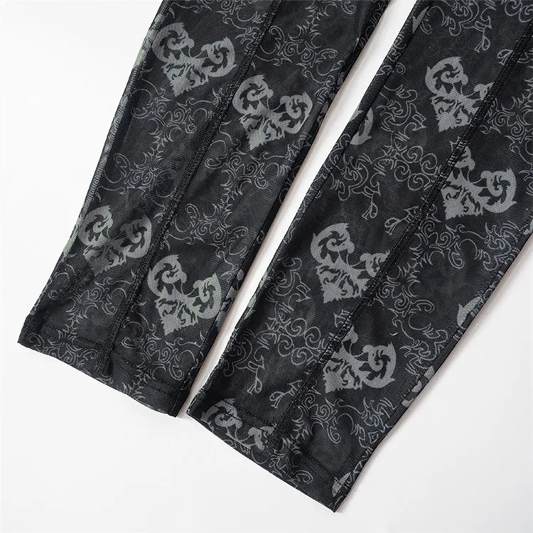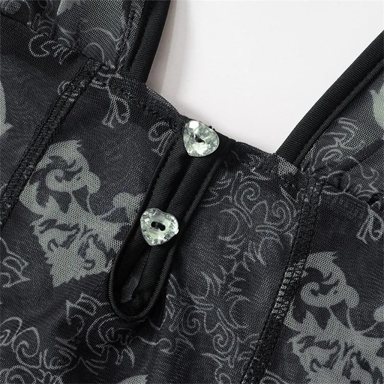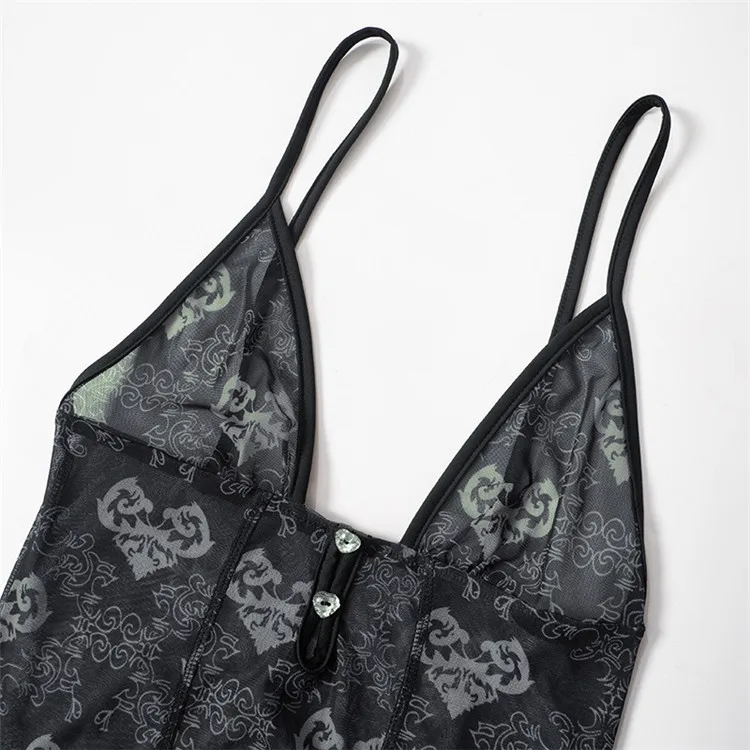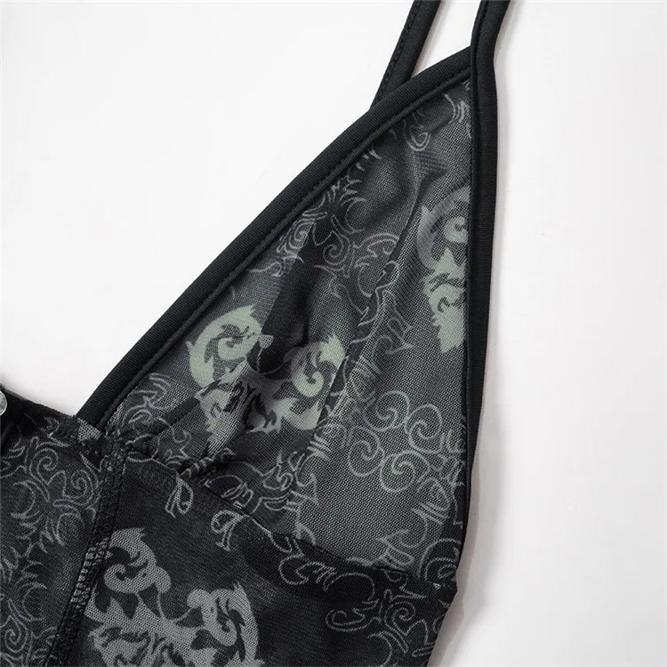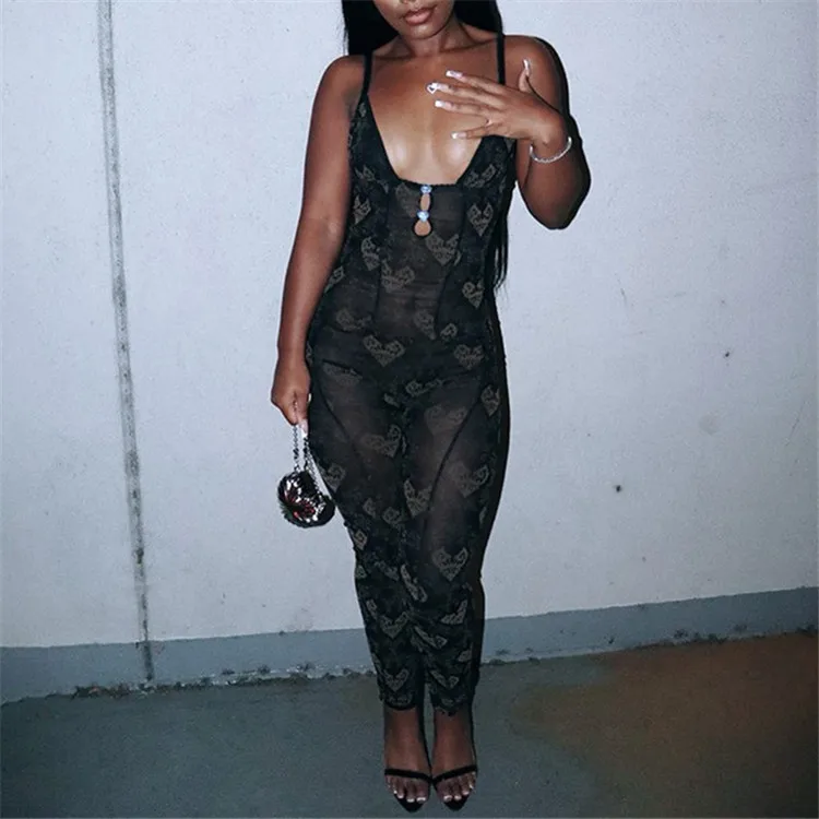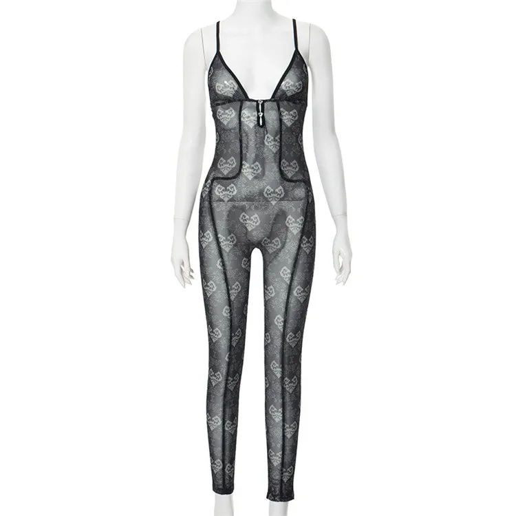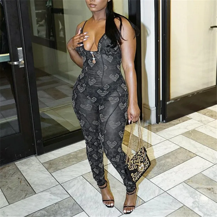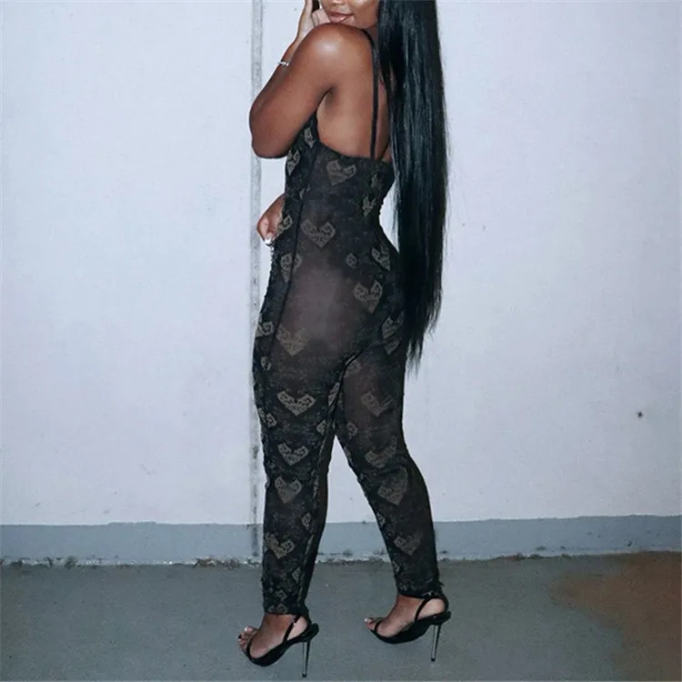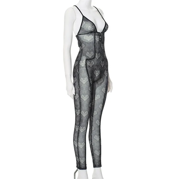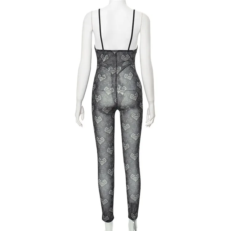 Sexy Hollow Out Mesh Print Women See Through Jumpsuit Sleeveless Thin One Piece Female Inside Midnight Clothing