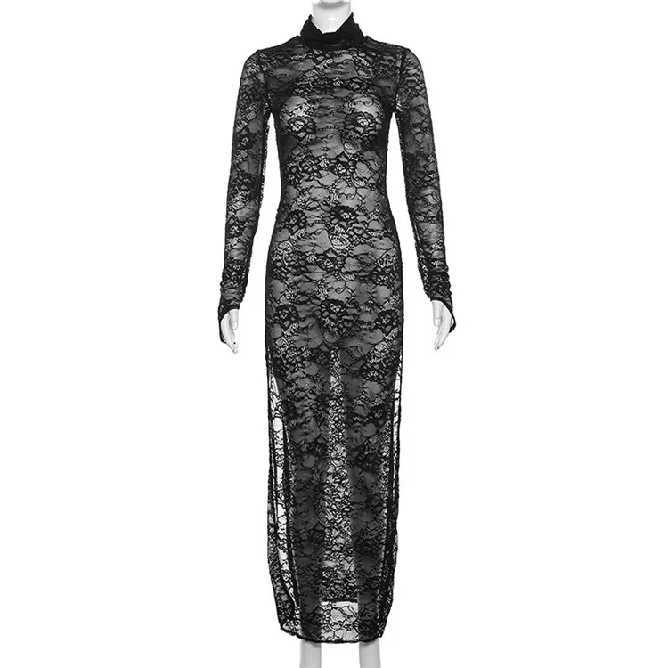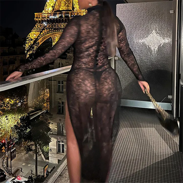 Sexy Lace Black Hook Flower Hollow Out Long Dress Night Club Clothing For Woman 2024 Mesh Maxi Dress