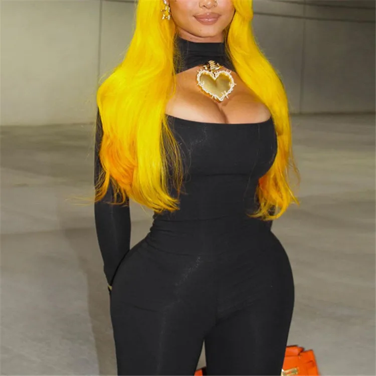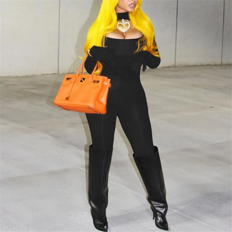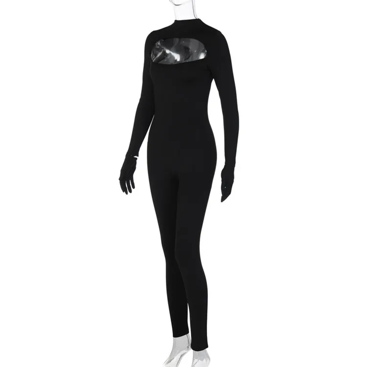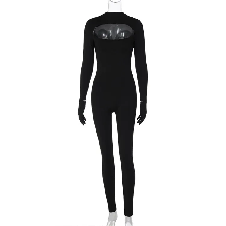 Solid Turtleneck Long Sleeve Hollow Out Gloves Sexy Bodycon Jumpsuit 2024 Fall Spring Women Romper