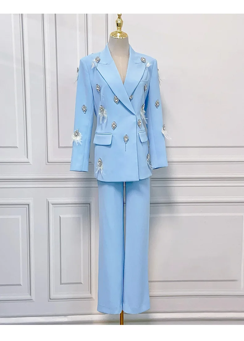 SR2269 High Quality Spring Women Clothing Feather Clothing Suits Women Lady Elegant Rhinestone Crystal Set