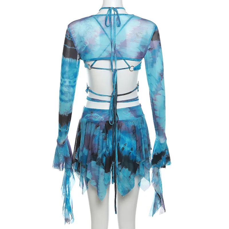 Streetwear Clothing Y2K Fashion Sexy Club Three Piece Skirt Set Tie Dye Mesh Women's Set